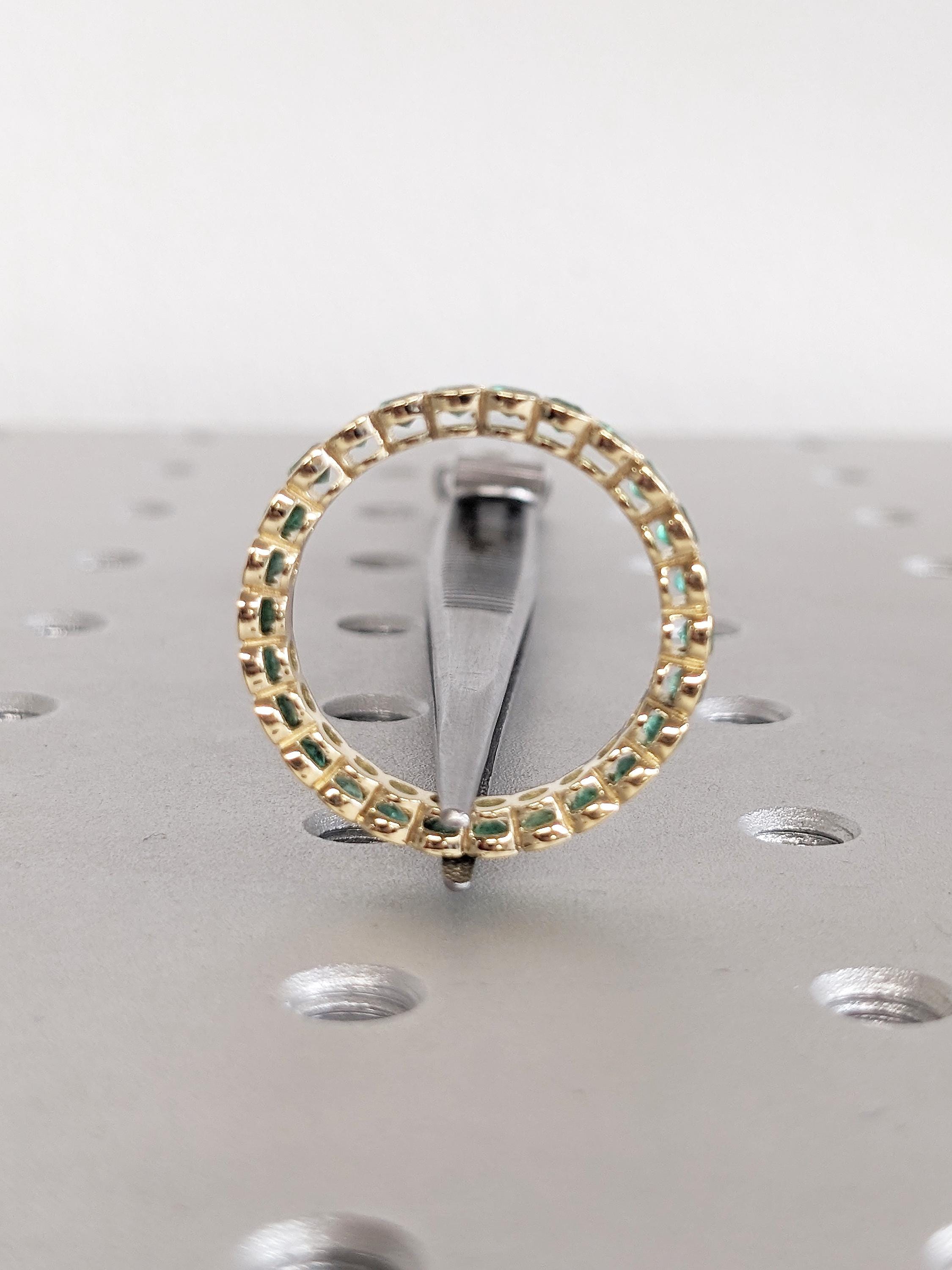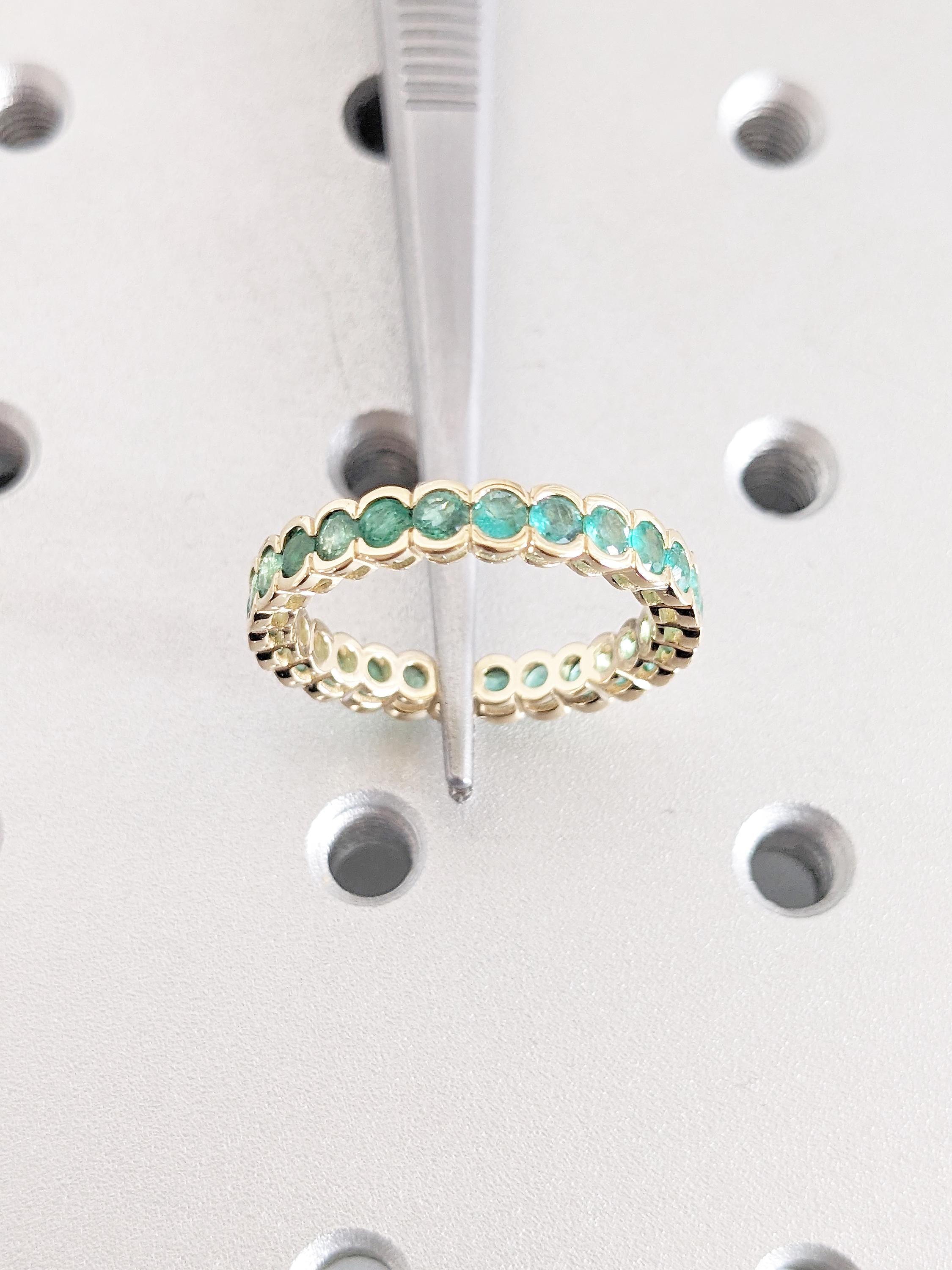 This exquisite Emerald eternity ring showcases a captivating row of round green emeralds, each securely nestled in a sleek bezel setting. Perfect as a wedding band, anniversary ring, or a timeless statement piece, this design blends durability with luxurious charm, making it a treasure to wear for a lifetime.