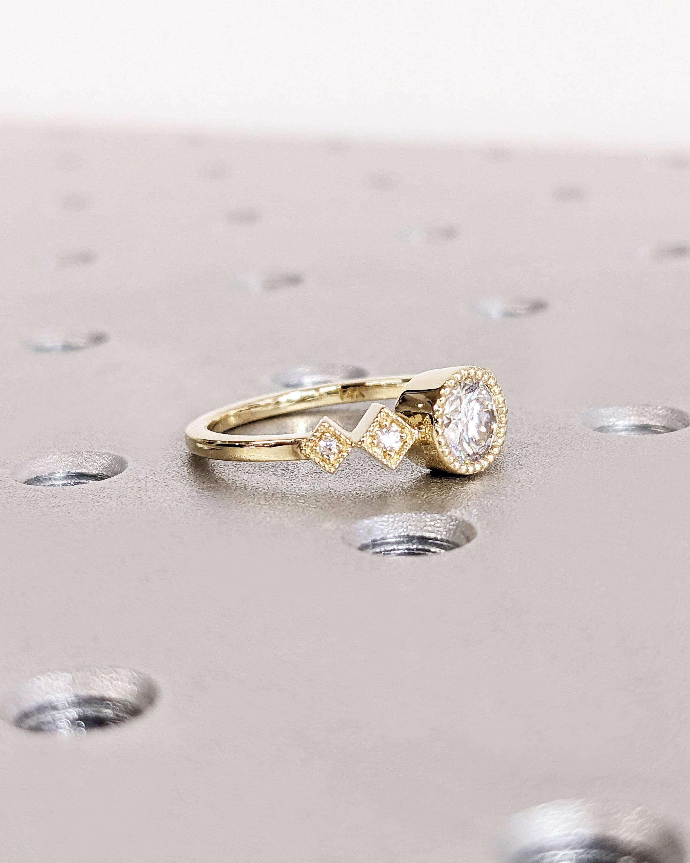 Designed for the alternative bride, this engagement ring combines vintage charm with contemporary style. The centerpiece of this five-stone ring is a dazzling round-cut Moissanite, securely held in a round bezel setting with exquisite milgrain detail. The band is adorned with four round-cut side stones, also bezel-set with matching milgrain detailing. Choose from natural diamonds, lab diamonds, or moissanites for the side stones. This design is a beautiful harmony of shapes, making it an exceptional choice for a modern yet timeless engagement ring.