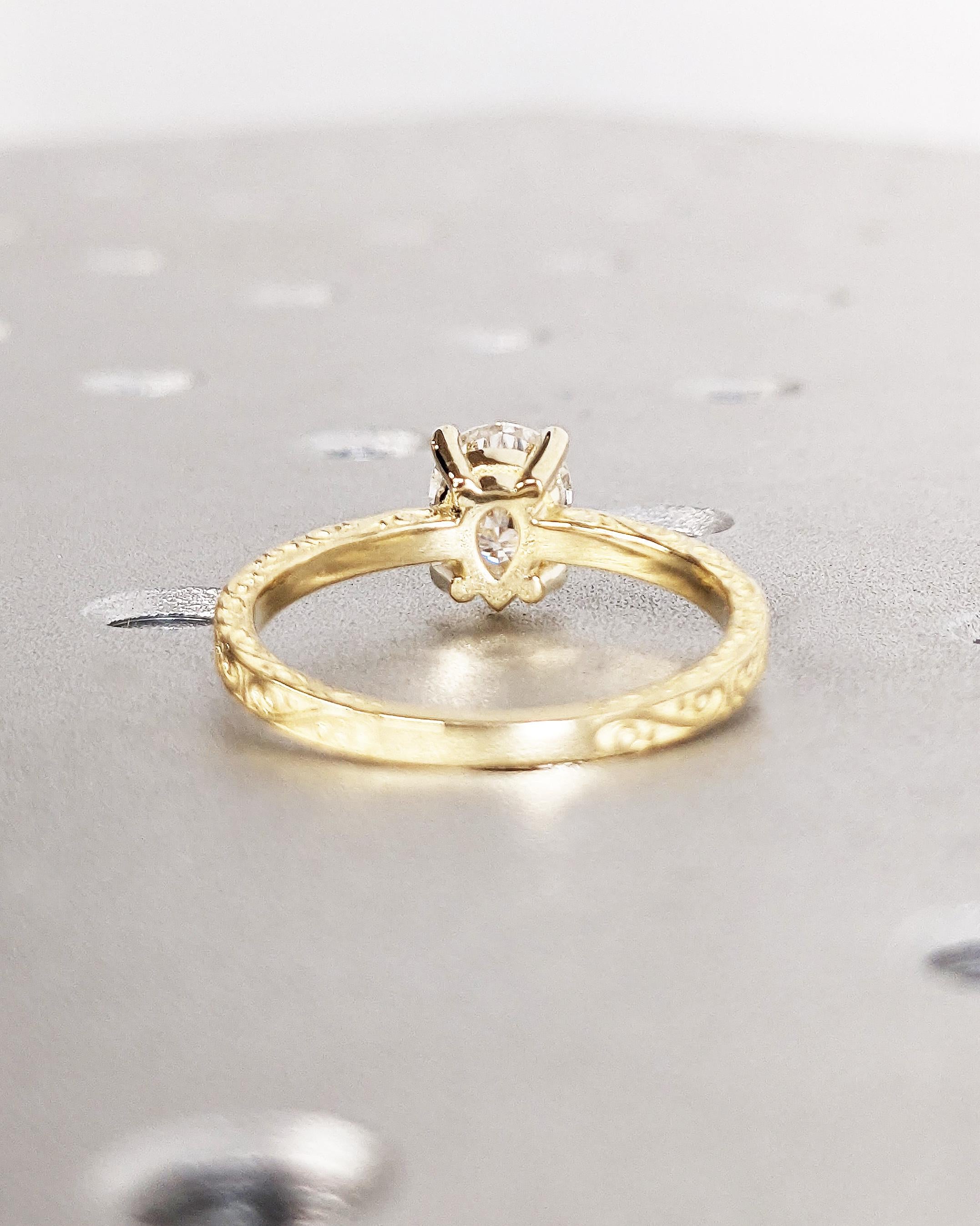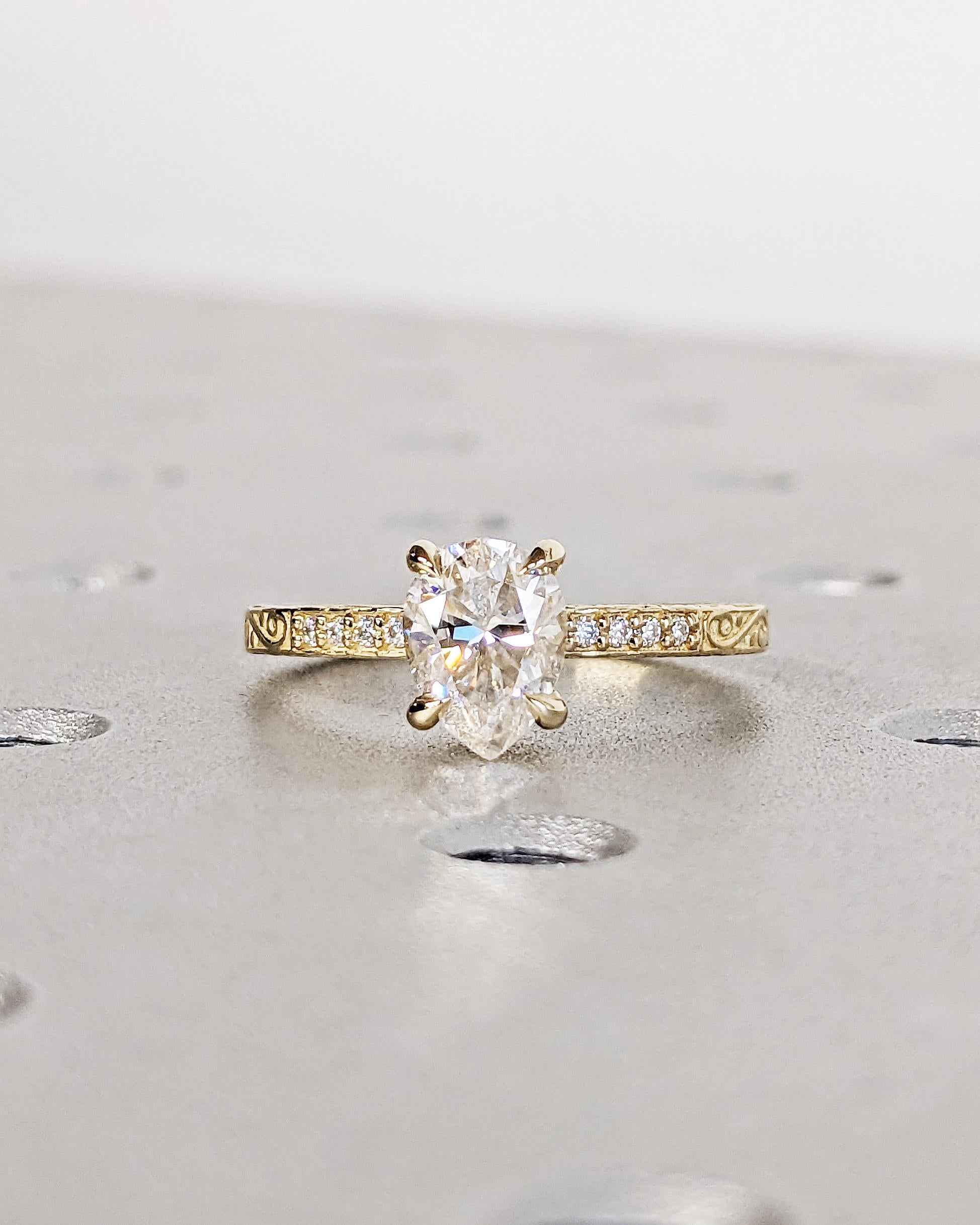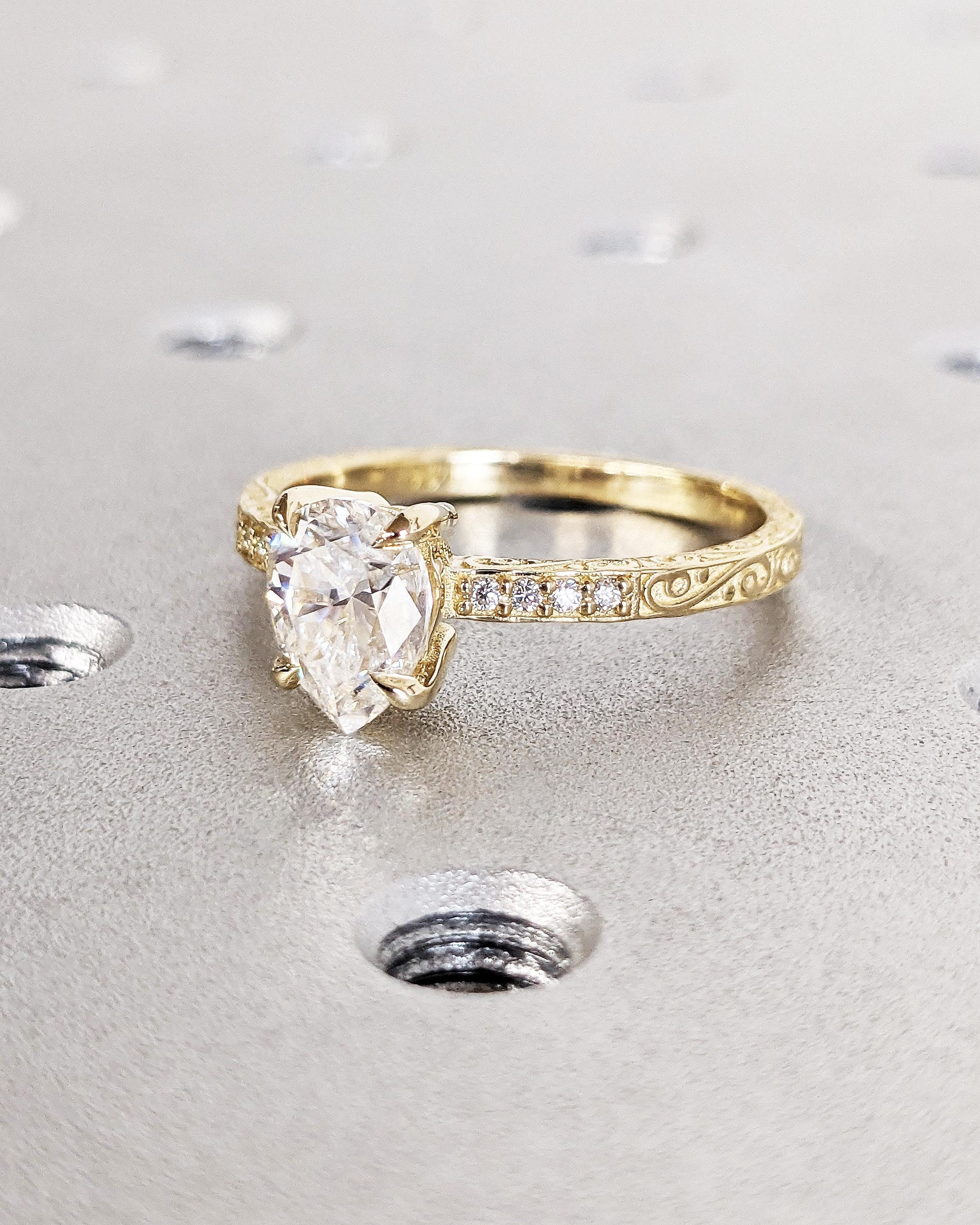 Vintage Engagement Ring, 14K Gold, Hand Engraved Ring, Pear Lab Diamond Engagement Ring, Vintage Ring, Hand Engraving Art Deco, Minimalistic