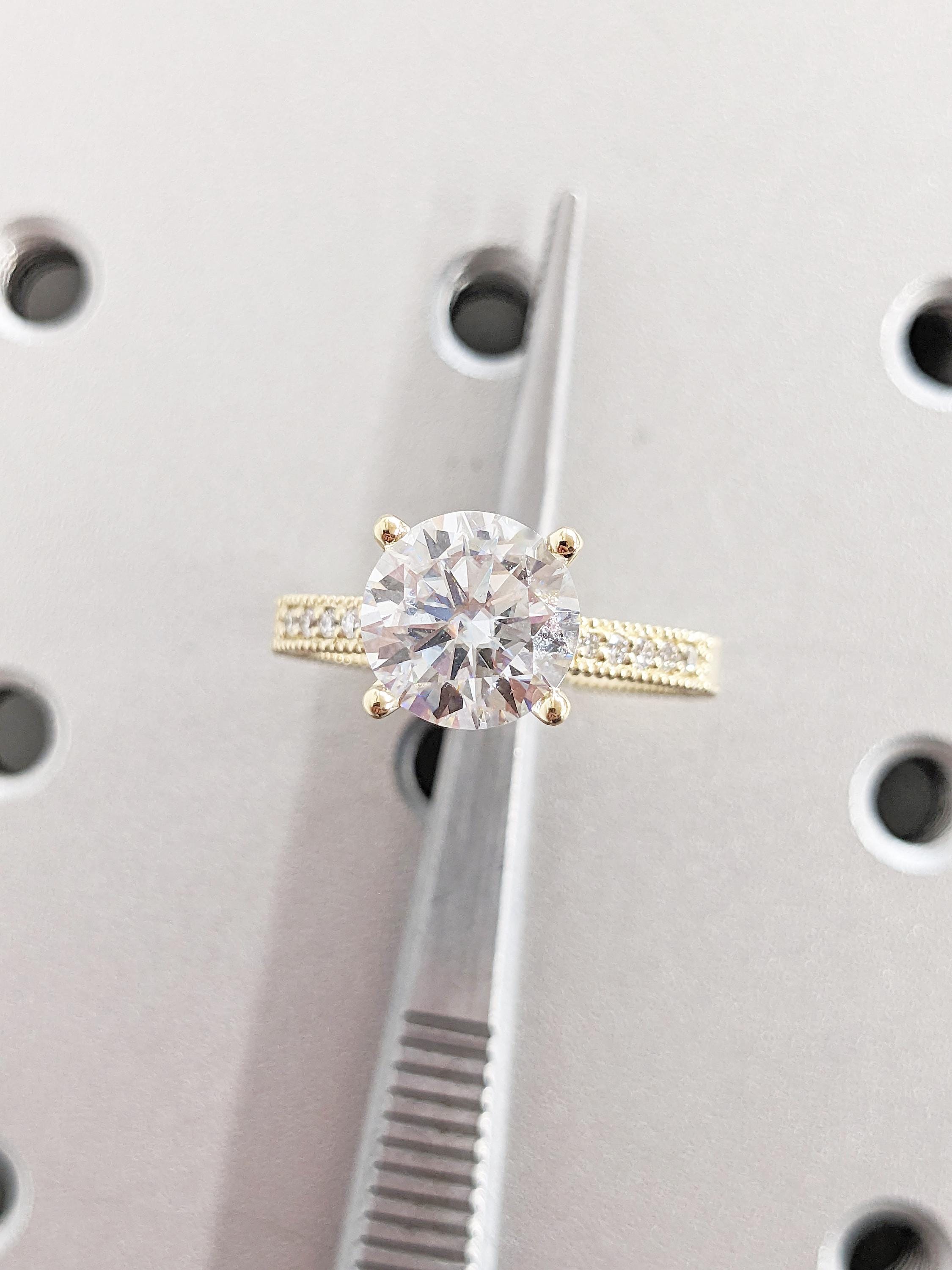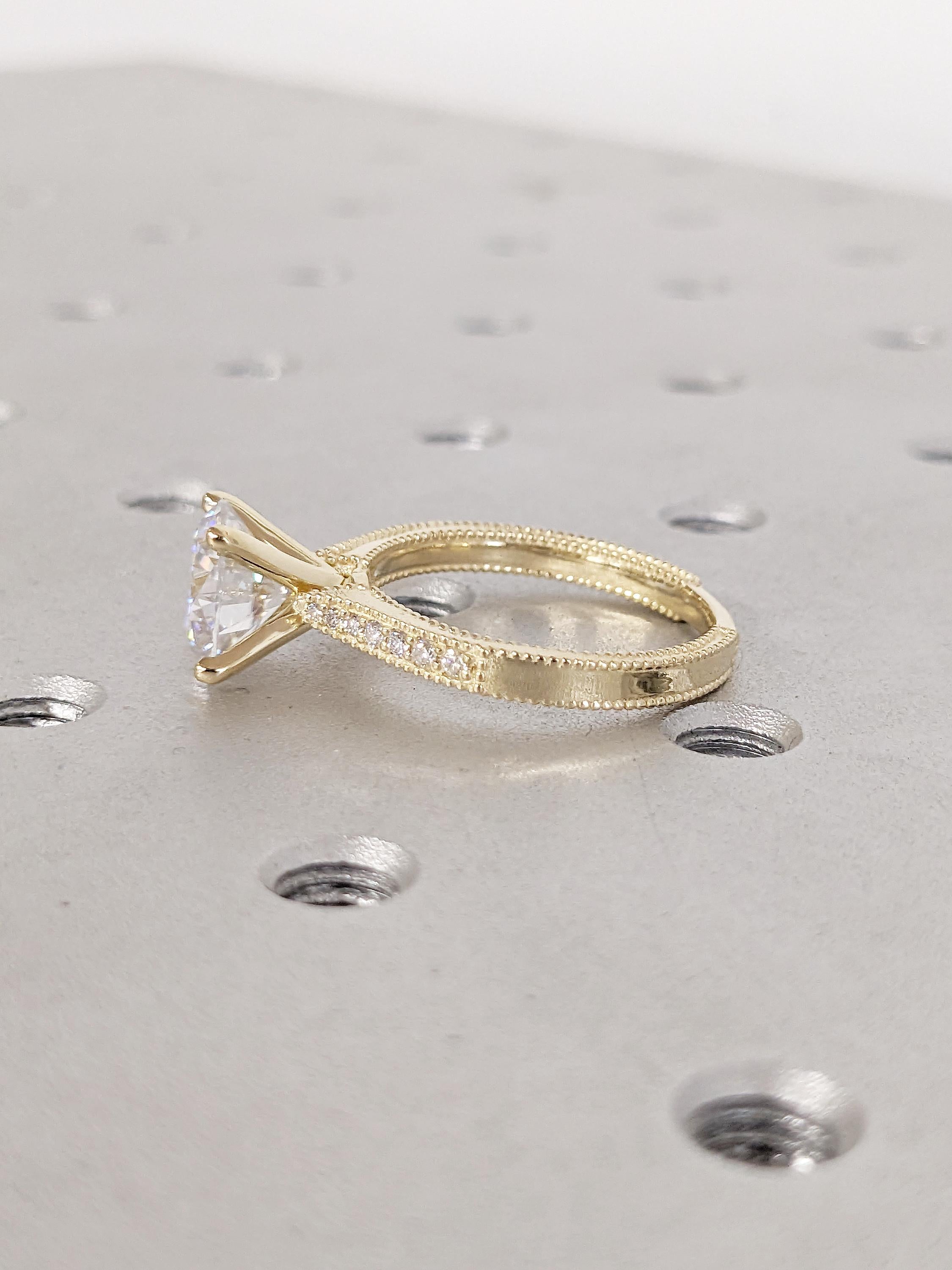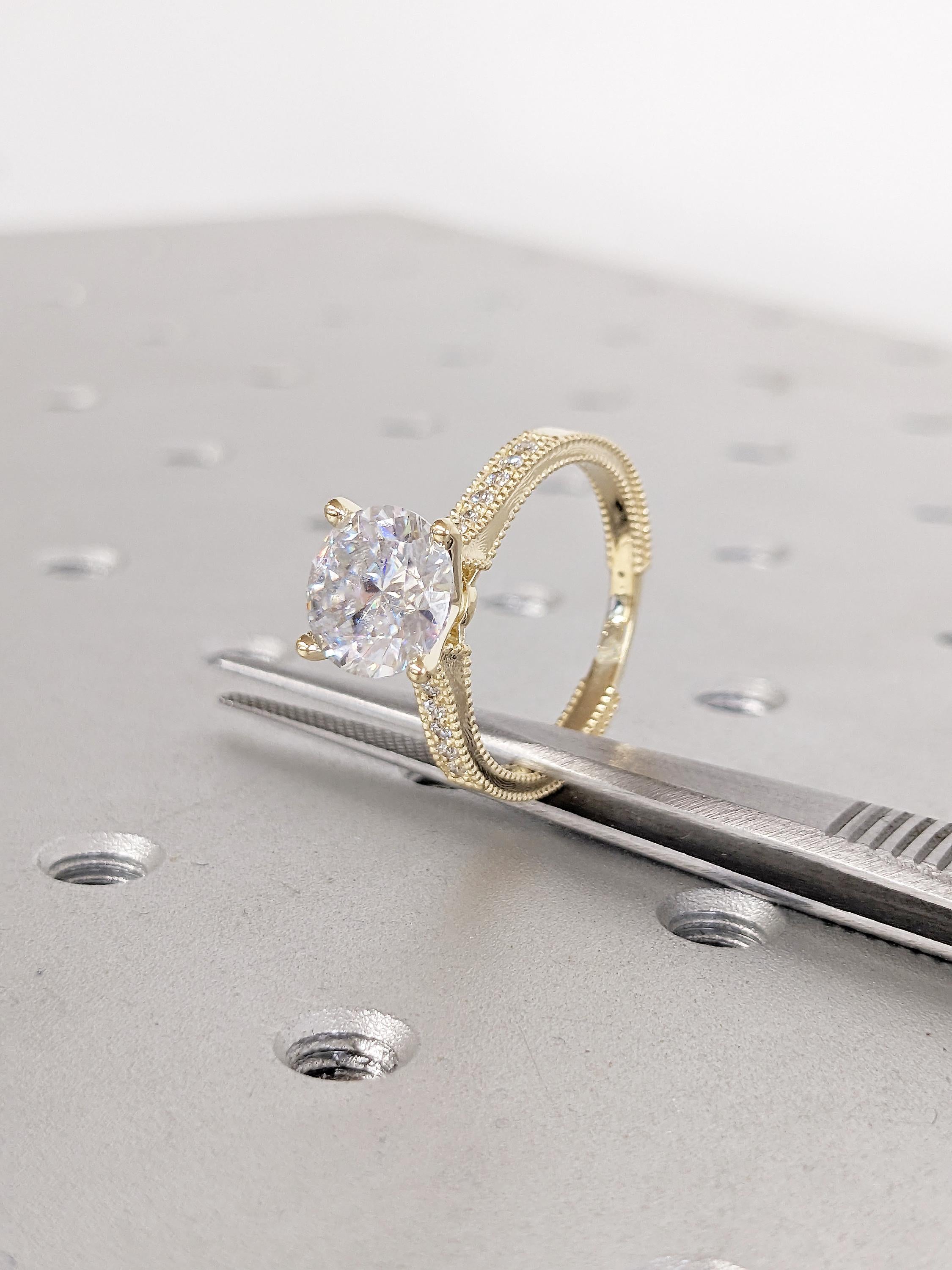 Celebrate timeless elegance with this stunning engagement ring featuring a round cut Moissanite at its center. The band is adorned with round pave-set accents, available in Natural Diamonds, Lab Grown Diamonds, or Moissanites, adding a graceful shimmer to each side. Intricate milgrain detailing along the edges of the band lends a vintage-inspired charm, making this piece a perfect blend of classic sophistication and modern brilliance.