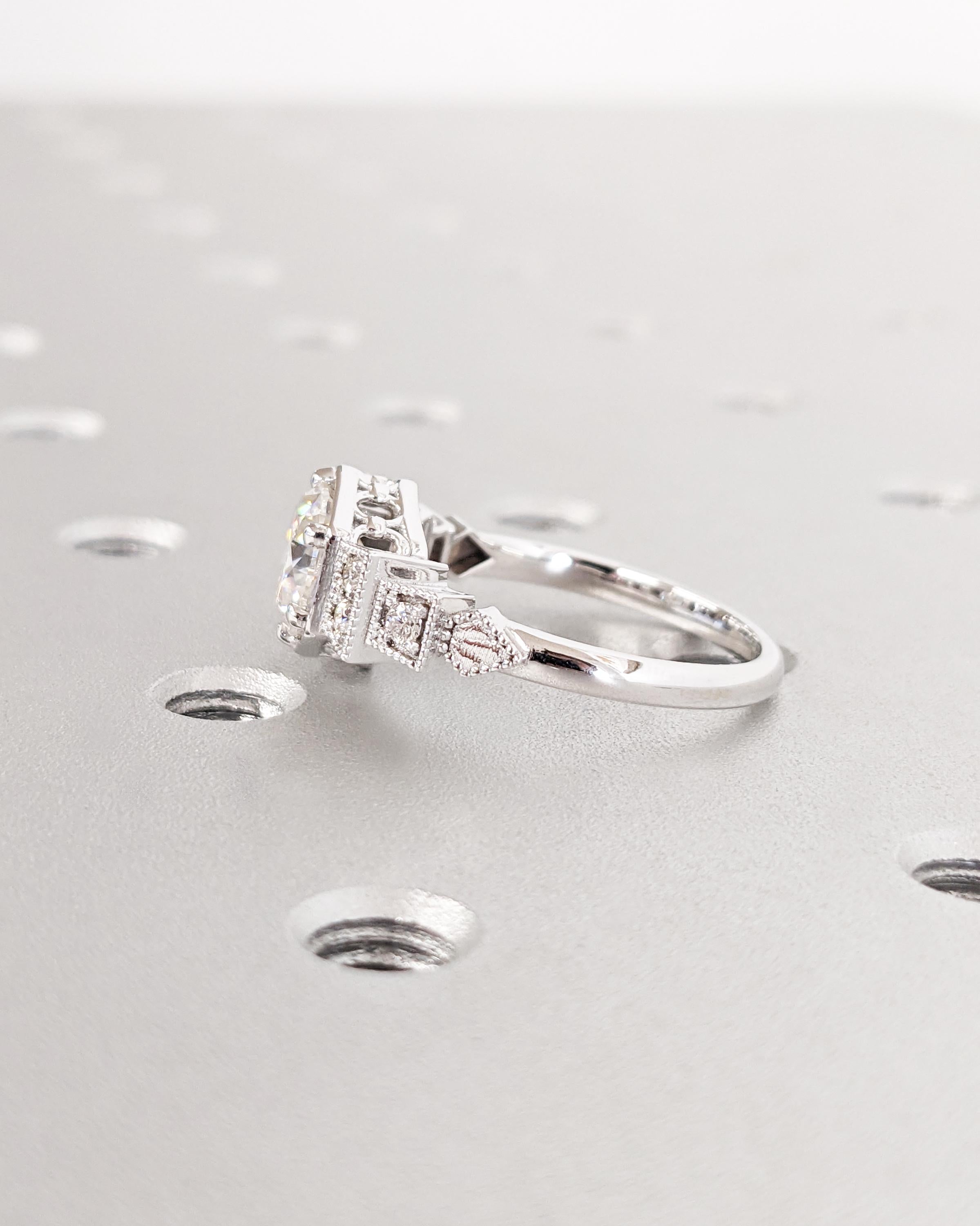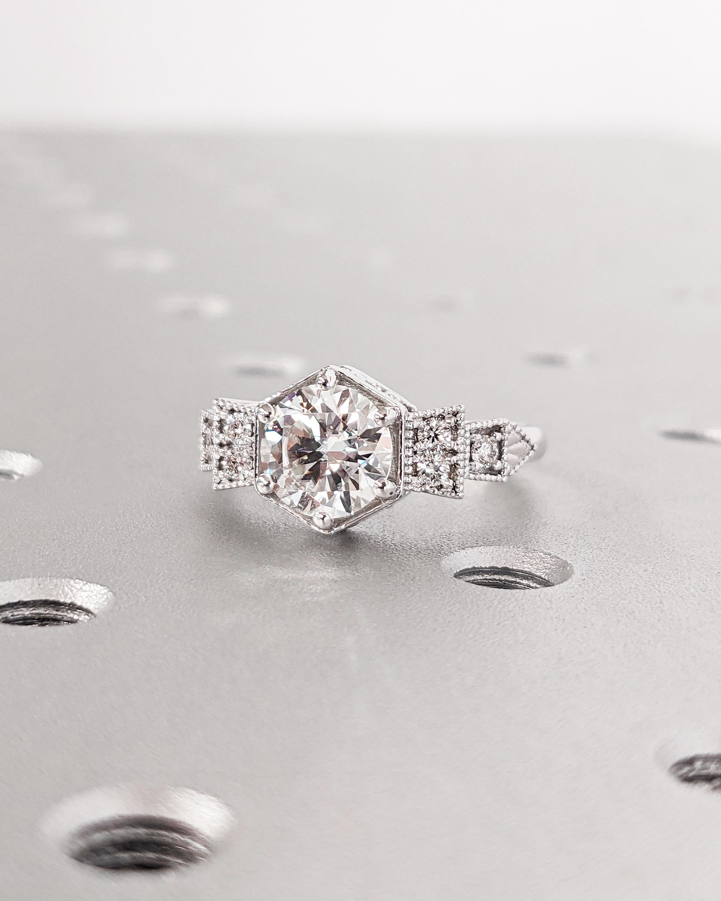 Reflecting the grandeur of a bygone era, this hexagonal open setting is adorned with fine milgrain accents, making it a standout piece. The antique chain pattern in the gallery elevates the stone, and the choice of pave natural diamond, lab diamond, or moissanite brings brilliance and charm.