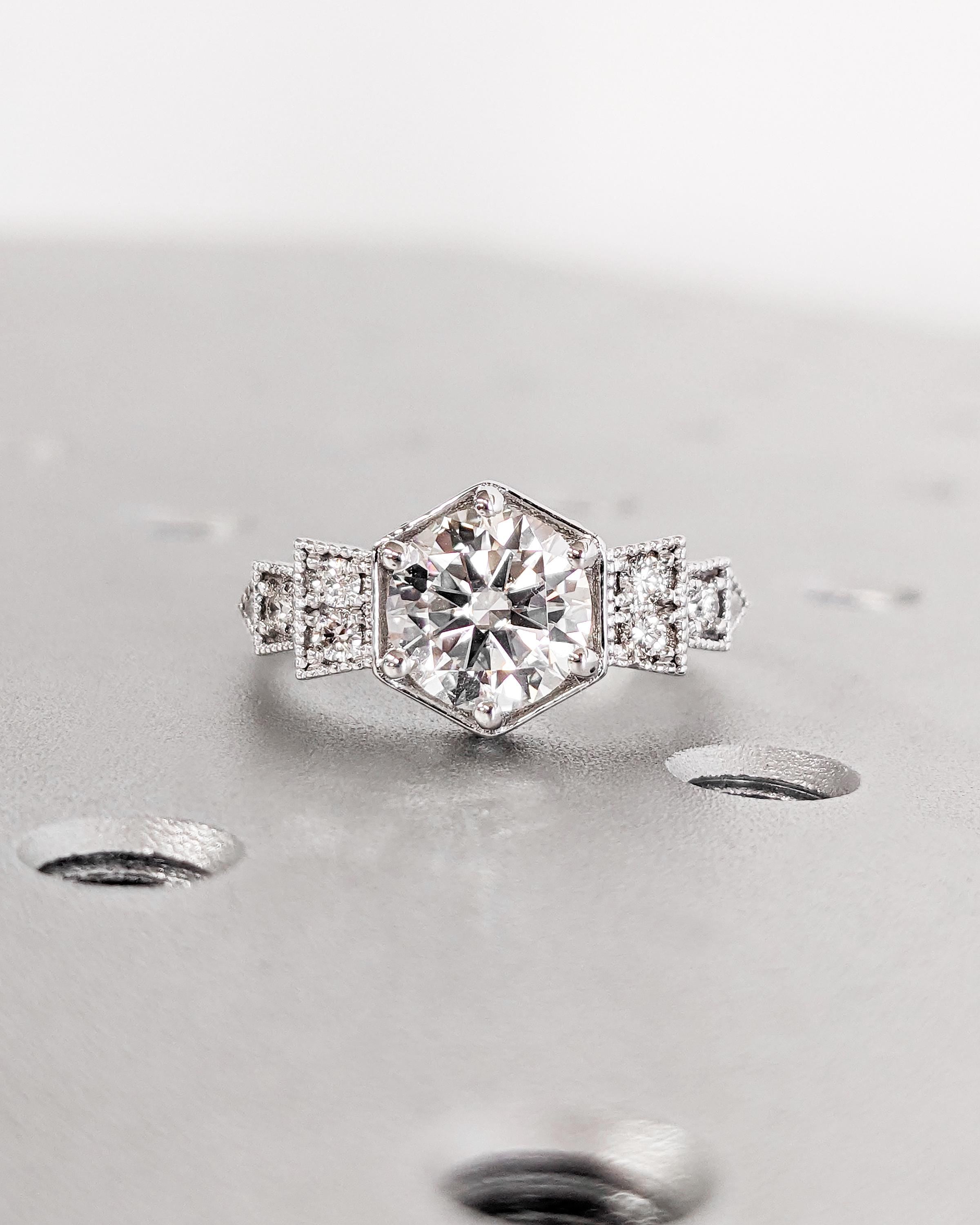 Reflecting the grandeur of a bygone era, this hexagonal open setting is adorned with fine milgrain accents, making it a standout piece. The antique chain pattern in the gallery elevates the stone, and the choice of pave natural diamond, lab diamond, or moissanite brings brilliance and charm.