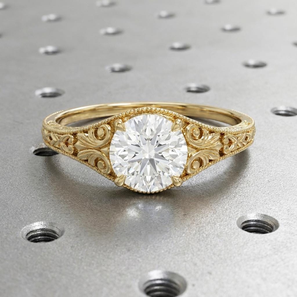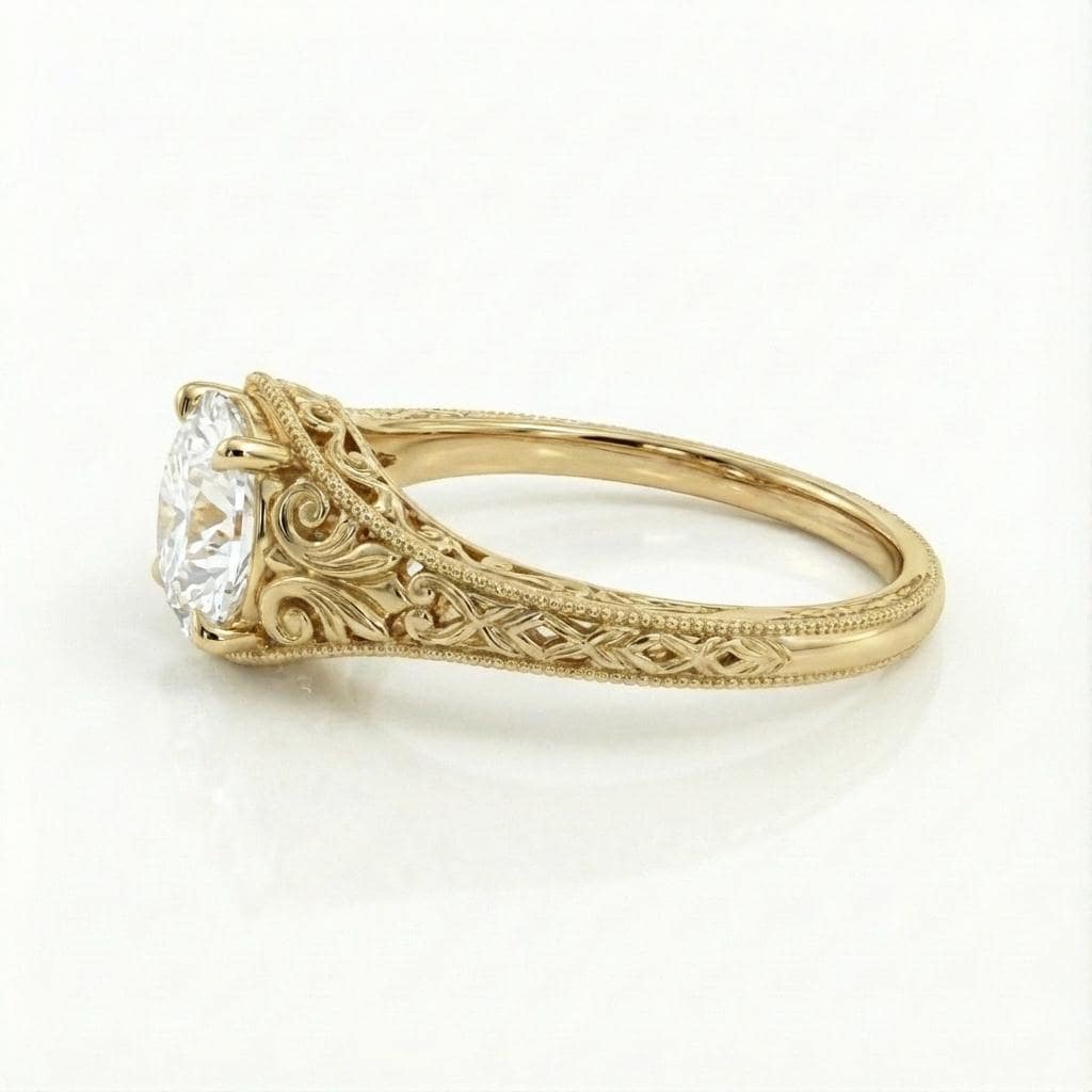 This round cut lab grown diamond engagement ring shines with vintage elegance. Handcrafted filigree and milgrain edges create an antique look. Swirling motifs decorate the sides for extra charm. A timeless statement ring made to be a cherished heirloom.
