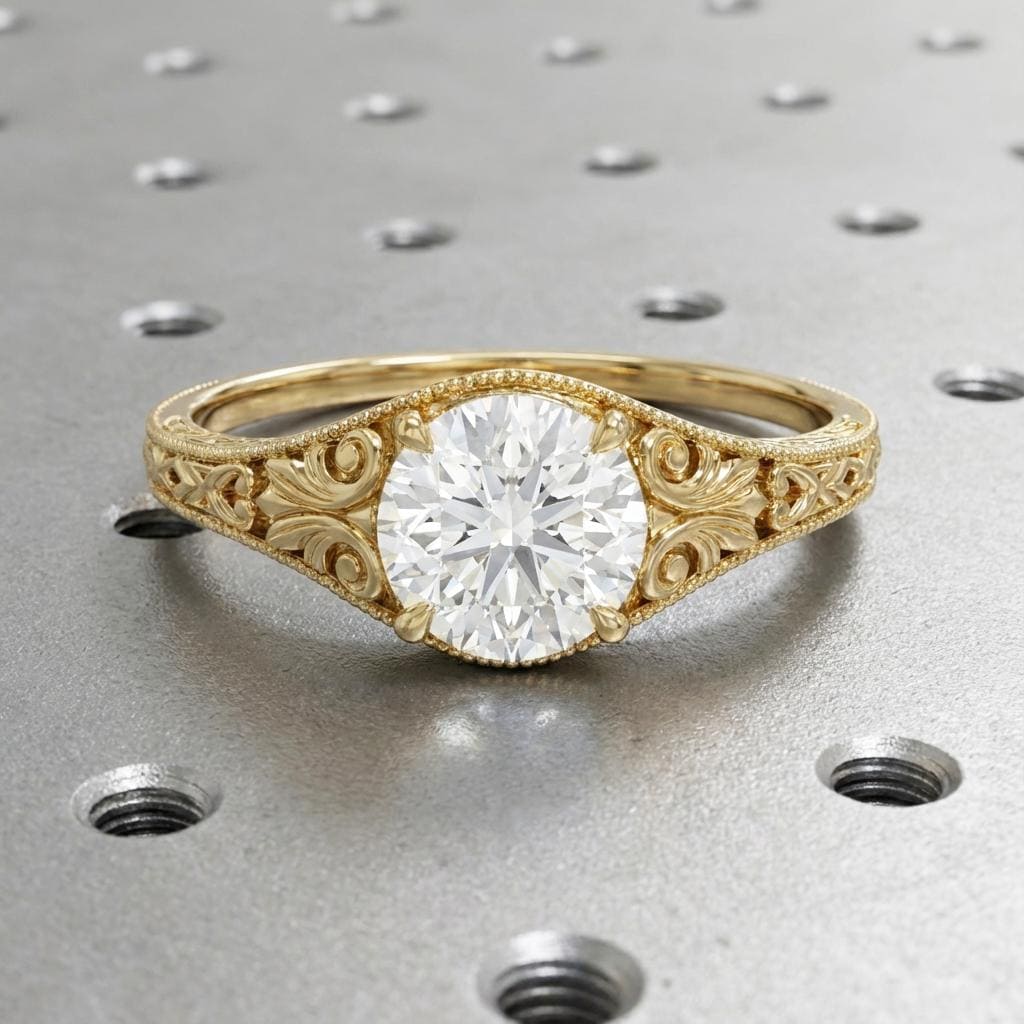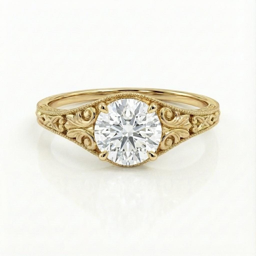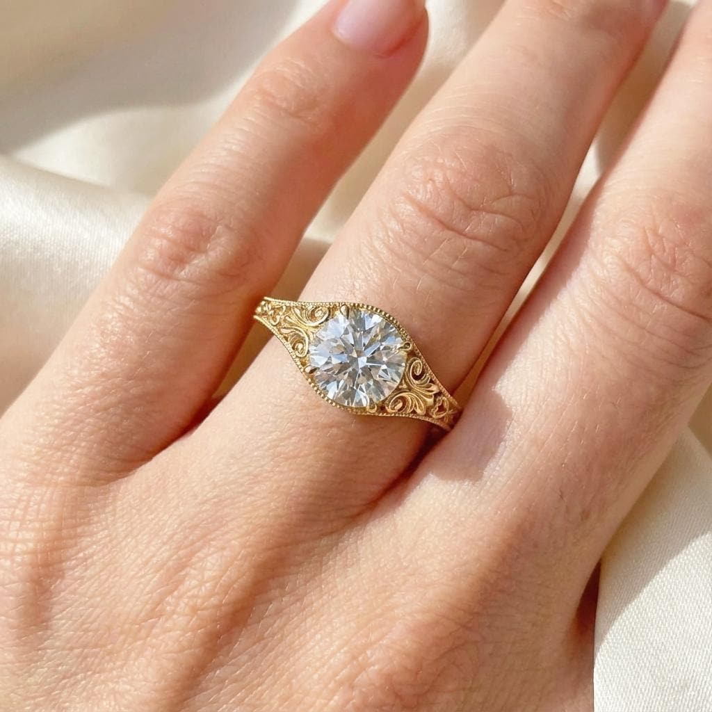 Vintage Filigree Moissanite Ring, Round cut Moissanite Engagement Ring, 14k Yellow Gold Antique Art Deco Wedding Ring, Victorian Style Ring