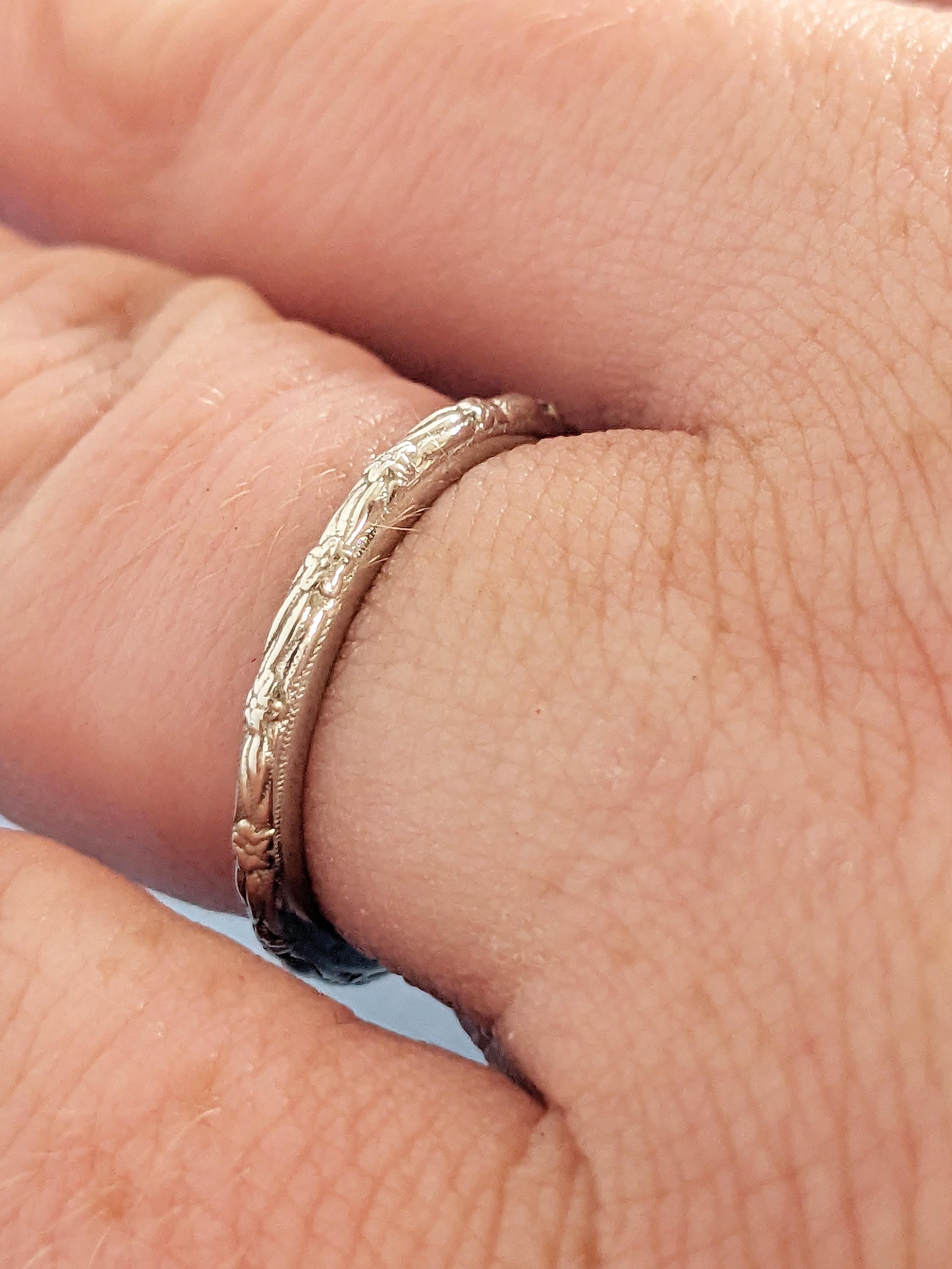 Add a touch of nature beauty to your engagement set with this hand carved wedding band. Crafted with gentle floral detailing, it brings a soft, organic elegance that pairs effortlessly with any ring. Thoughtfully designed and full of character, it’s a charming piece that completes your wedding look with subtle grace.