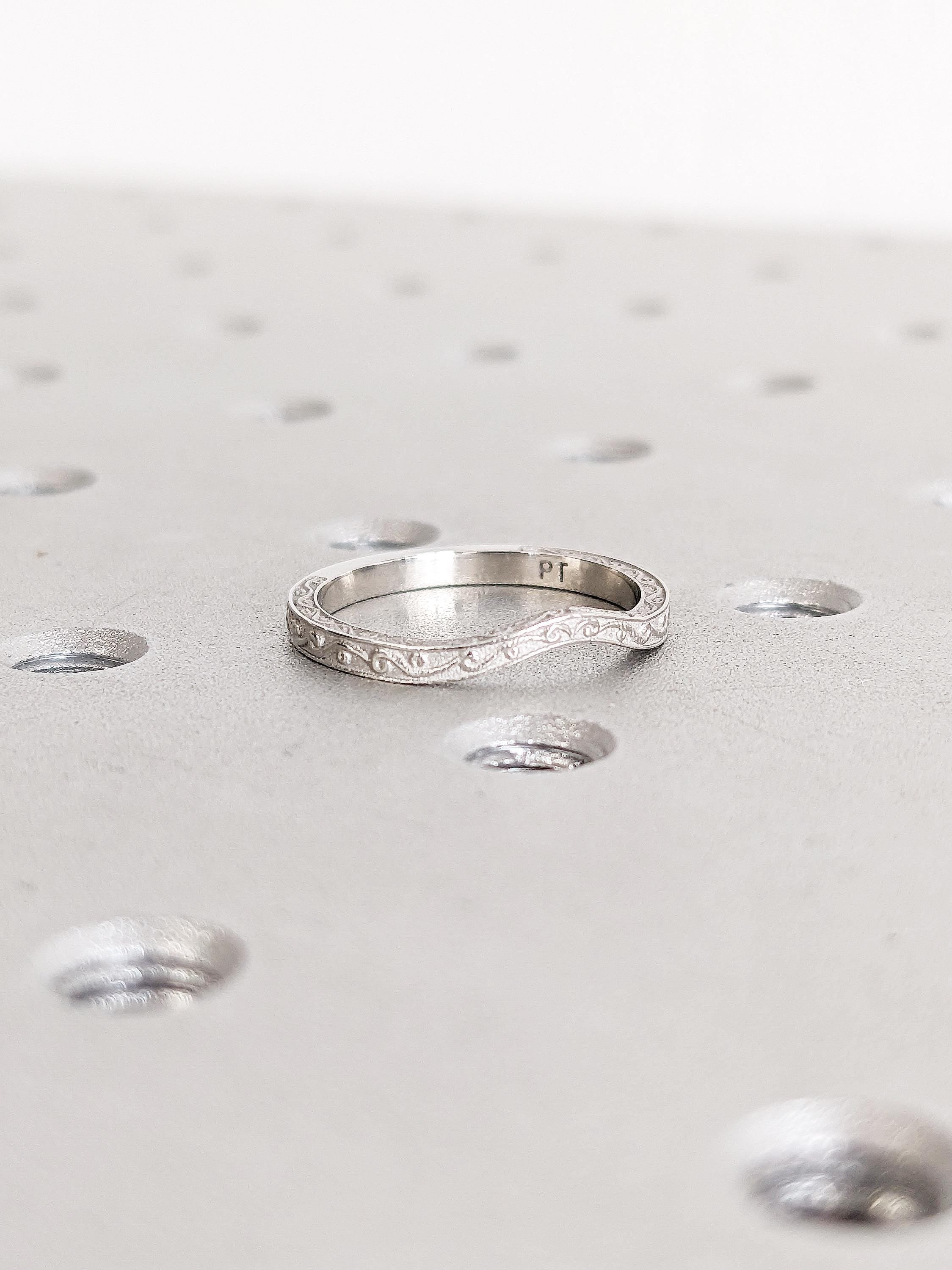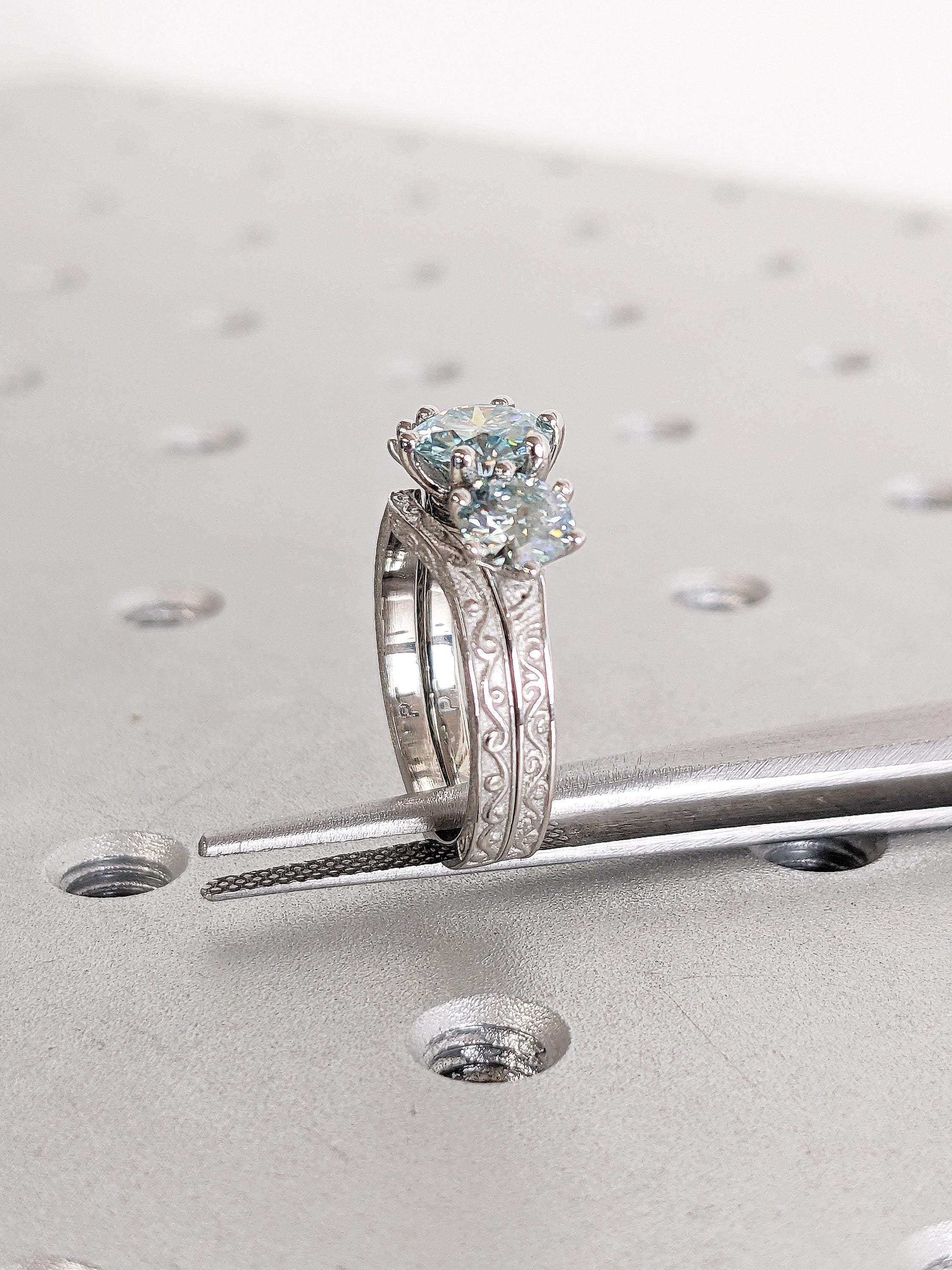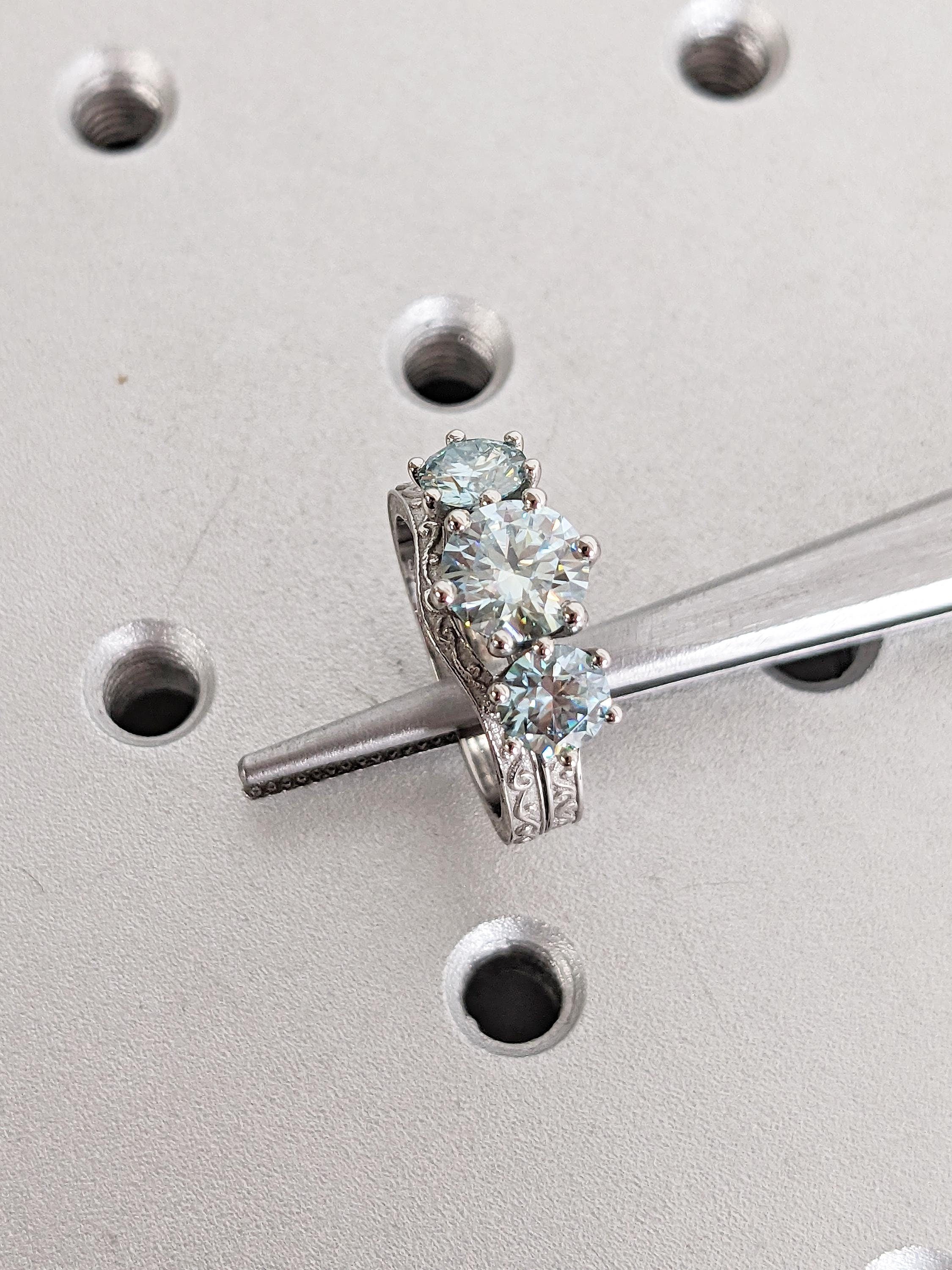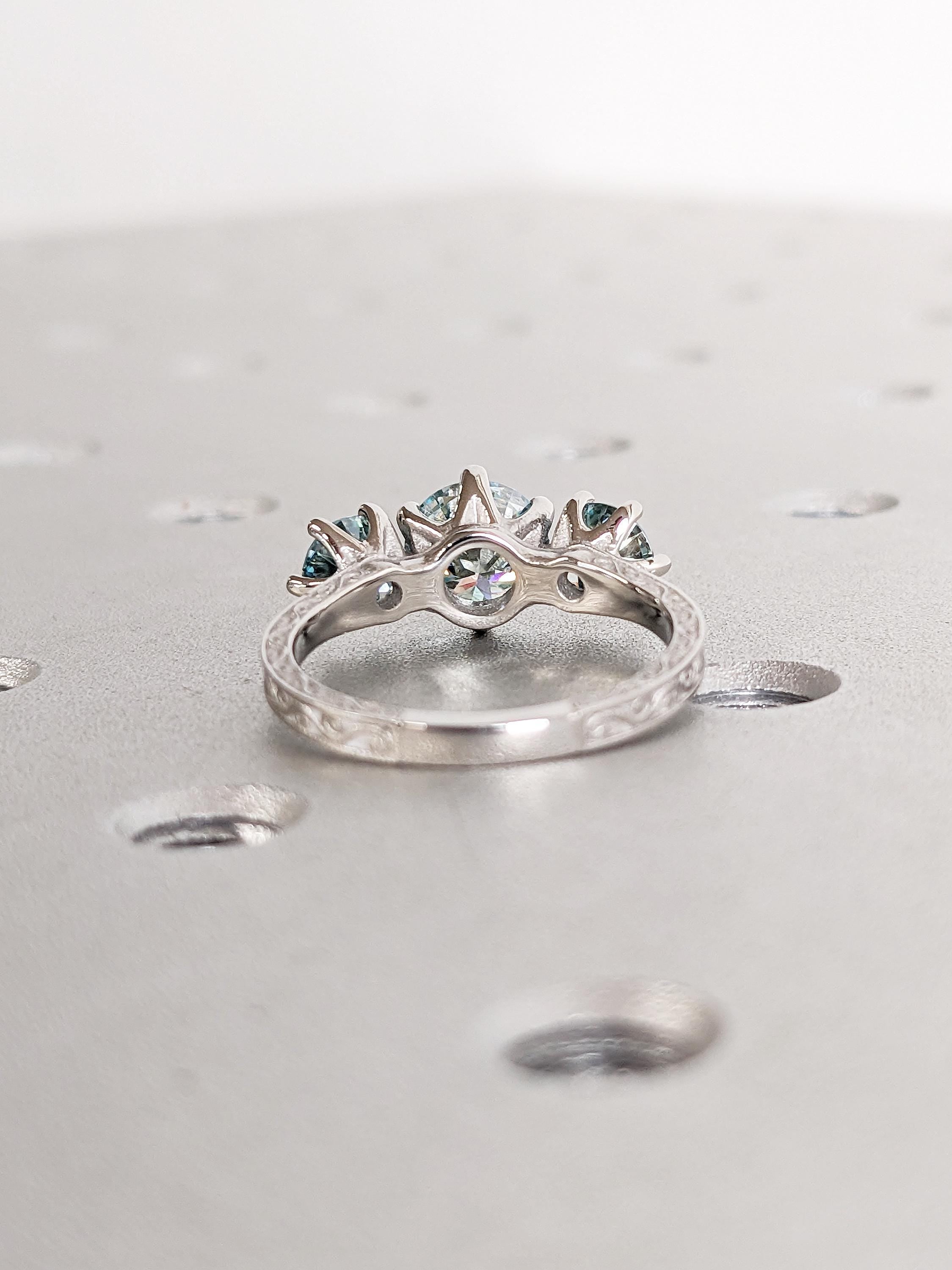 This engagement ring set features a breathtaking three-stone design with three round-cut Green Moissanites, each securely set in elegant prongs and radiating a delicate yet vibrant blue-green sparkle. Complementing the ring is a minimalist curved wedding band, adorned with intricate filigree detailing along its exterior. With its timeless elegance and classic appeal, this set is the perfect choice for an engagement, anniversary, or wedding gift.