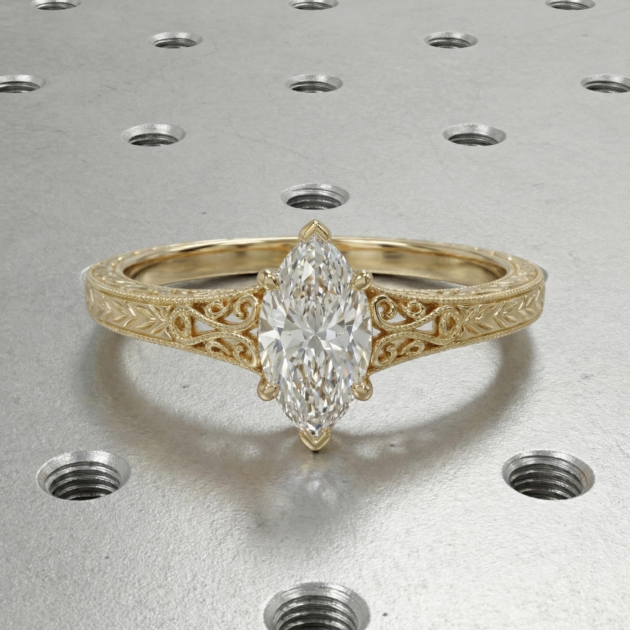 A beautifully handcrafted, vintage inspired engagement ring featuring a striking marquise cut Lab Diamond solitaire. Delicate scrollwork and engraved leaf motifs adorn the band, flowing gracefully toward the center stone, with intricate detailing beneath the setting for a subtle hidden touch. Blending timeless Victorian elegance with clean, modern lines, this statement ring is designed to be treasured today and passed down as a cherished heirloom.