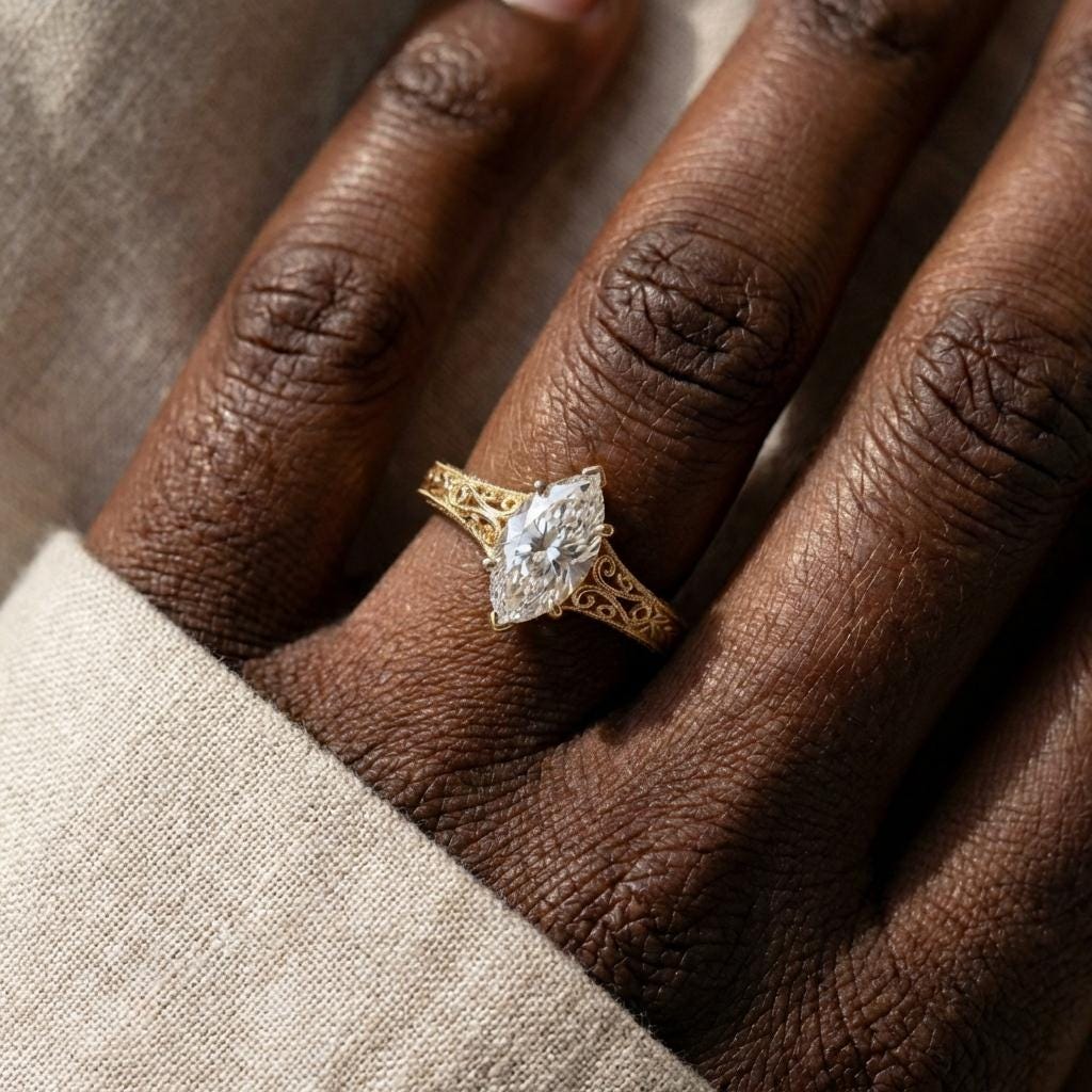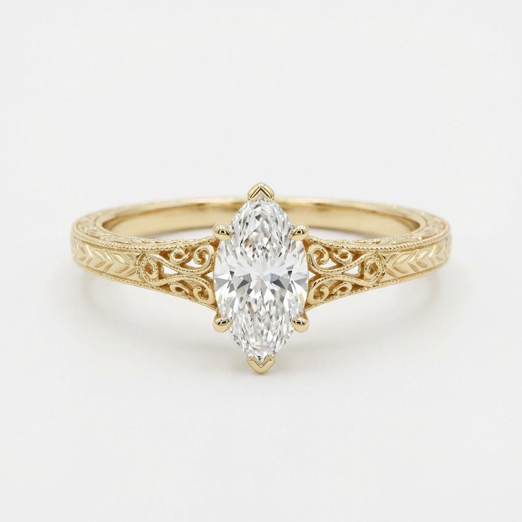 Vintage Heirloom Ring, Lab Grown Diamond Engagement Ring, Marquise Cut Victorian Filigree Band, 14k Yellow Gold Wedding Rings for Women