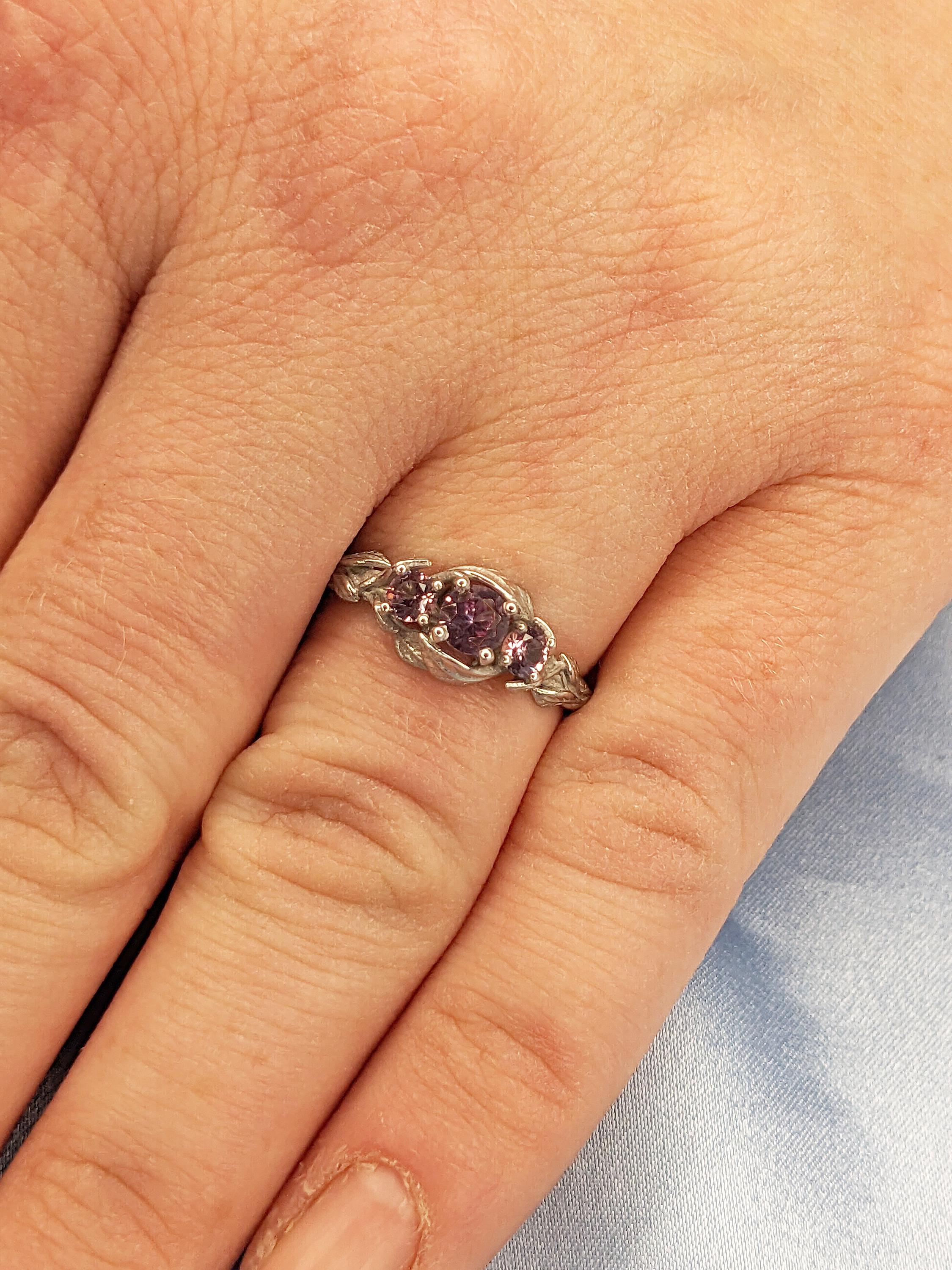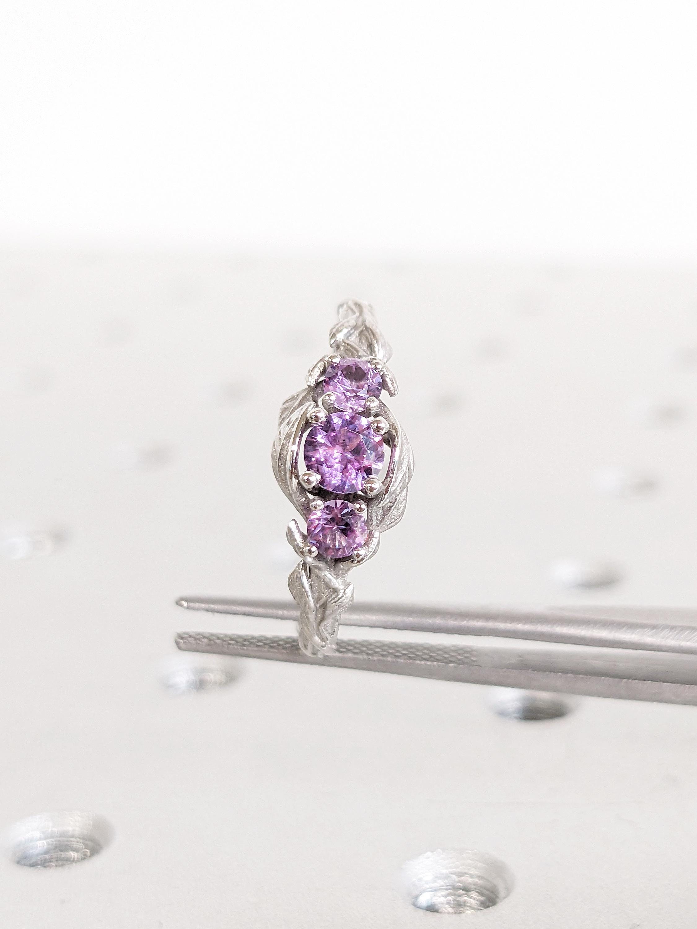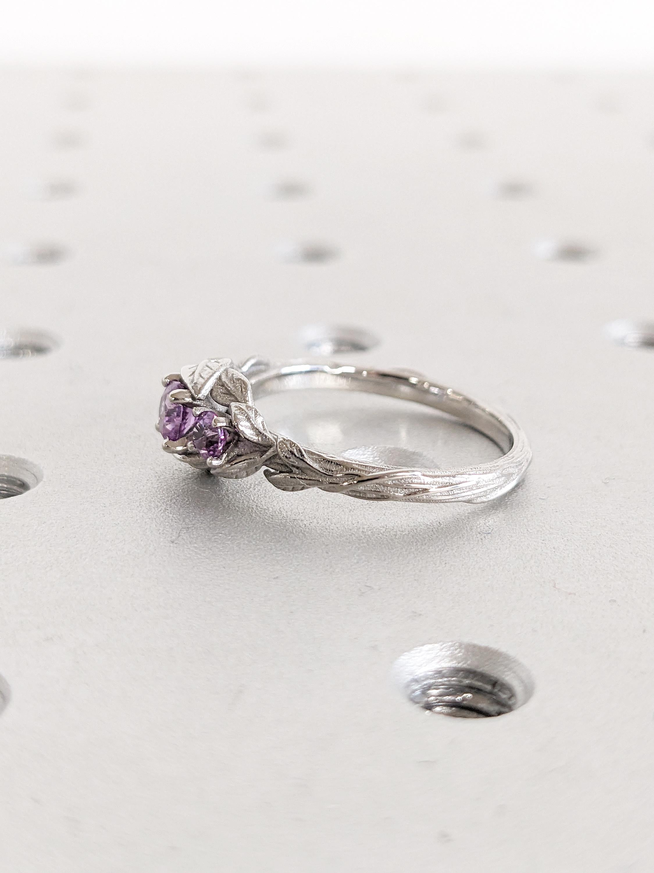 This ring showcases delicate, flowing stems that gracefully curve toward a captivating Lab Created Alexandrite centerpiece, surrounded by refined leaf accents. The shank features intricate twig-inspired details, while two Lab Created Alexandrite side stones add a personalized touch of elegance and charm.
