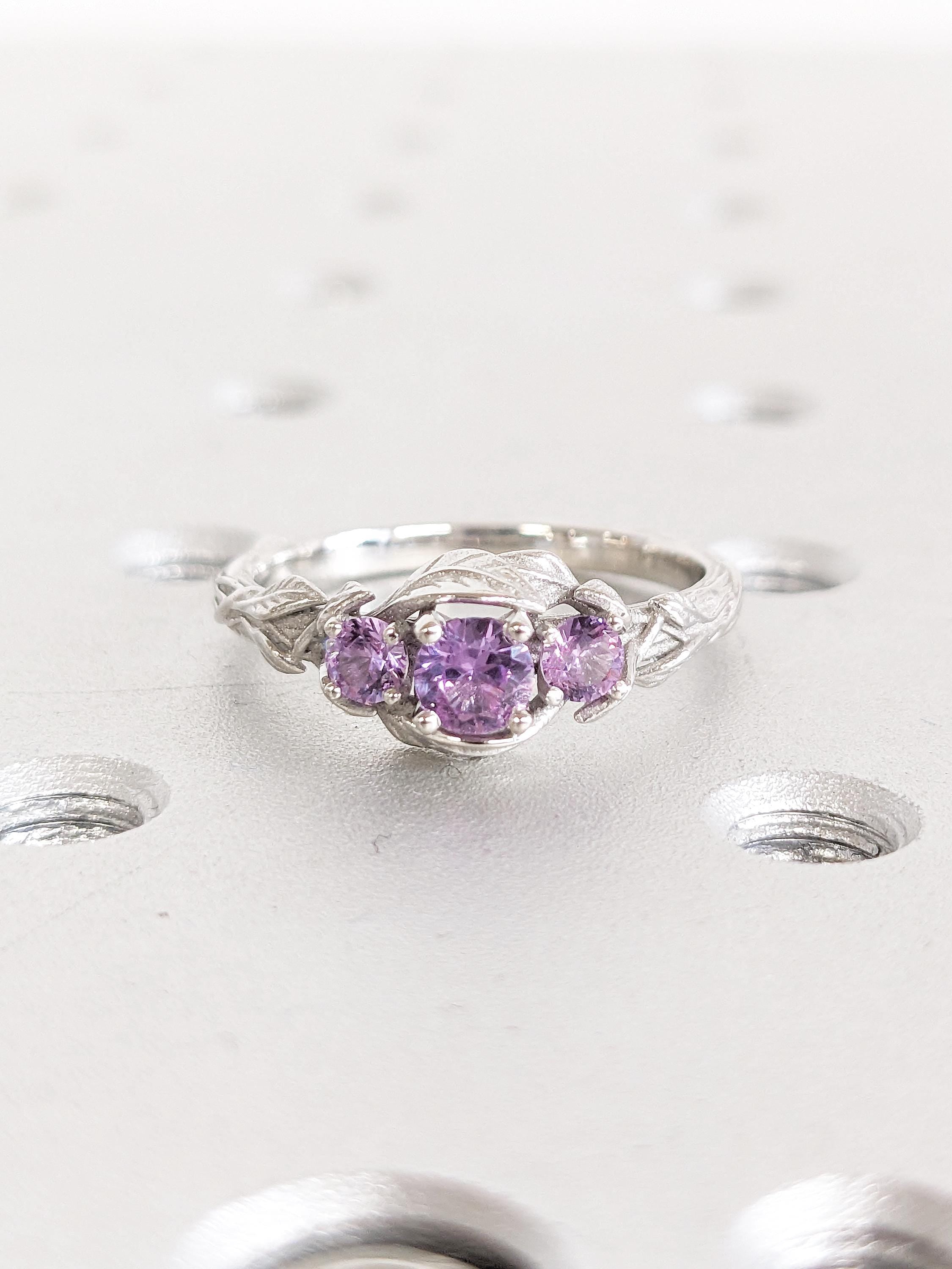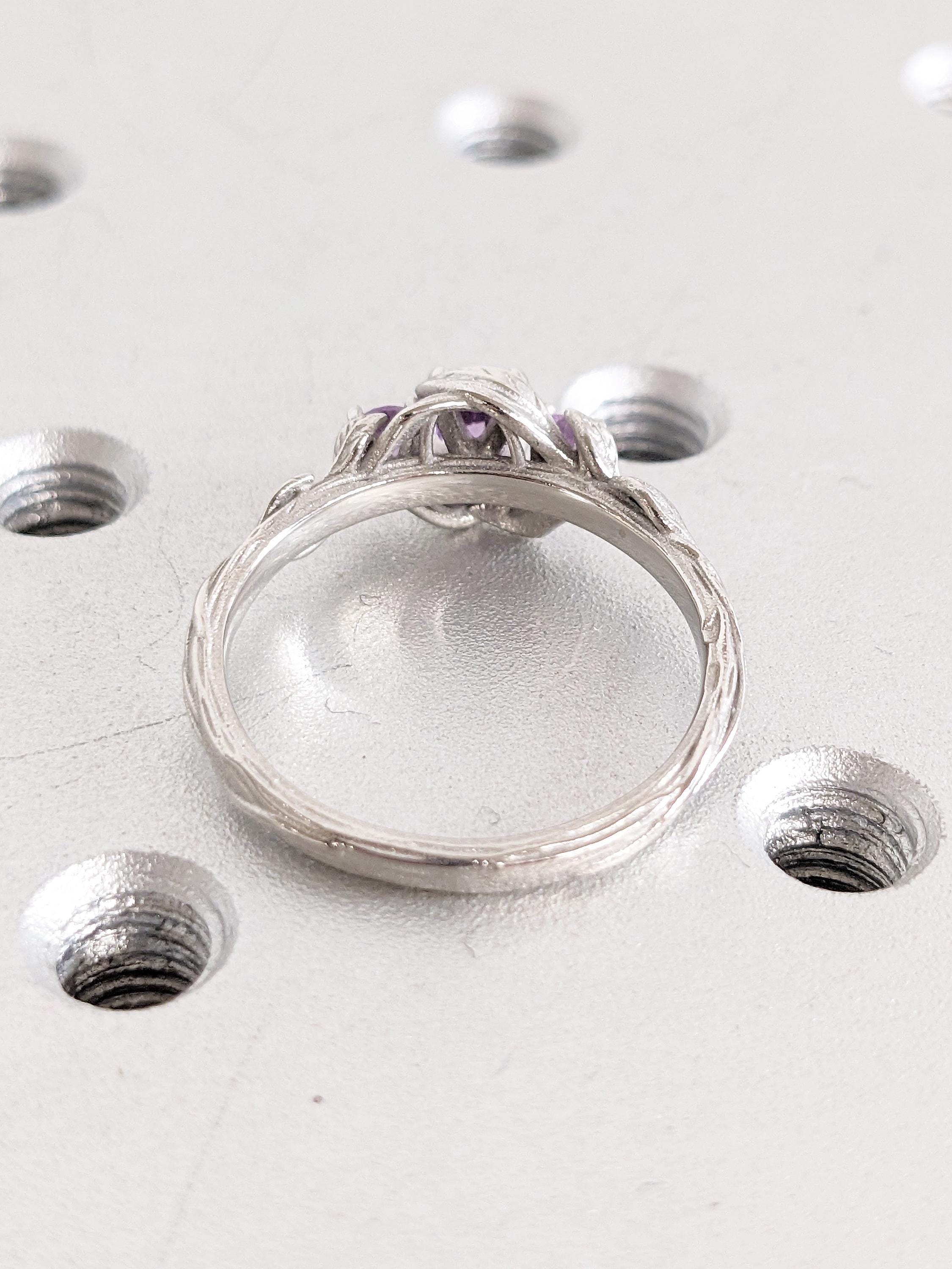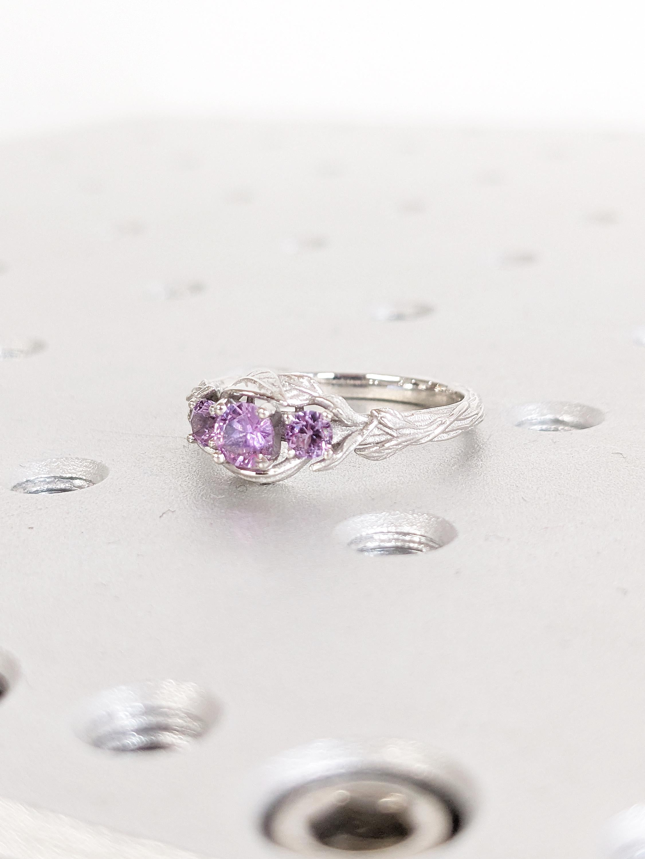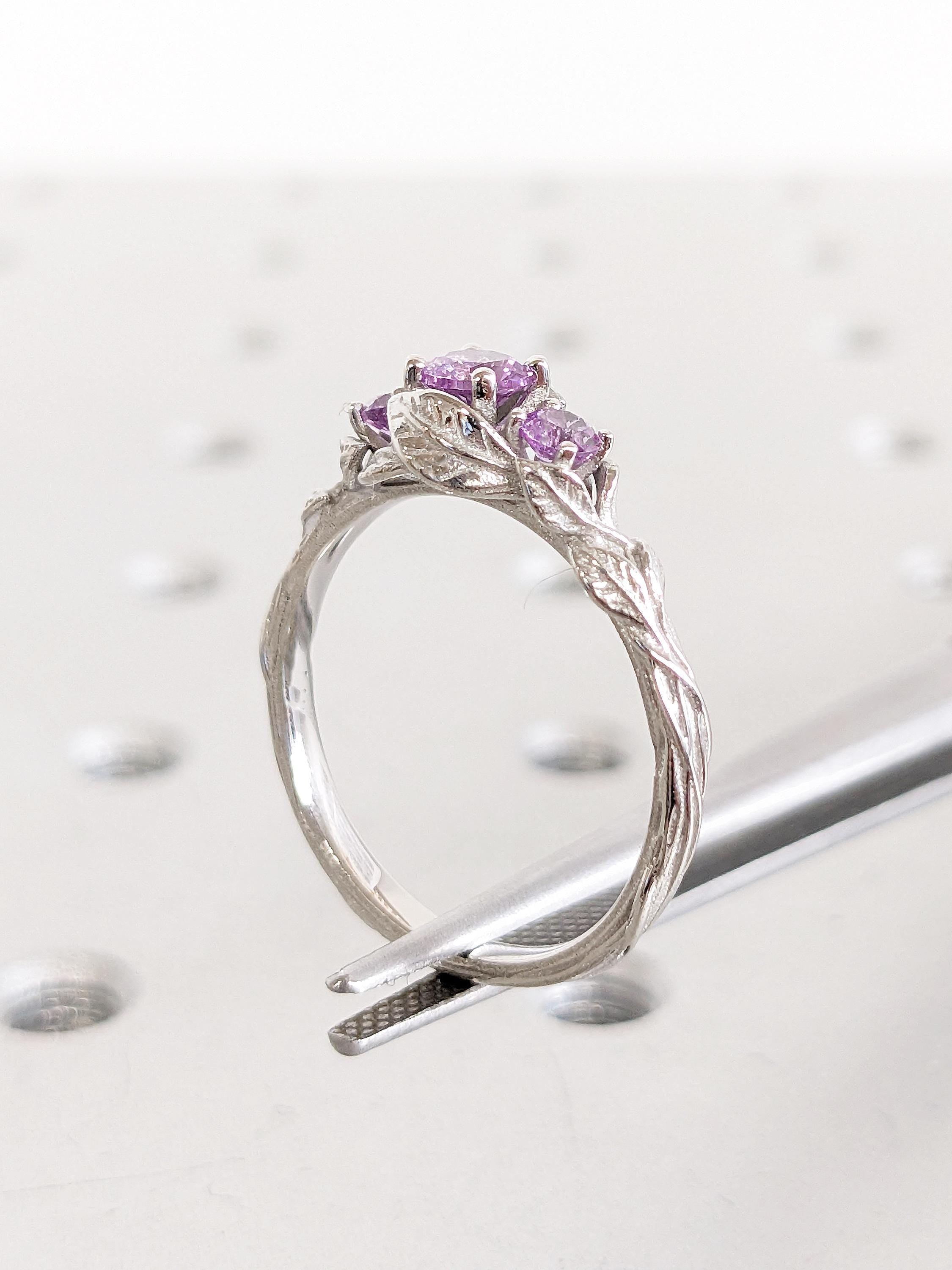 This ring showcases delicate, flowing stems that gracefully curve toward a captivating Lab Created Alexandrite centerpiece, surrounded by refined leaf accents. The shank features intricate twig-inspired details, while two Lab Created Alexandrite side stones add a personalized touch of elegance and charm.
