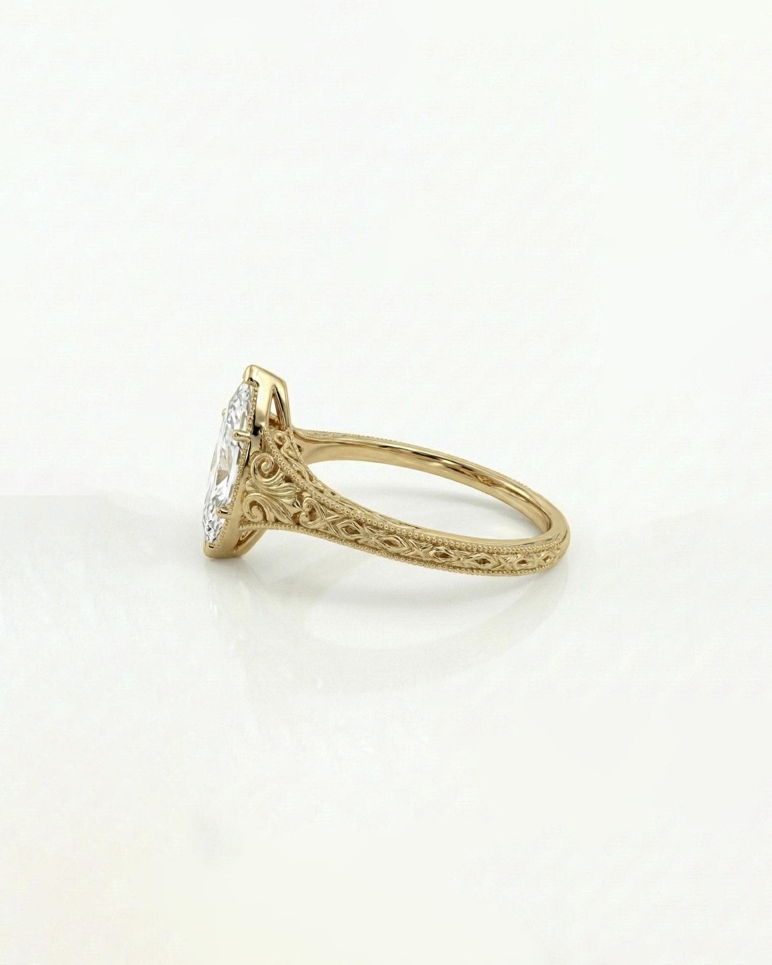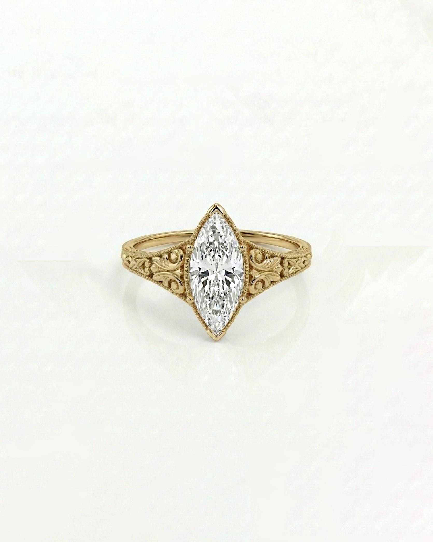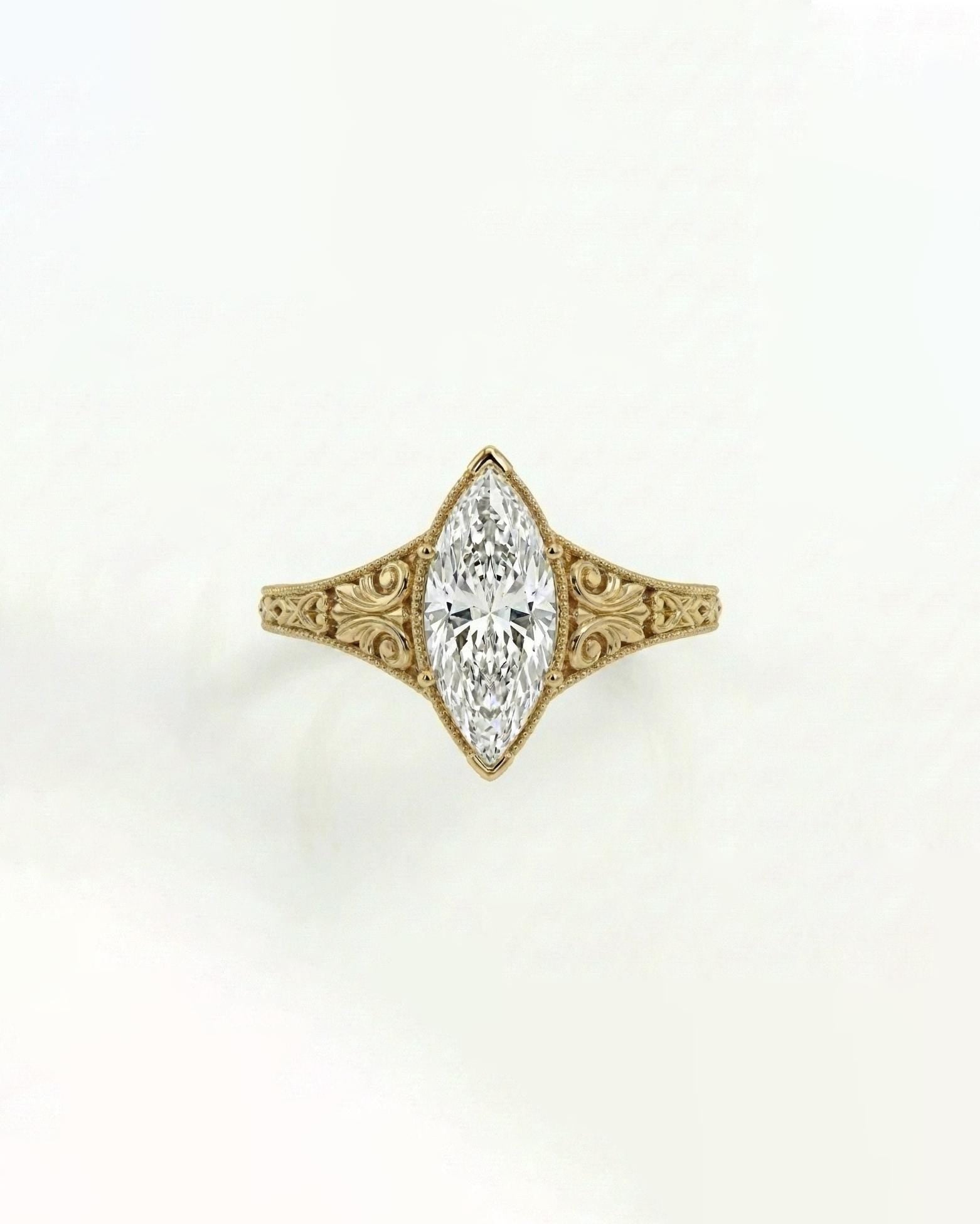 This vintage-inspired engagement ring features a striking marquise-cut Lab Grown Diamond at its center, designed to elongate the finger and maximize brilliance. The band is adorned with intricate filigree work and delicate milgrain detailing, adding depth, texture, and timeless character to the design. With a band width that gracefully tapers between 1.6–3mm, this ring blends antique elegance with refined craftsmanship for a truly romantic statement.