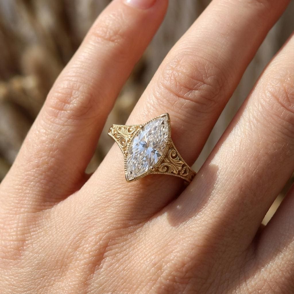 Vintage Marquise Engagement Ring, Solitaire 14k Yellow Gold Filigree Ring, Milgrain Lab Grown Diamond Ring, Art Deco Handmade Rings for Her