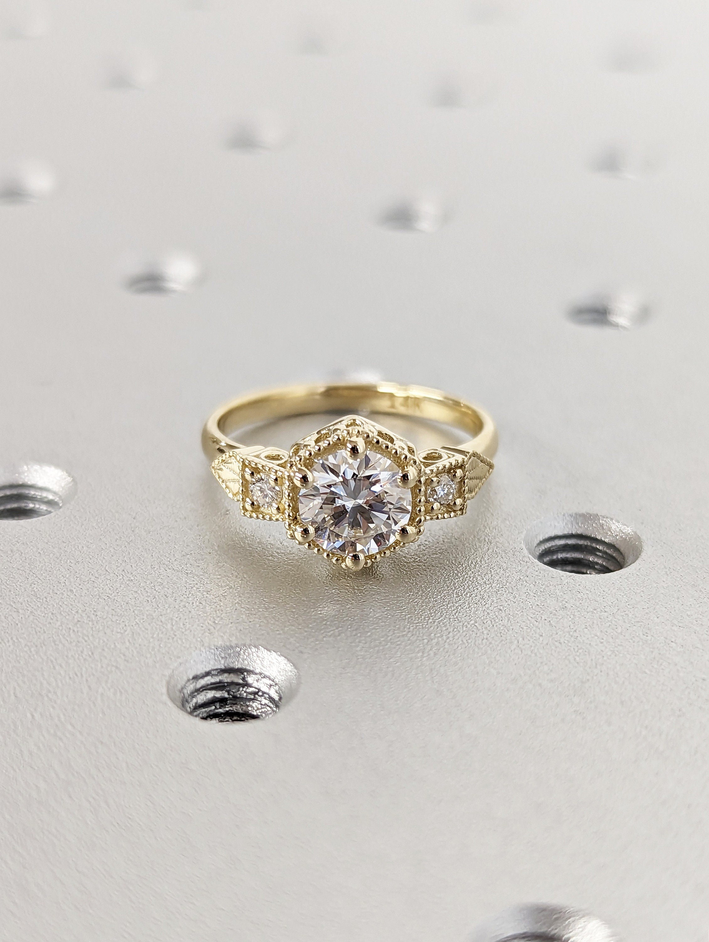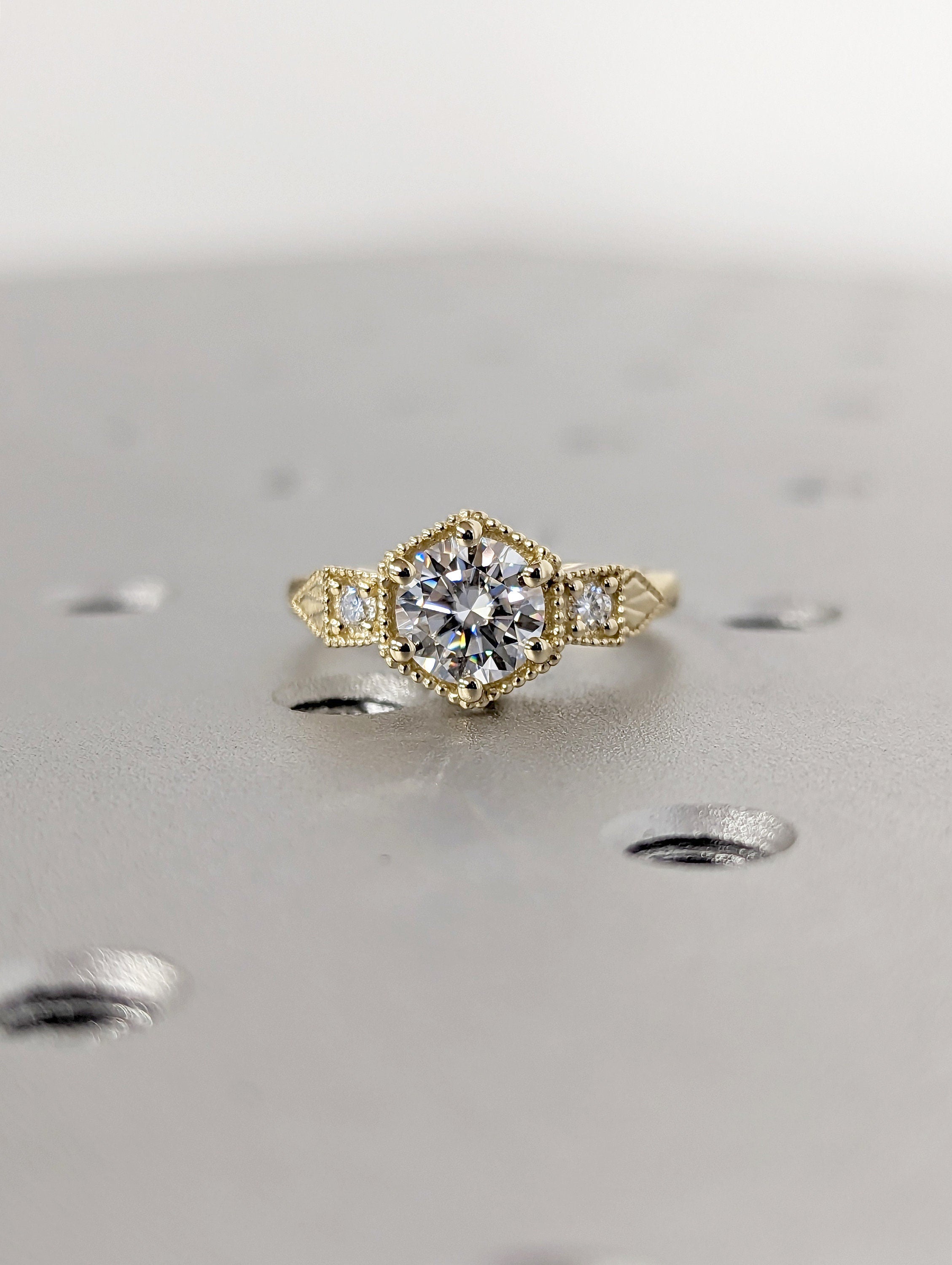 Flattering and opulent, the hexagonal setting is heightened by paved diamond accents and milgrain touches that elegantly draw attention to the centerpiece. The gallery features an antique chain link pattern, and a combination of diamond pave and angular design contrast beautifully to highlight the smoothness of the band, whilst intricate spade patterning within the edging brings balance to this ring's unique style.