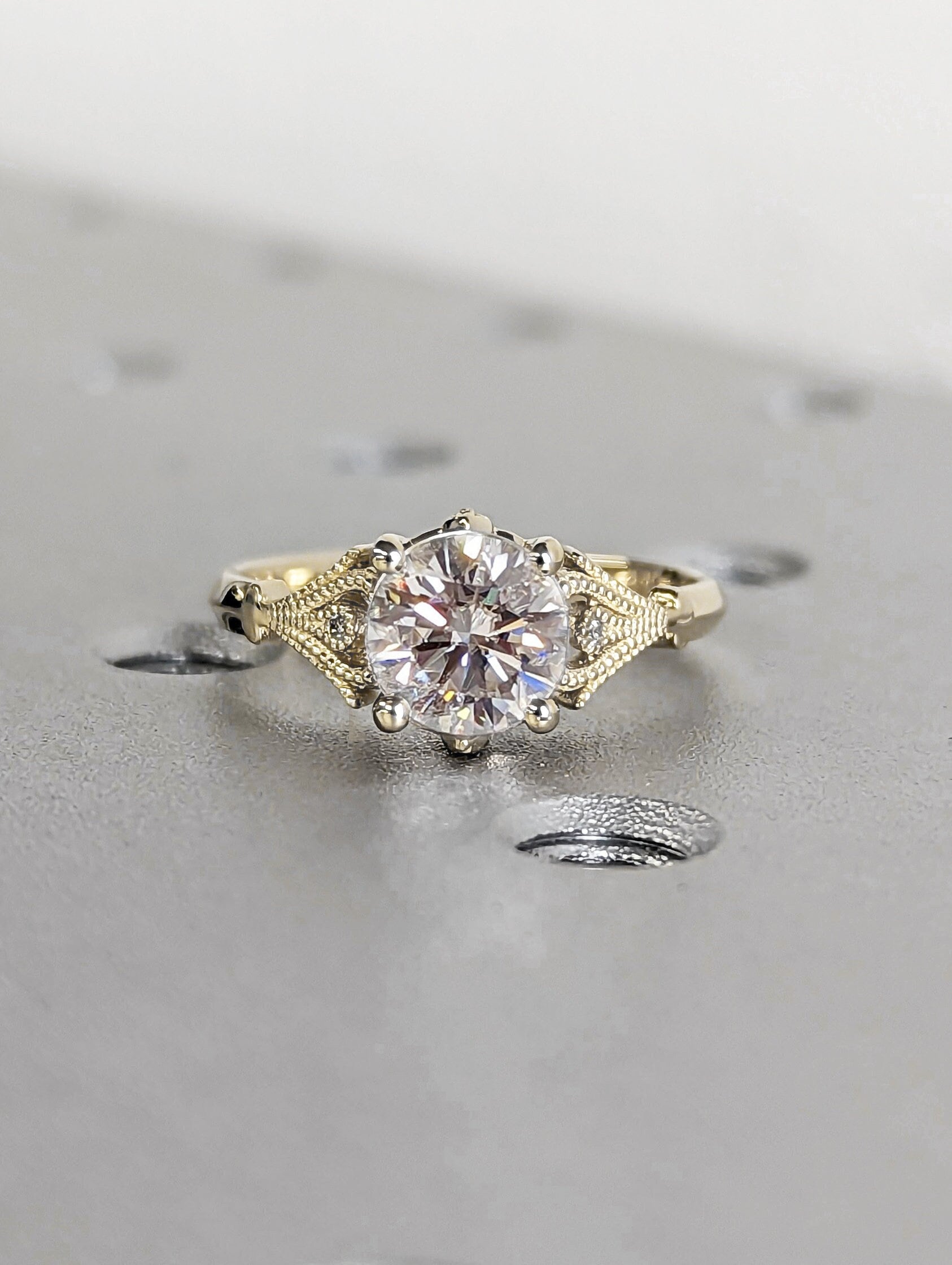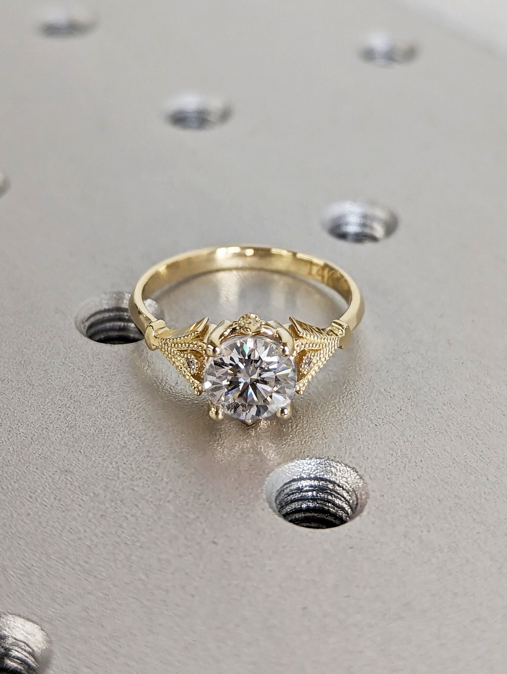 Vintage Moissanite Engagement Ring 14k yellow gold, Moissanite Engagement Ring, Antique Round cut Bridal ring, Art deco Ring Milgrain band
