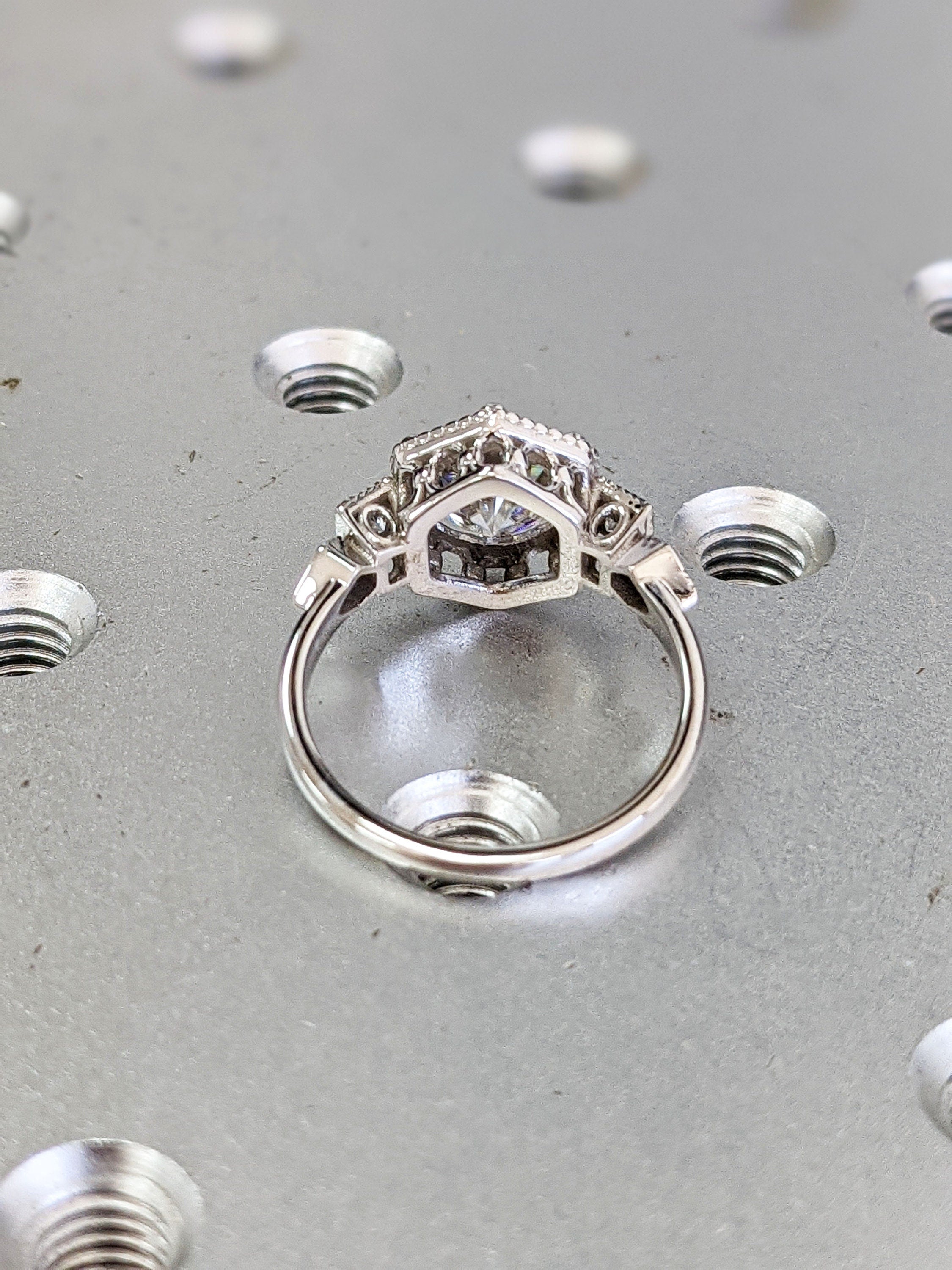 Flattering and opulent, the hexagonal setting is heightened by paved diamond accents and milgrain touches that elegantly draw attention to the centerpiece. The gallery features an antique chain link pattern, and a combination of diamond pave and angular design contrast beautifully to highlight the smoothness of the band, whilst intricate spade patterning within the edging brings balance to this ring's unique style.