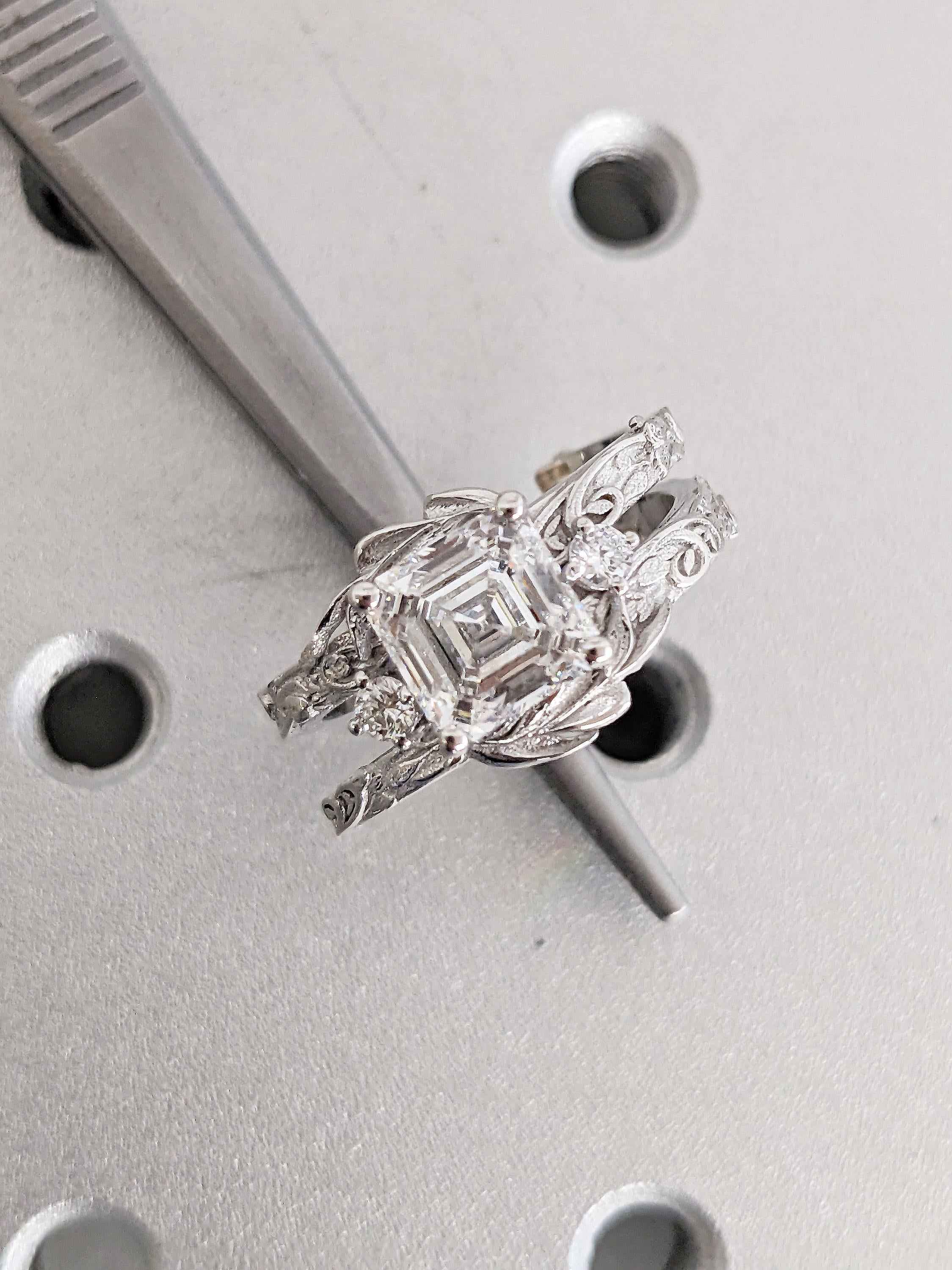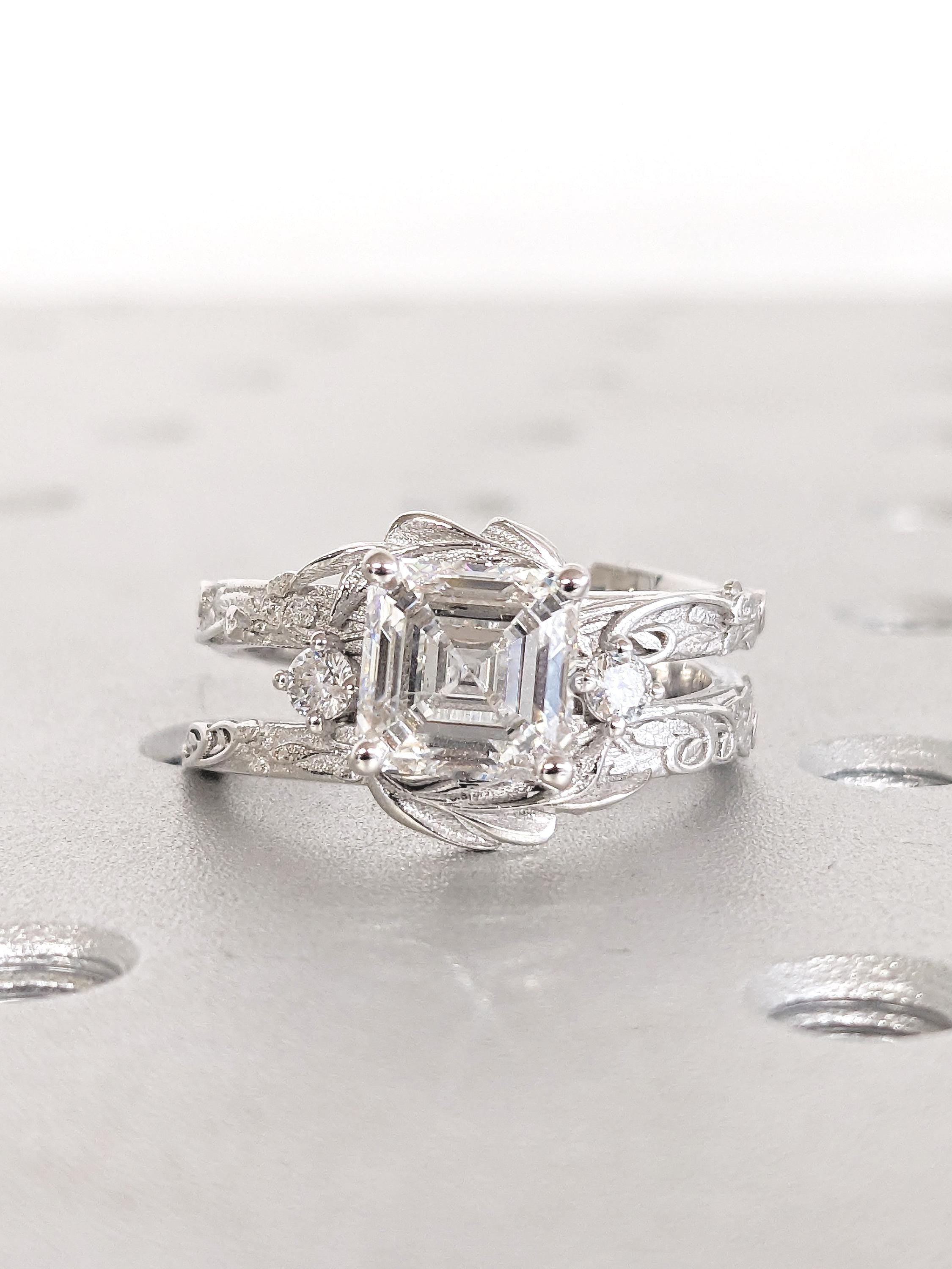 This antique engagement ring features an Asscher-cut Moissanite center stone, flanked by sparkling round-cut accents available in Natural Diamonds, Lab Diamonds, or Moissanites. Intricate floral motifs gracefully wind along the band, giving the piece a romantic, vintage-inspired charm. A perfect blend of timeless artistry and modern brilliance. This ring beautifully symbolizes love that blossoms forever.