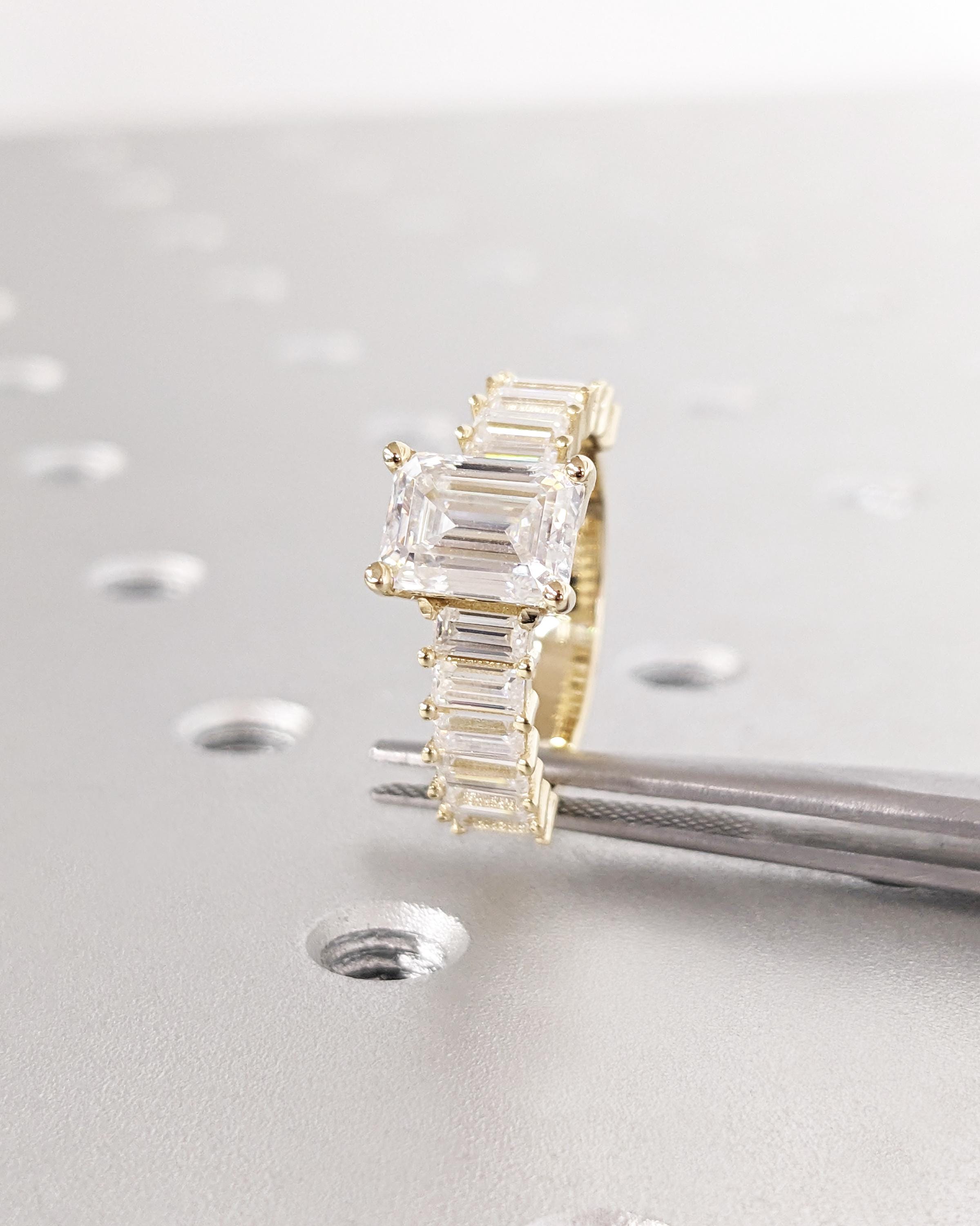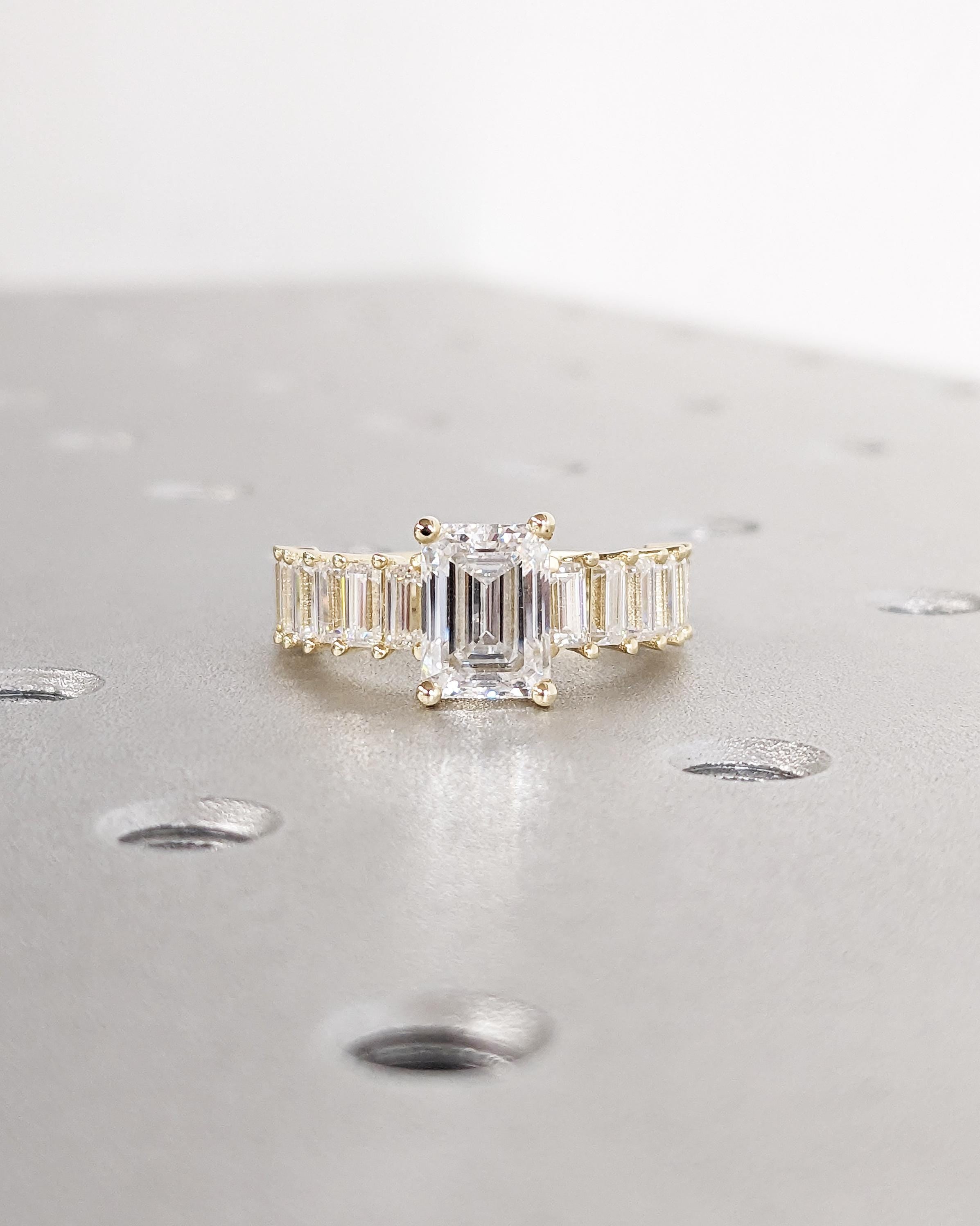 This emerald cut moissanite engagement ring is all about structured sparkle and sophisticated charm. The band is set with baguette cut moissanites in a half eternity style that shines from every angle. With its art deco-inspired layout, it’s a ring that balances vintage beauty with modern appeal. Perfect for someone looking to make a graceful, stylish statement.