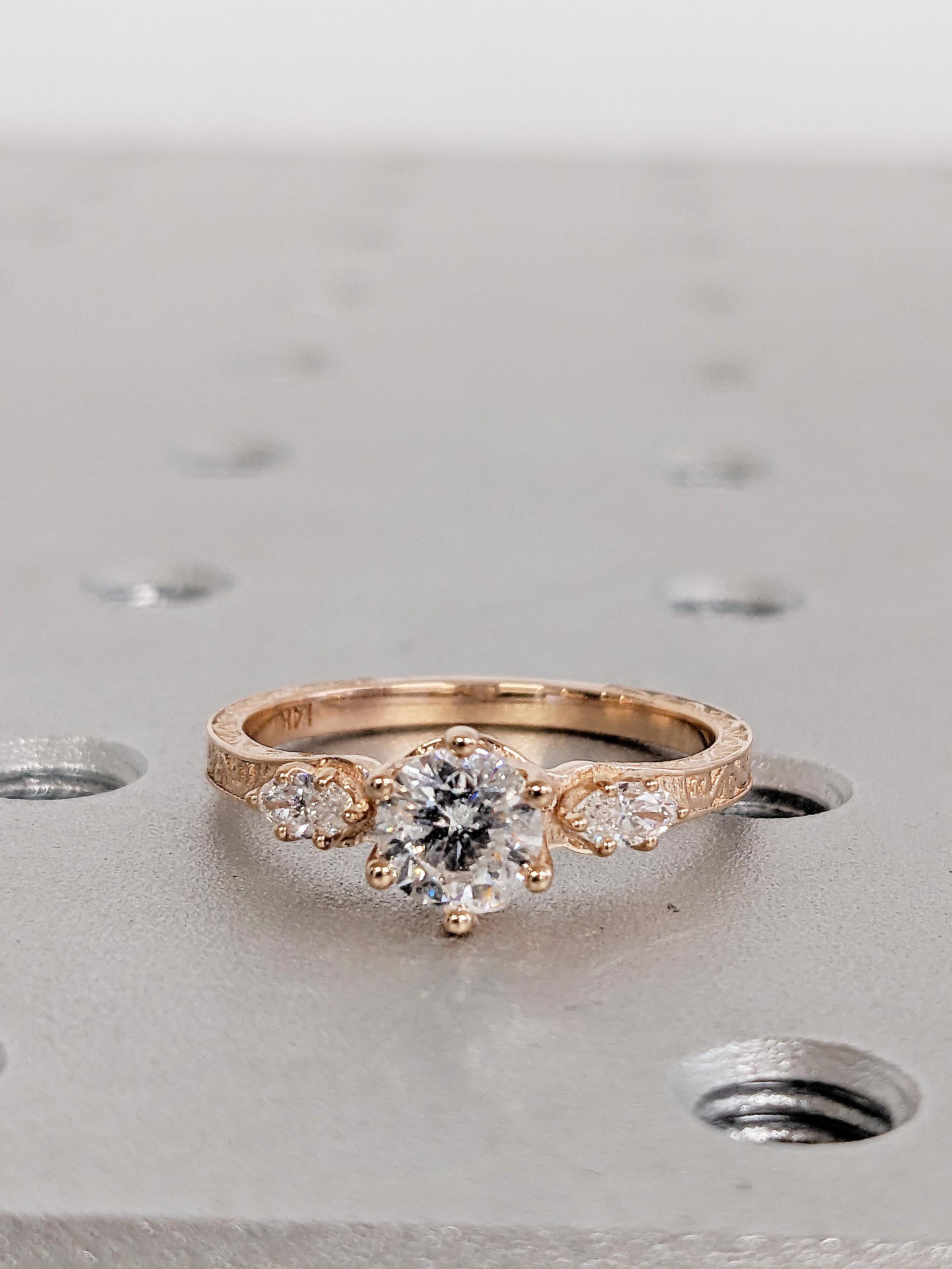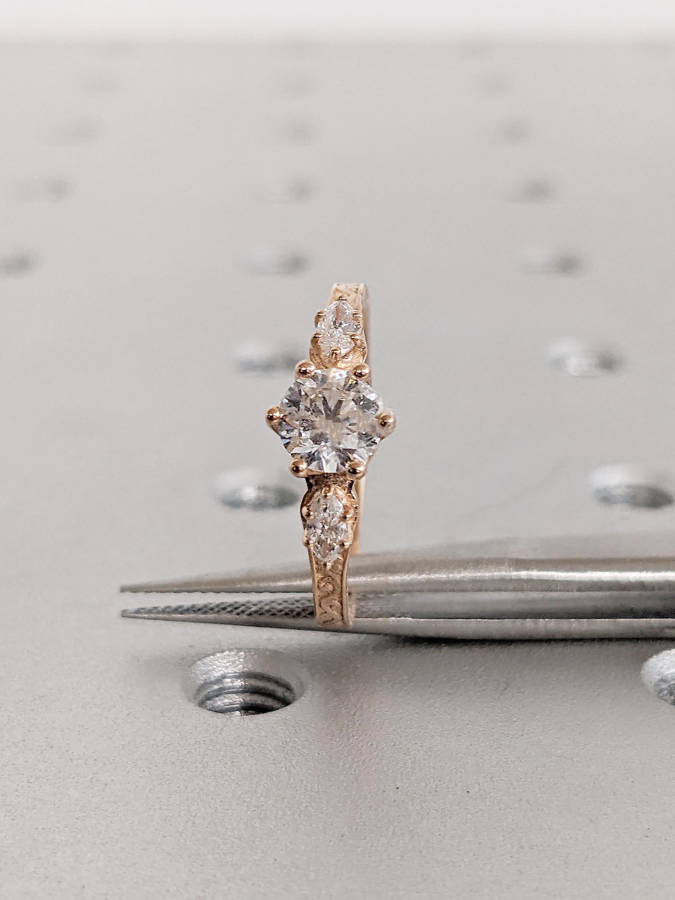 Introducing a captivating masterpiece: our vintage-style three-stone engagement ring, customizable with your preferred choice of diamonds or moissanites. At its heart lies a brilliant round-cut moissanite, radiating timeless elegance. Delight in the intricate undulating wave filigree that graces this exceptional piece, promising a touch of individuality that stands the test of time.