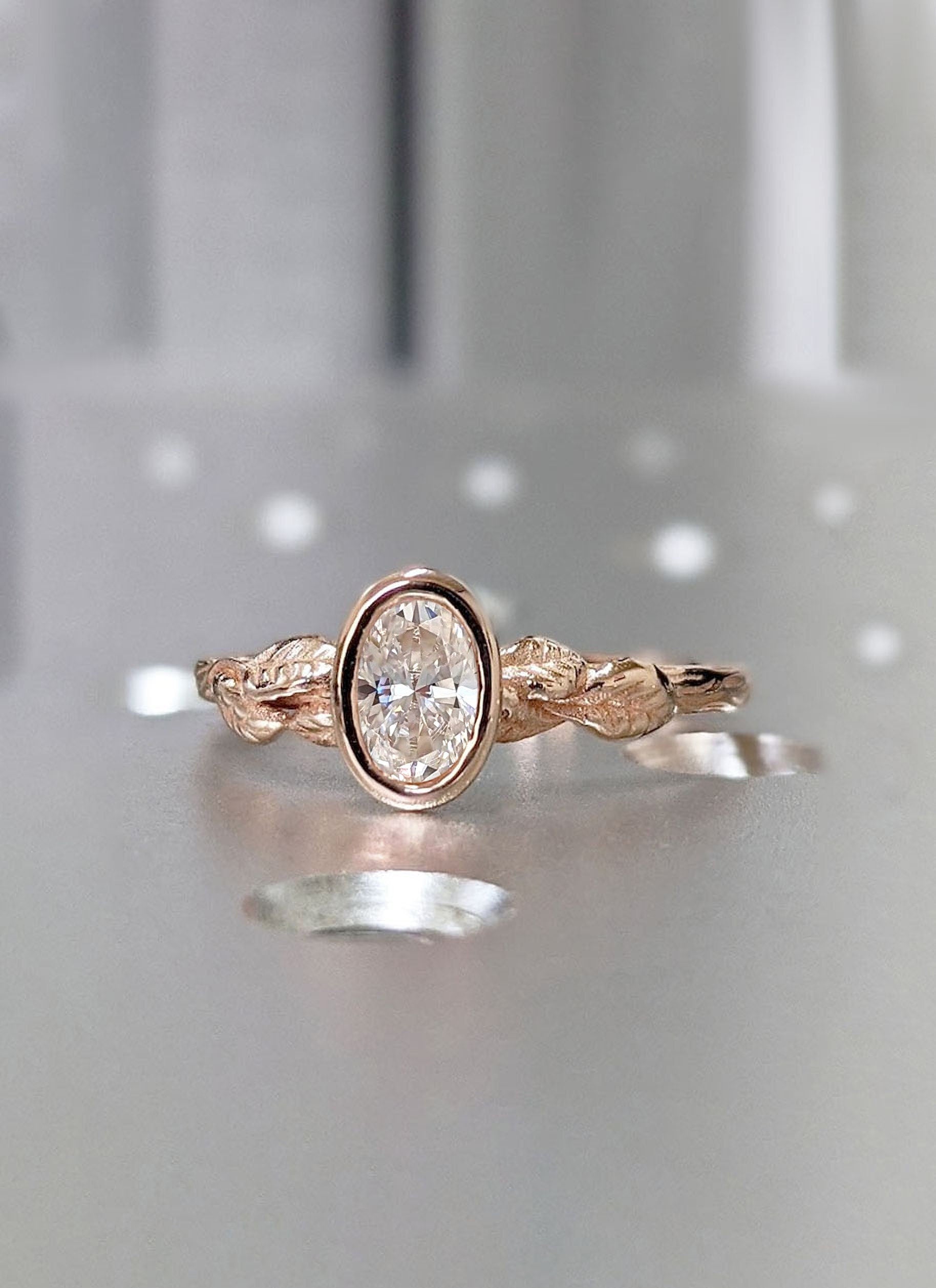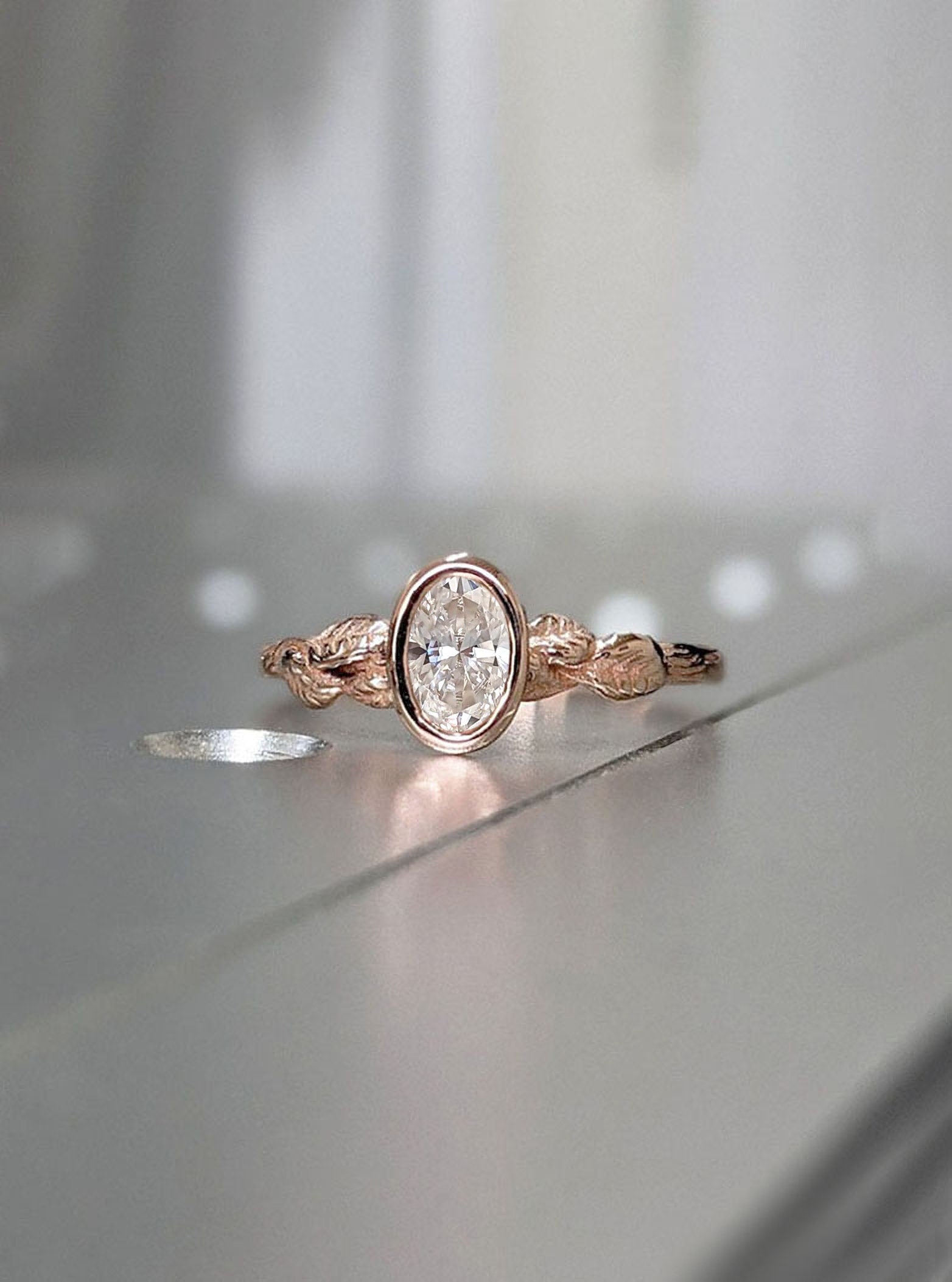 Imbue your love story with the charm of nature through our engagement ring, featuring a brilliant oval center stone that captures the essence of everlasting beauty. The lotus flower leaves delicately wind together, creating an alluring twisted vine that embellishes the crown of this truly one-of-a-kind and romantic ring.