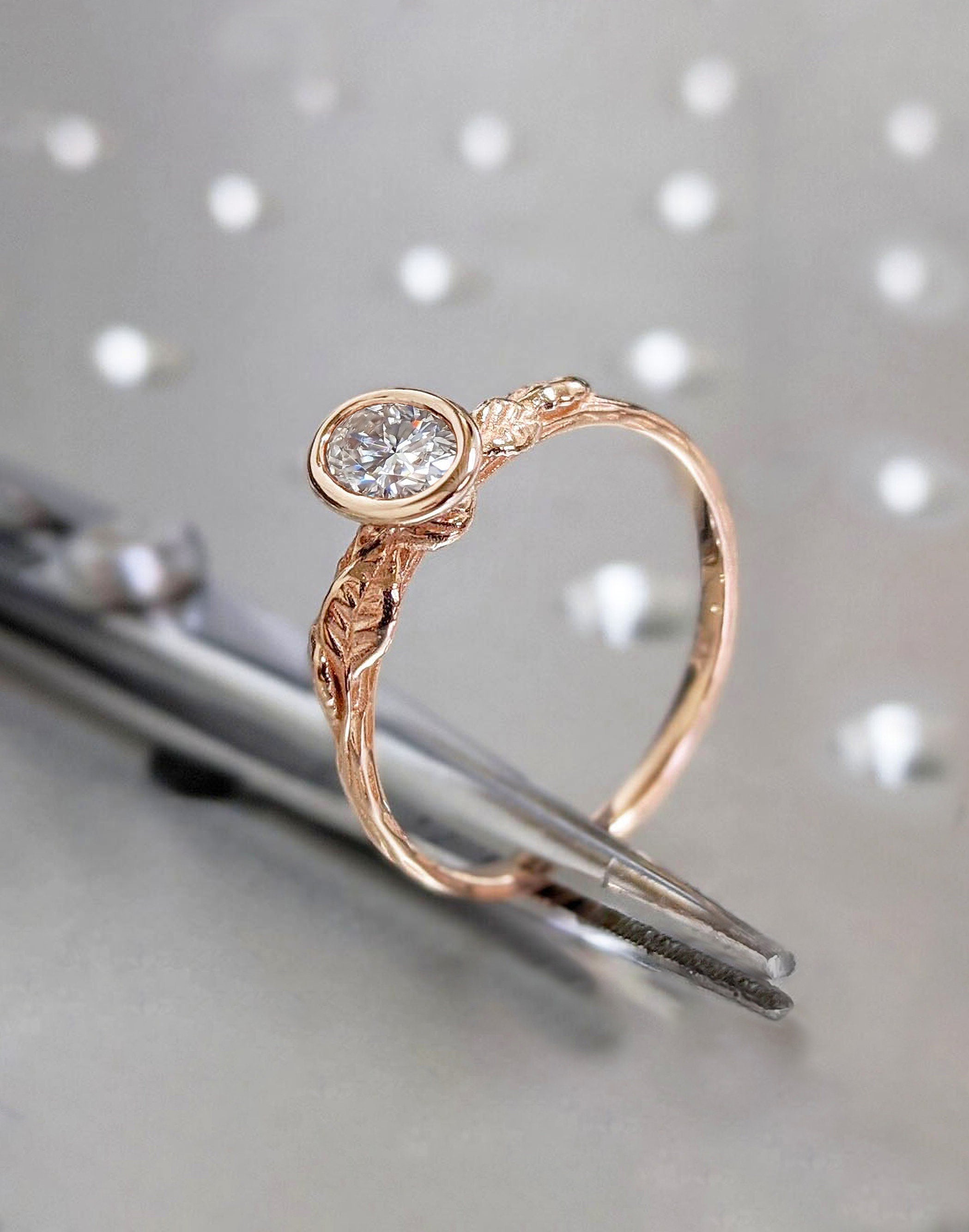 Vintage Moissanite Engagement Ring, Leaf Engraved Band, Nature Inspired Wedding Ring, Organic Wedding Band, Delicate Gold, Engraved Leaves