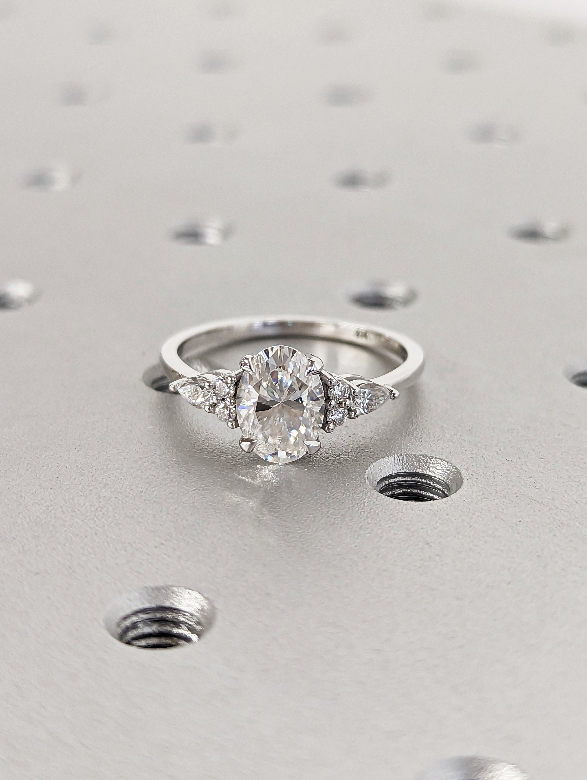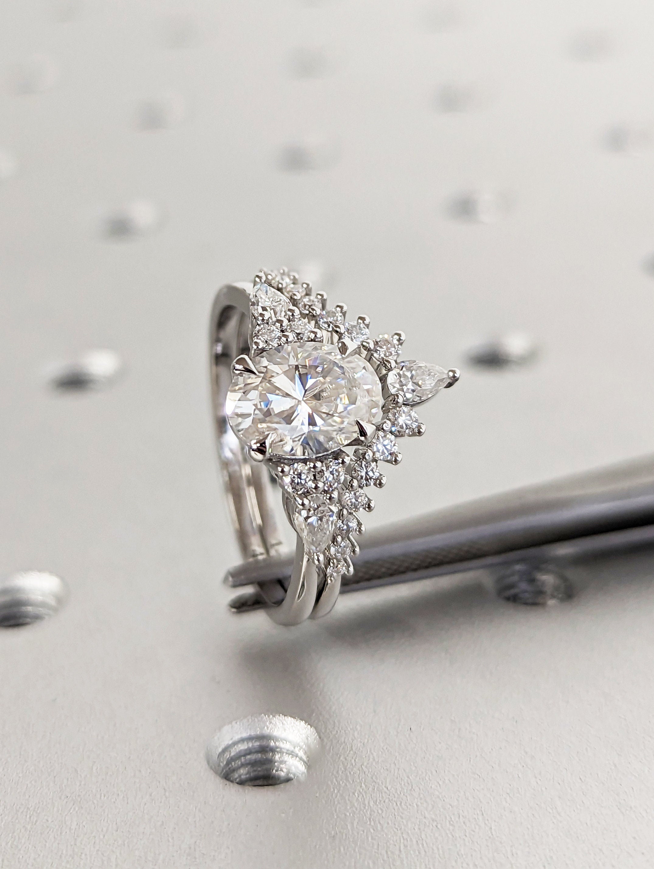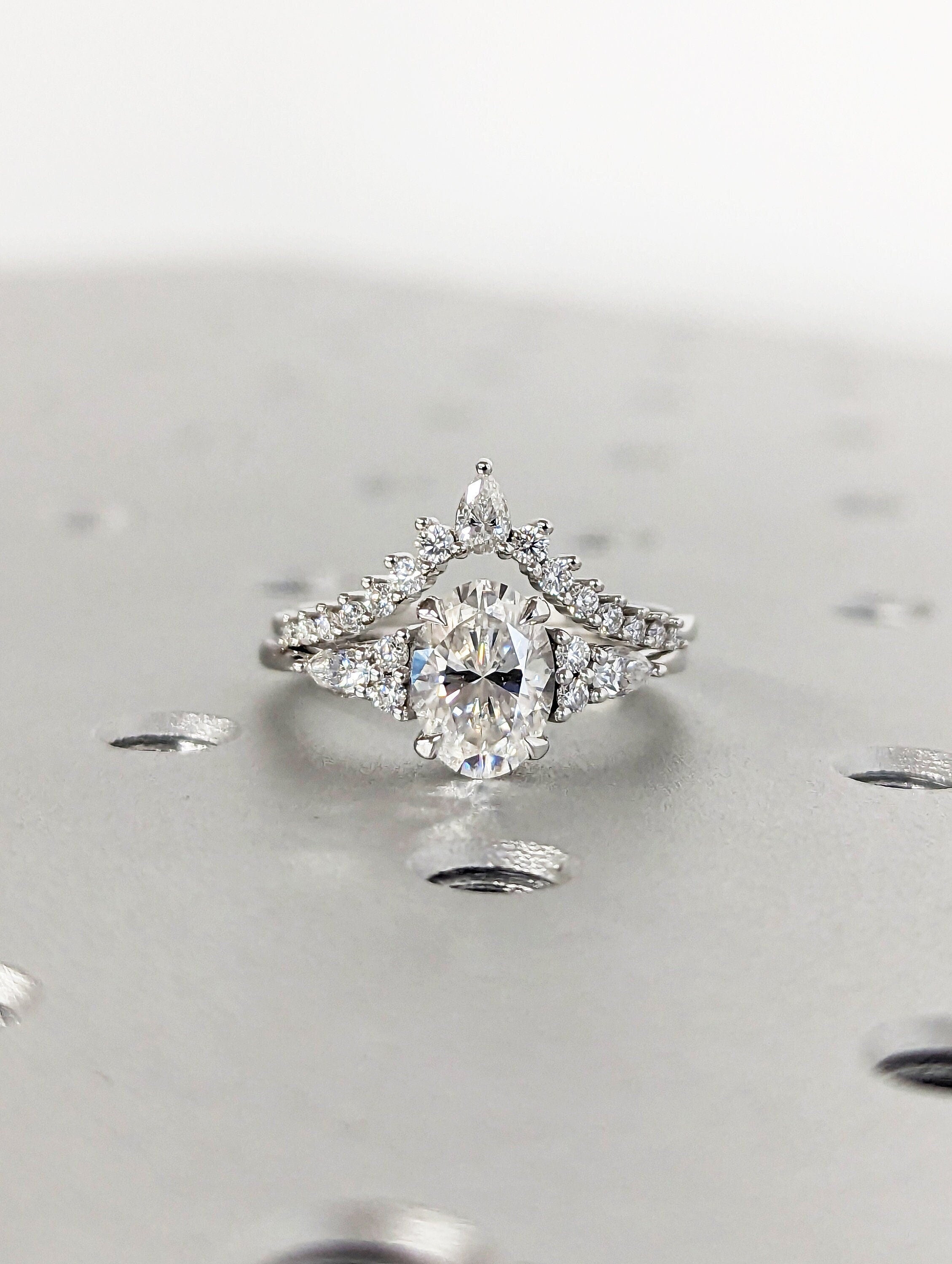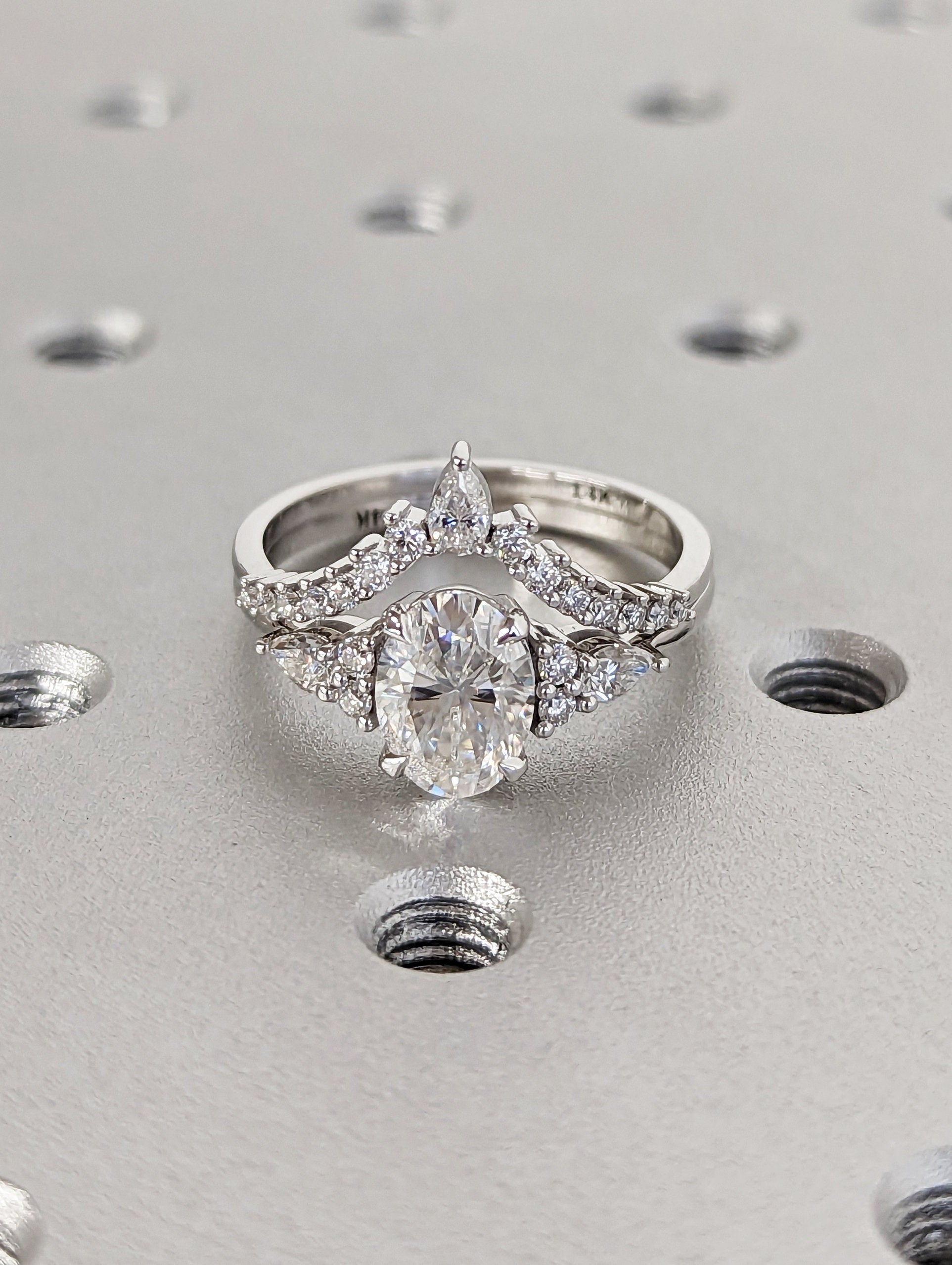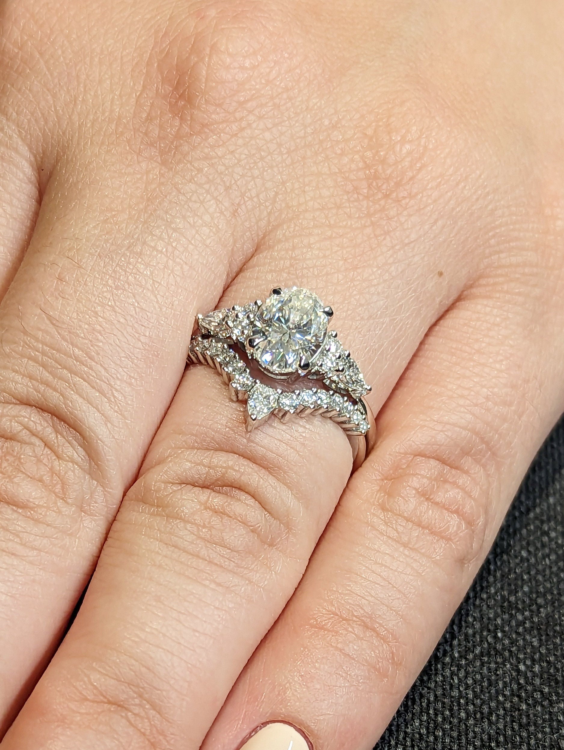 This ornate, vintage-inspired ring features a prong center setting with oval shaped moissanite, highlighted by prong set moissanite on a delicate gold band. Can match with a unique curved moissanite band.
