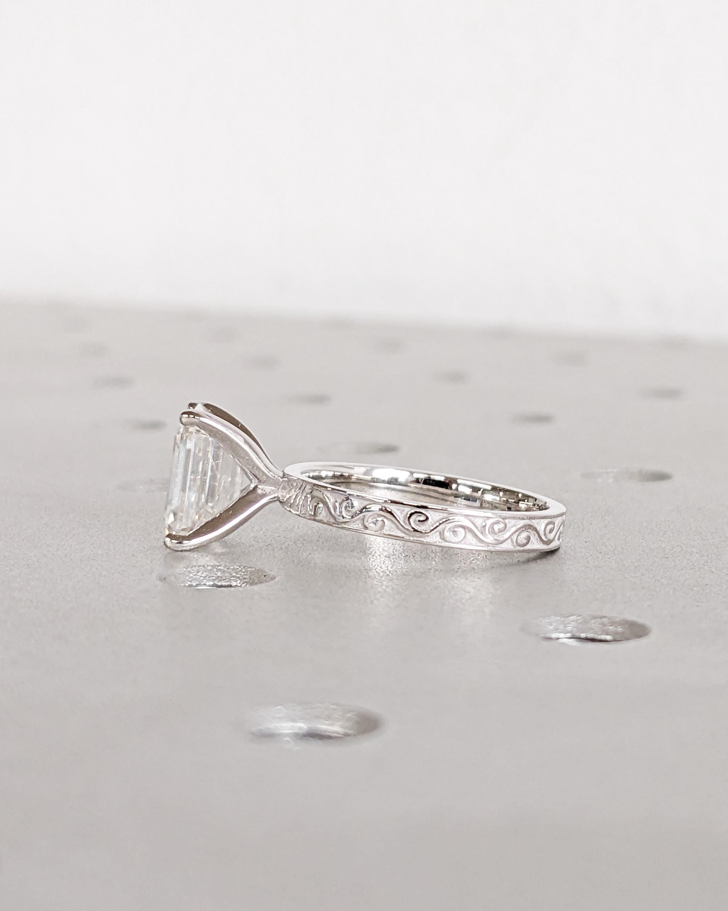 A refined blend of modern geometry and vintage detail. This solitaire ring showcases an emerald-cut Moissanite, set on a distinctive square band. Delicate filigree engraving adds a touch of old-world charm, balancing clean lines with intricate craftsmanship. A timeless piece, with a story in every detail.