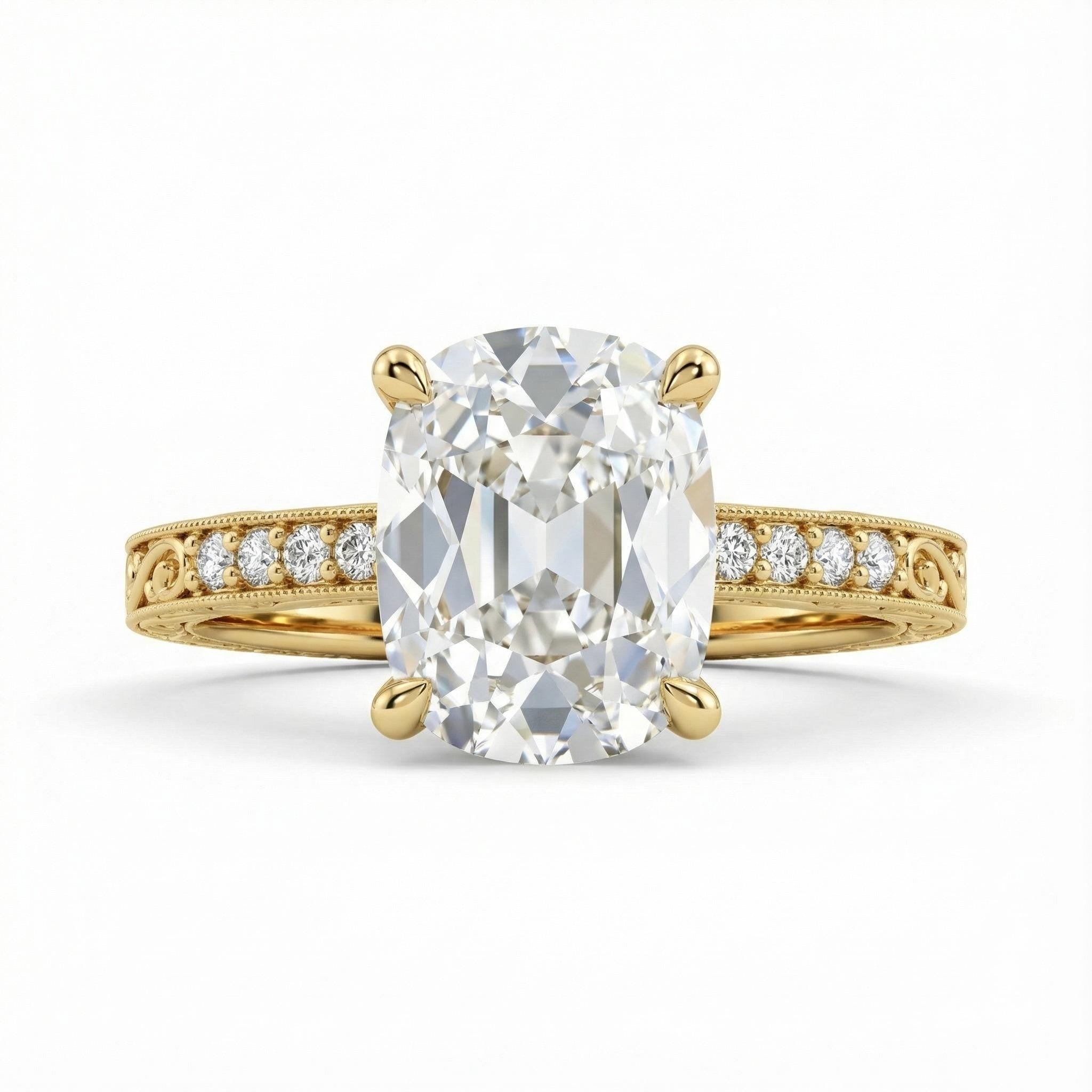 Celebrate love in style with our exquisite engagement ring, showcasing an old mine cut elongated cushion shaped Moissanite center, embraced by a graceful basket prong setting. The brilliance extends to the band, featuring a shared prong paved design with natural diamonds, lab diamonds or moissanites, elegantly enhanced by delicate filigree accents.