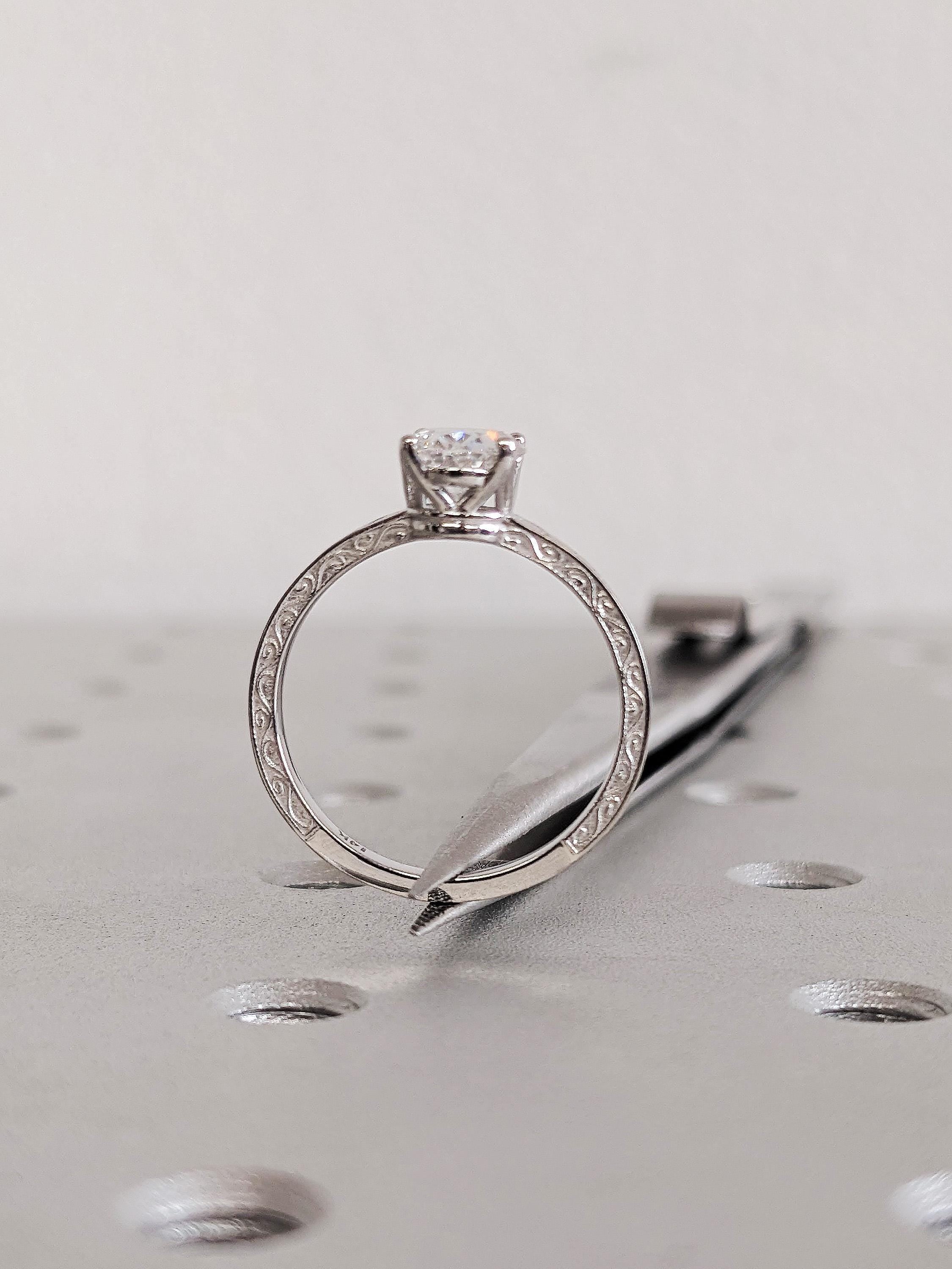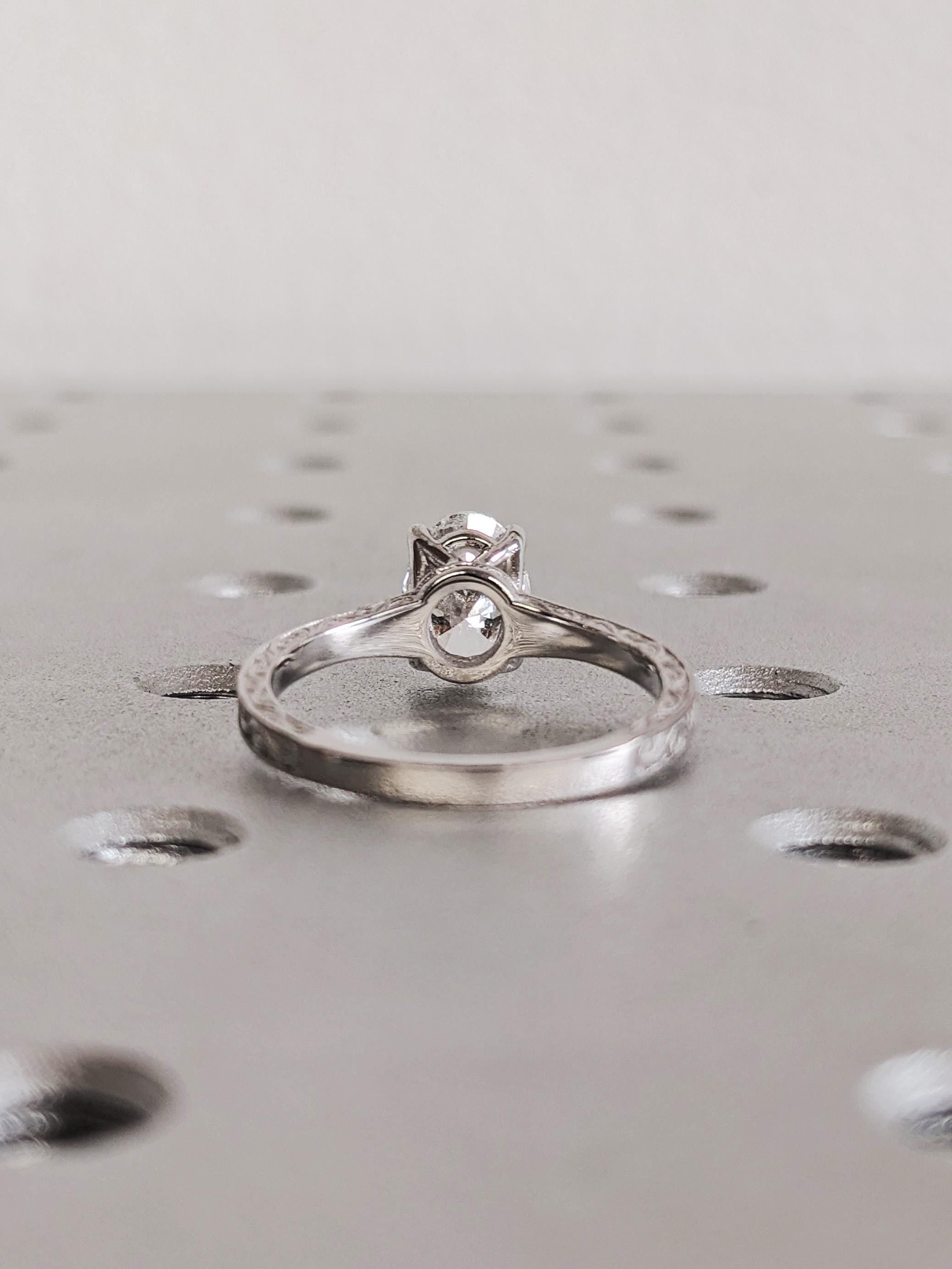 This elegant engagement ring showcases an oval cut Moissanite in a timeless solitaire design. Crafted in gold, the band features intricate filigree detailing that enhances its vintage charm, while the addition of a gallery rail provides extra support and a refined touch of sophistication. A perfect blend of classic beauty and artisan craftsmanship.