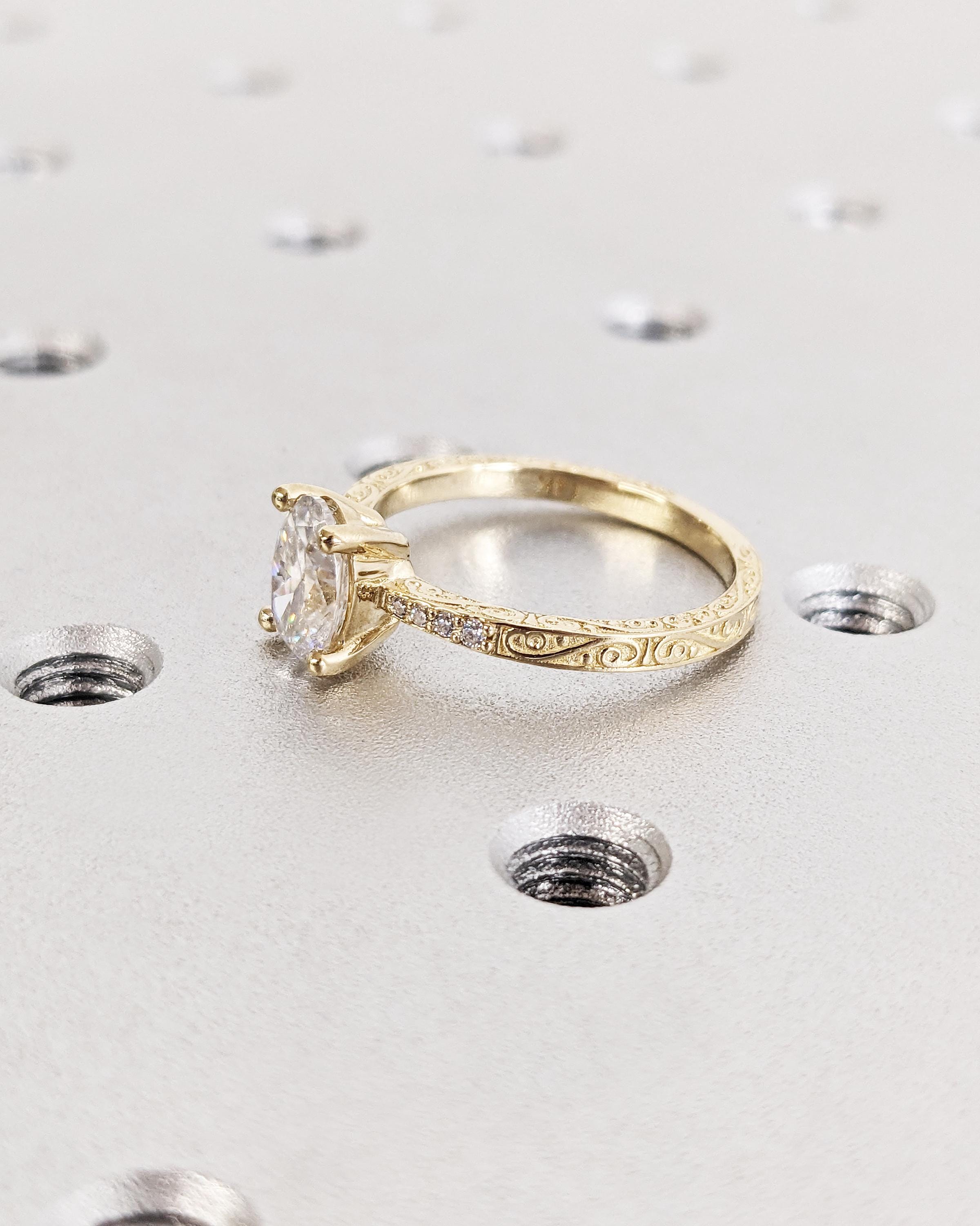 This exquisite handcrafted engagement ring combines vintage charm with modern sophistication, featuring a tapered band that gracefully leads to a solitaire oval cut lab diamond in a basket prong setting. The band is adorned with intricate filigree details and your choice of natural diamond, lab diamond or moissanite side stones.