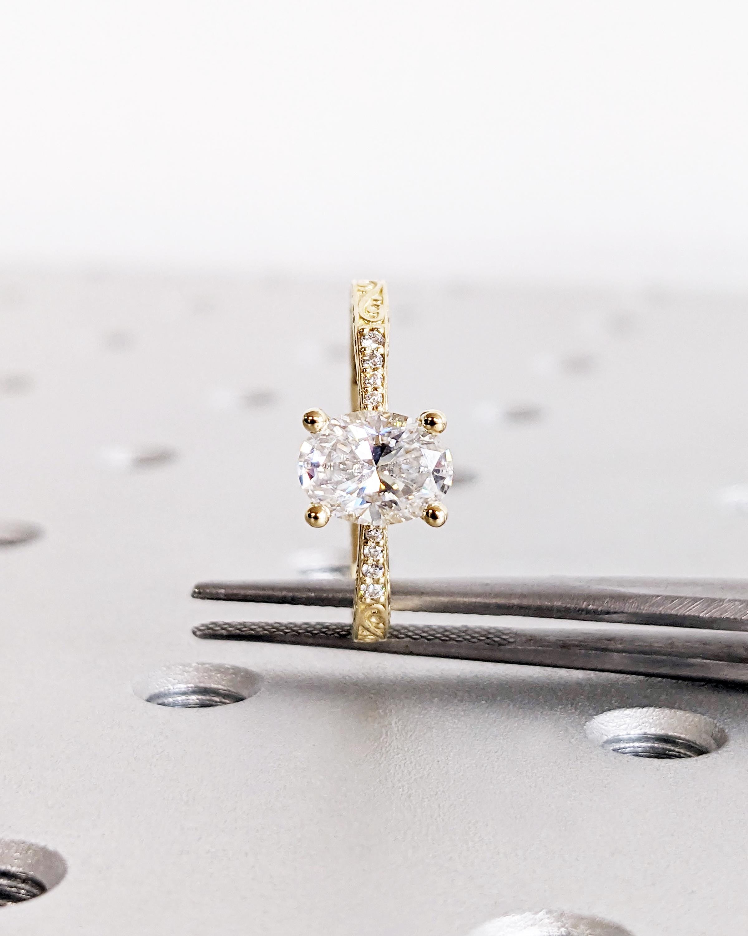 This exquisite handcrafted engagement ring combines vintage charm with modern sophistication, featuring a tapered band that gracefully leads to a solitaire oval cut moissanite in a basket prong setting. The band is adorned with intricate filigree details and your choice of natural diamond, lab diamond or moissanite side stones.