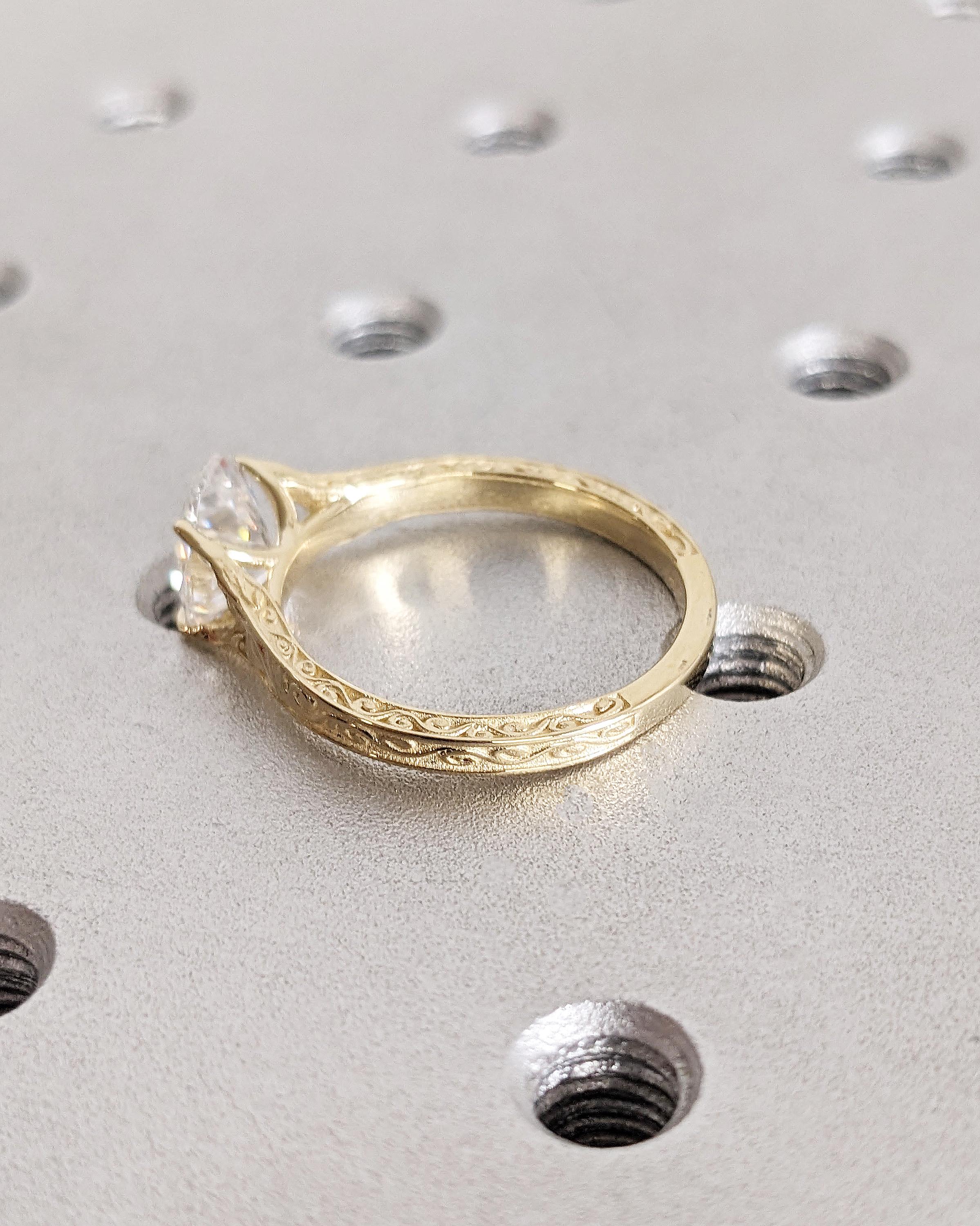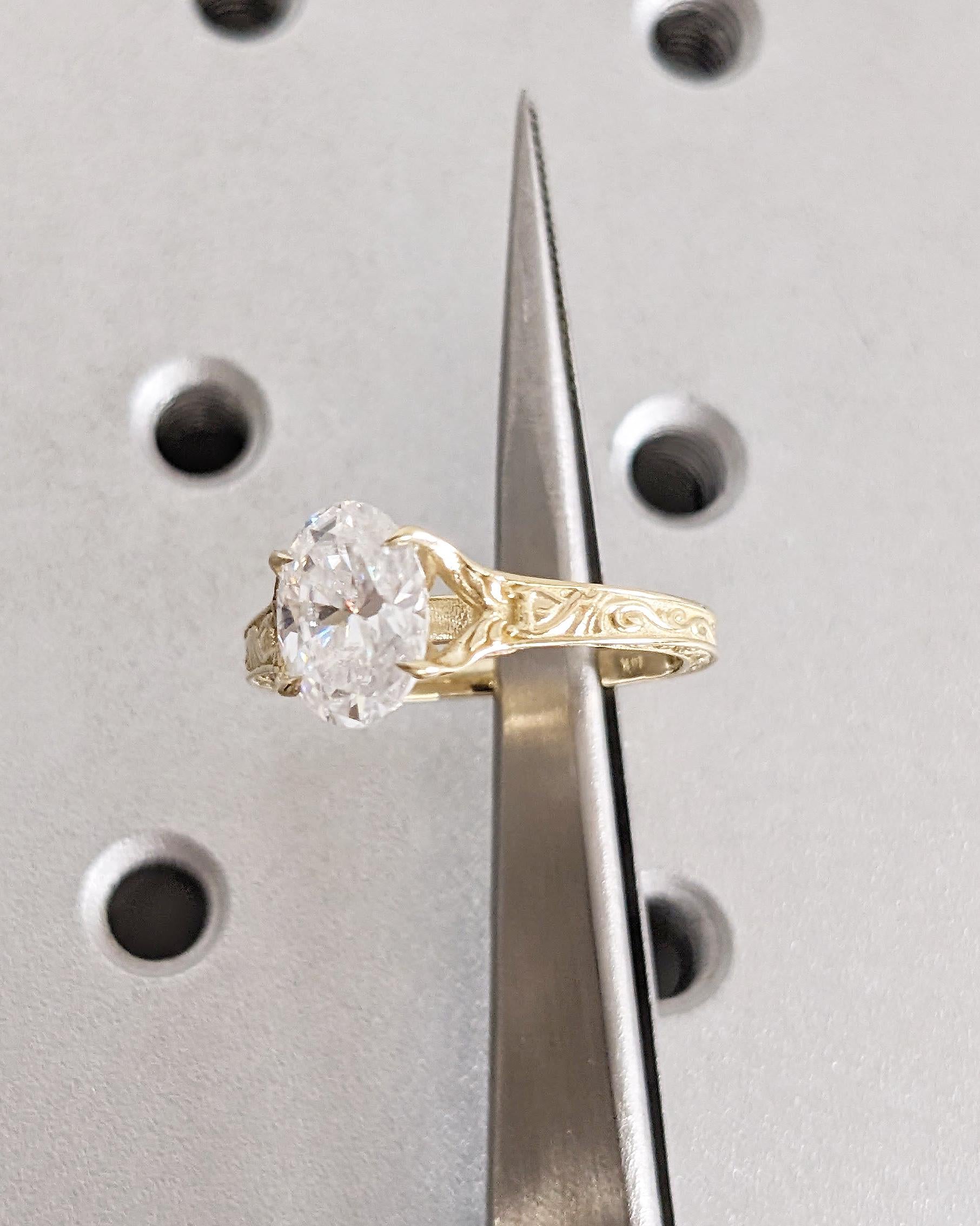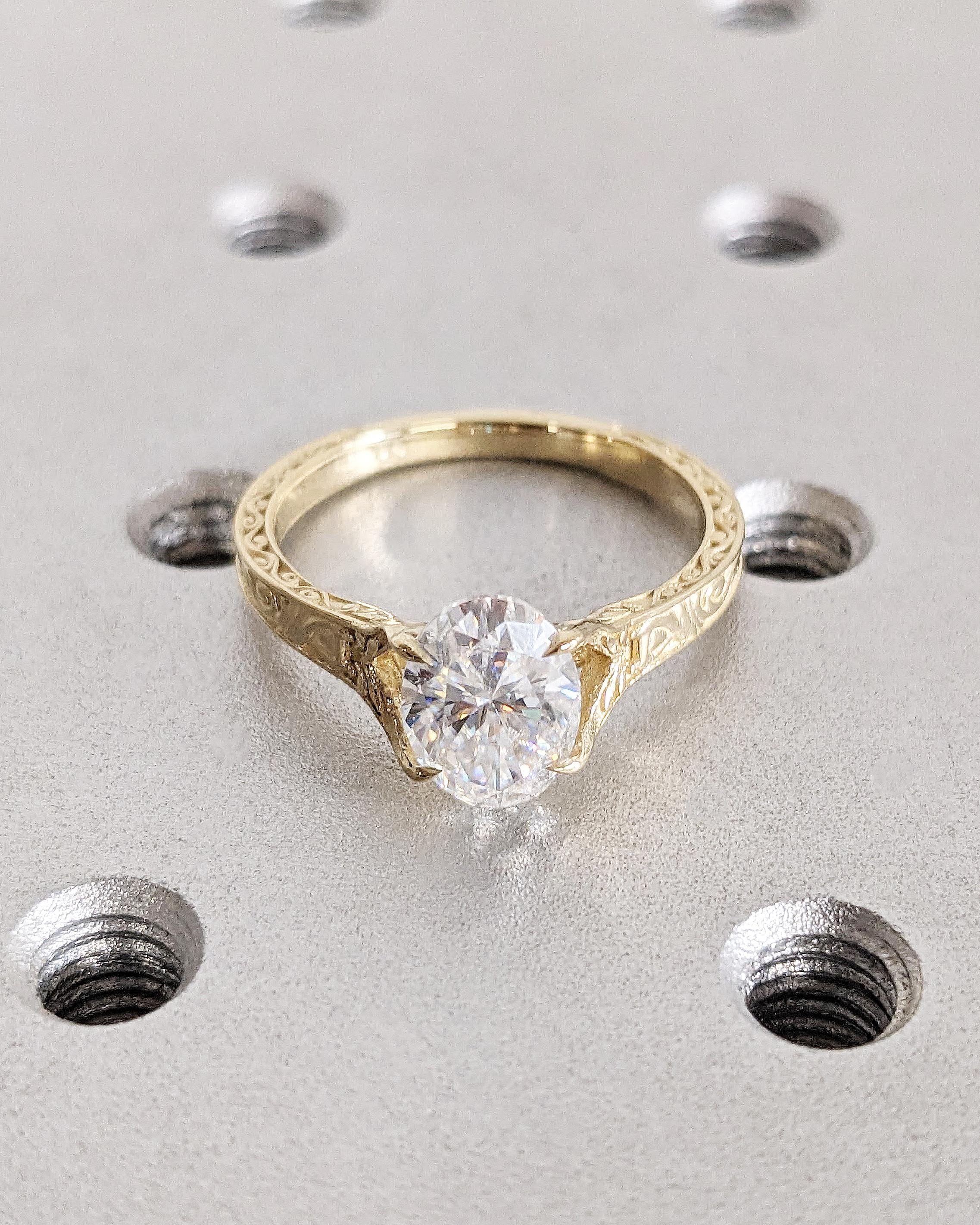 Vintage Oval Lab Diamond Engagement Ring, Custom Filigree Engraved Band, 14K Yellow Gold Talon Prong Wedding Ring