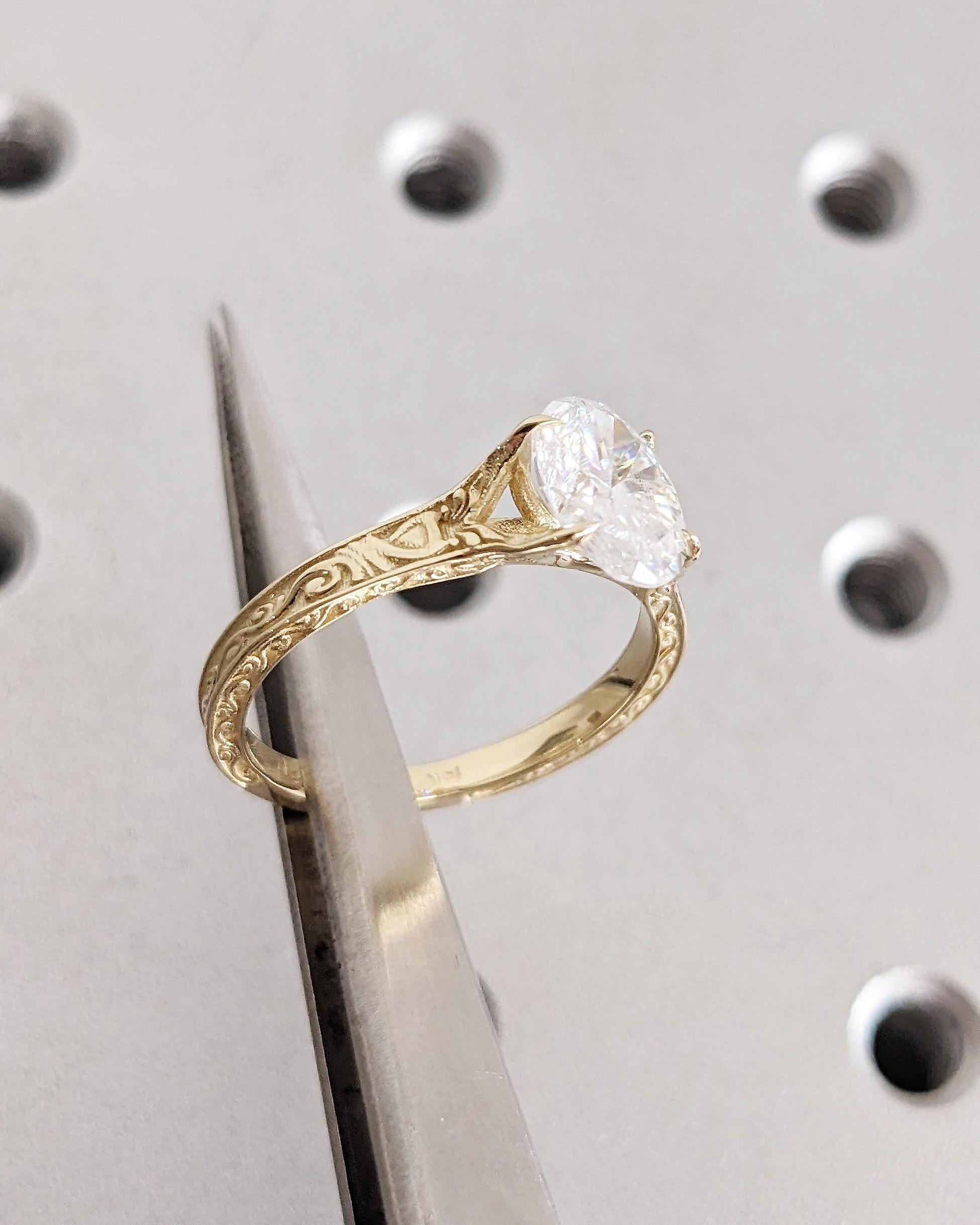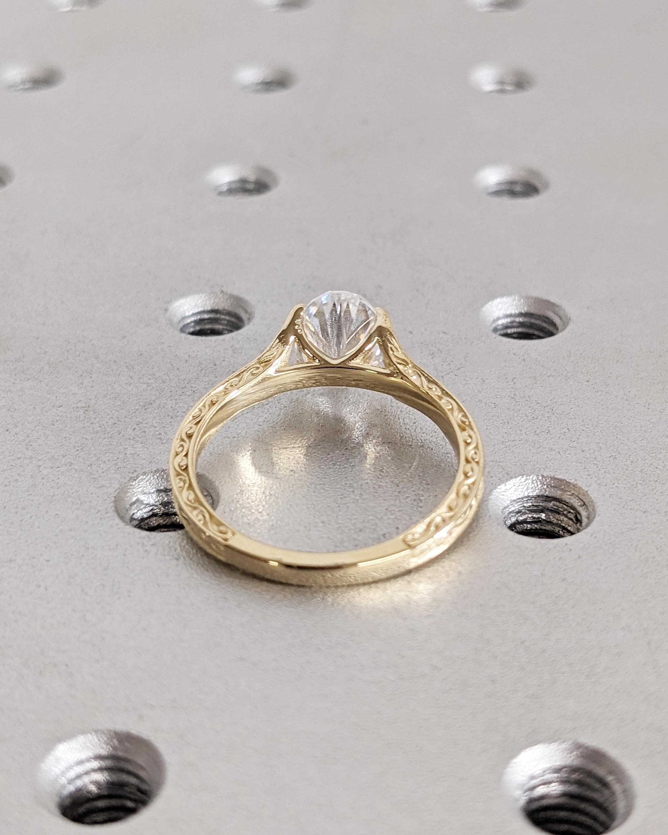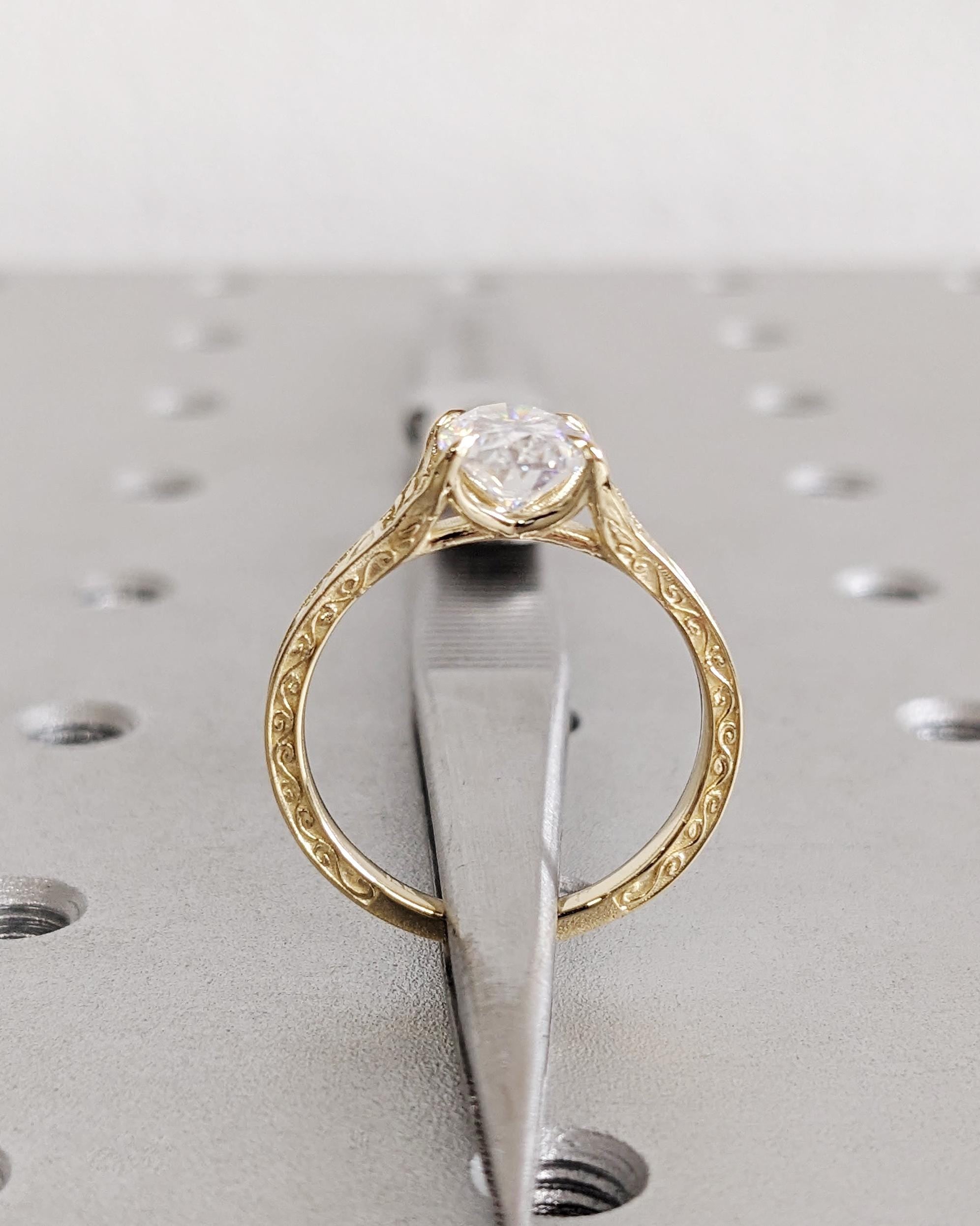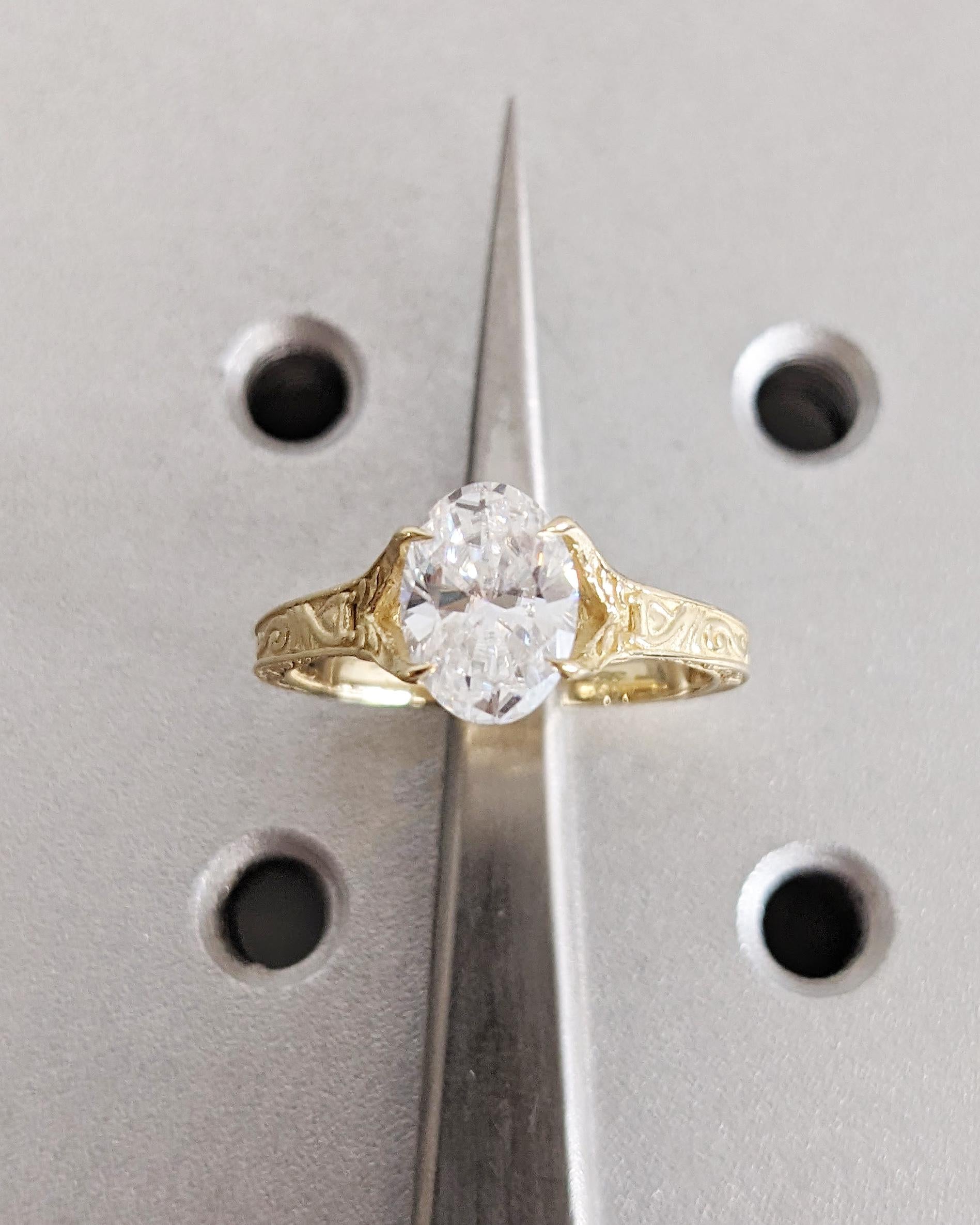 Vintage Oval Lab Diamond Engagement Ring, Custom Filigree Engraved Band, 14K Yellow Gold Talon Prong Wedding Ring