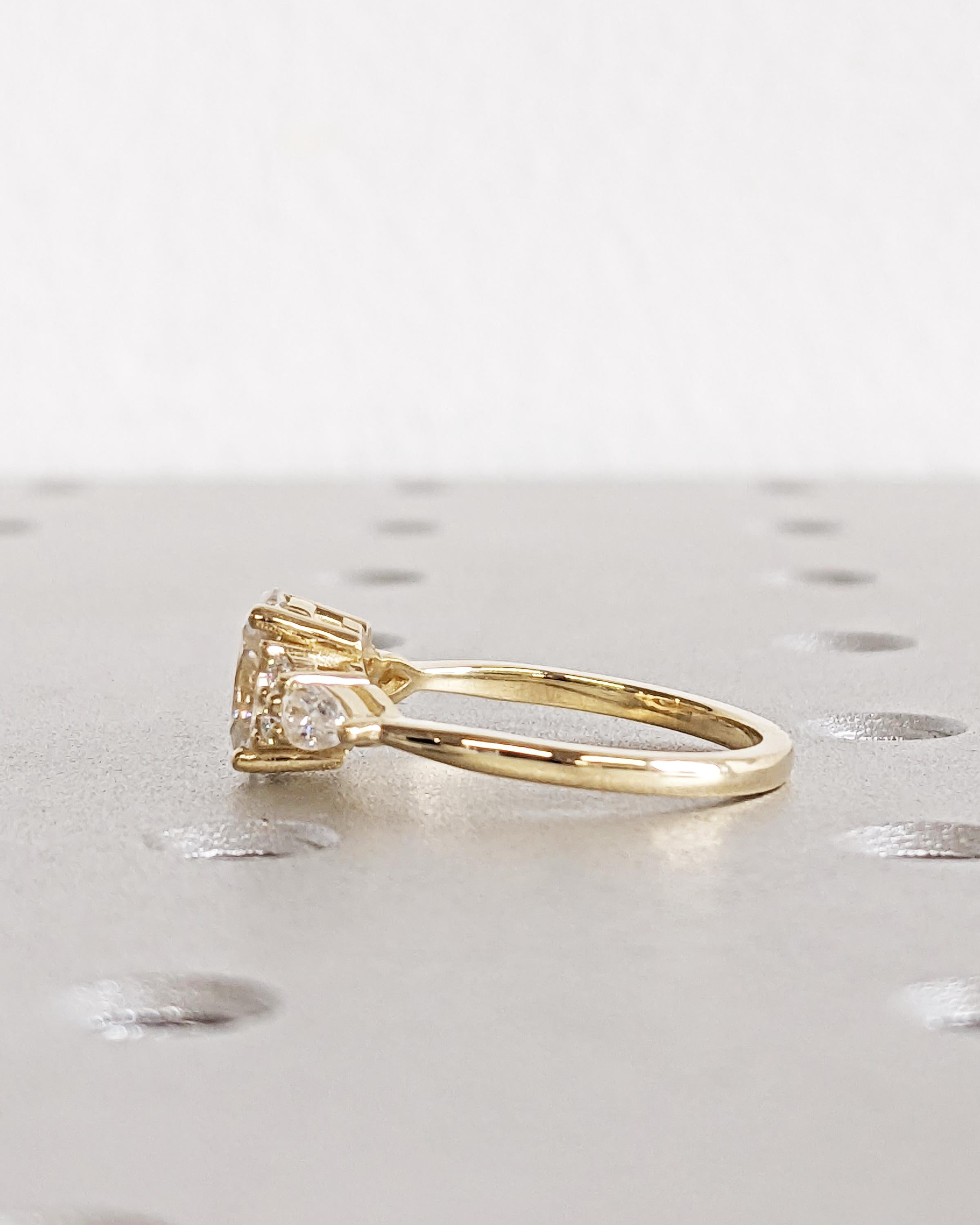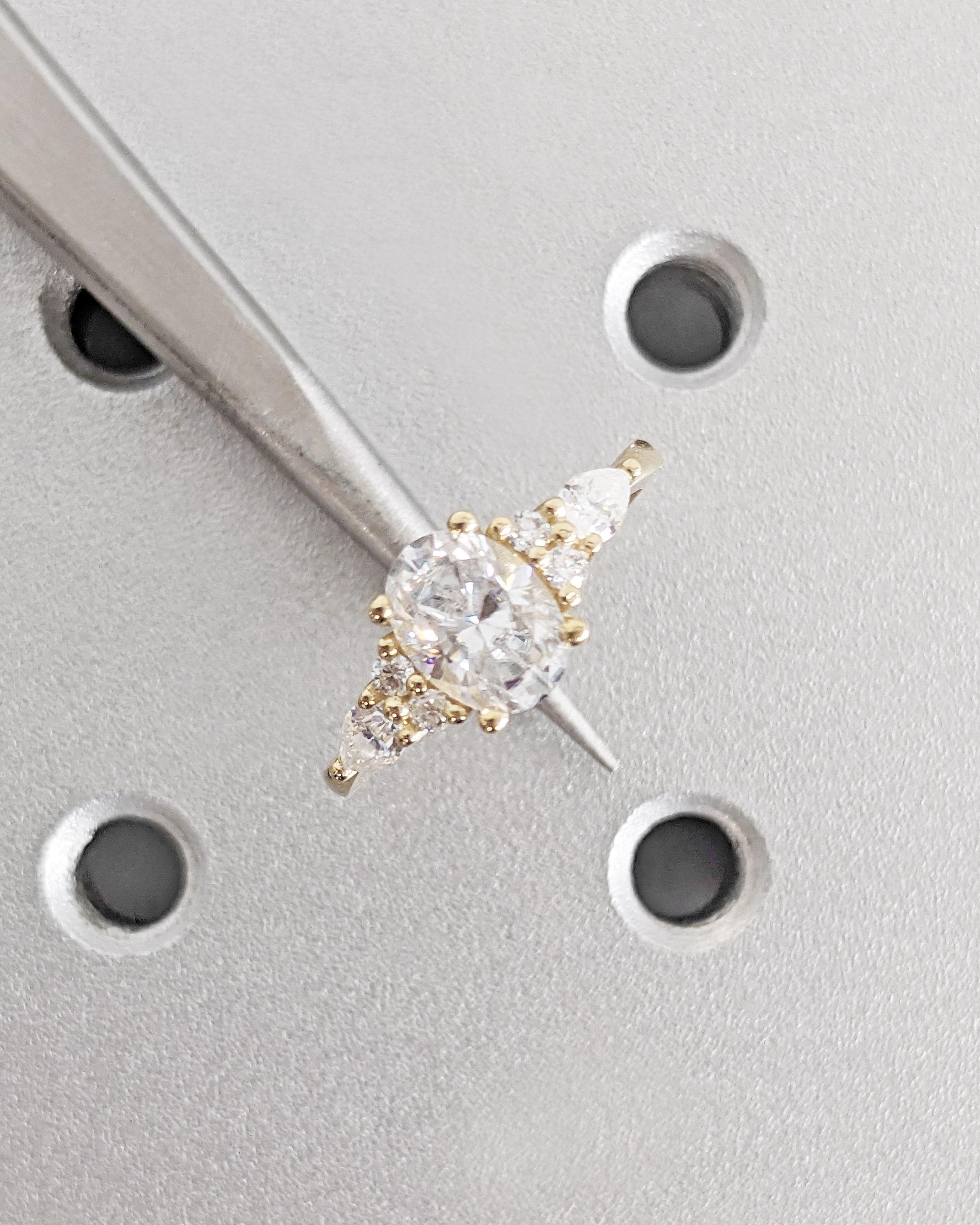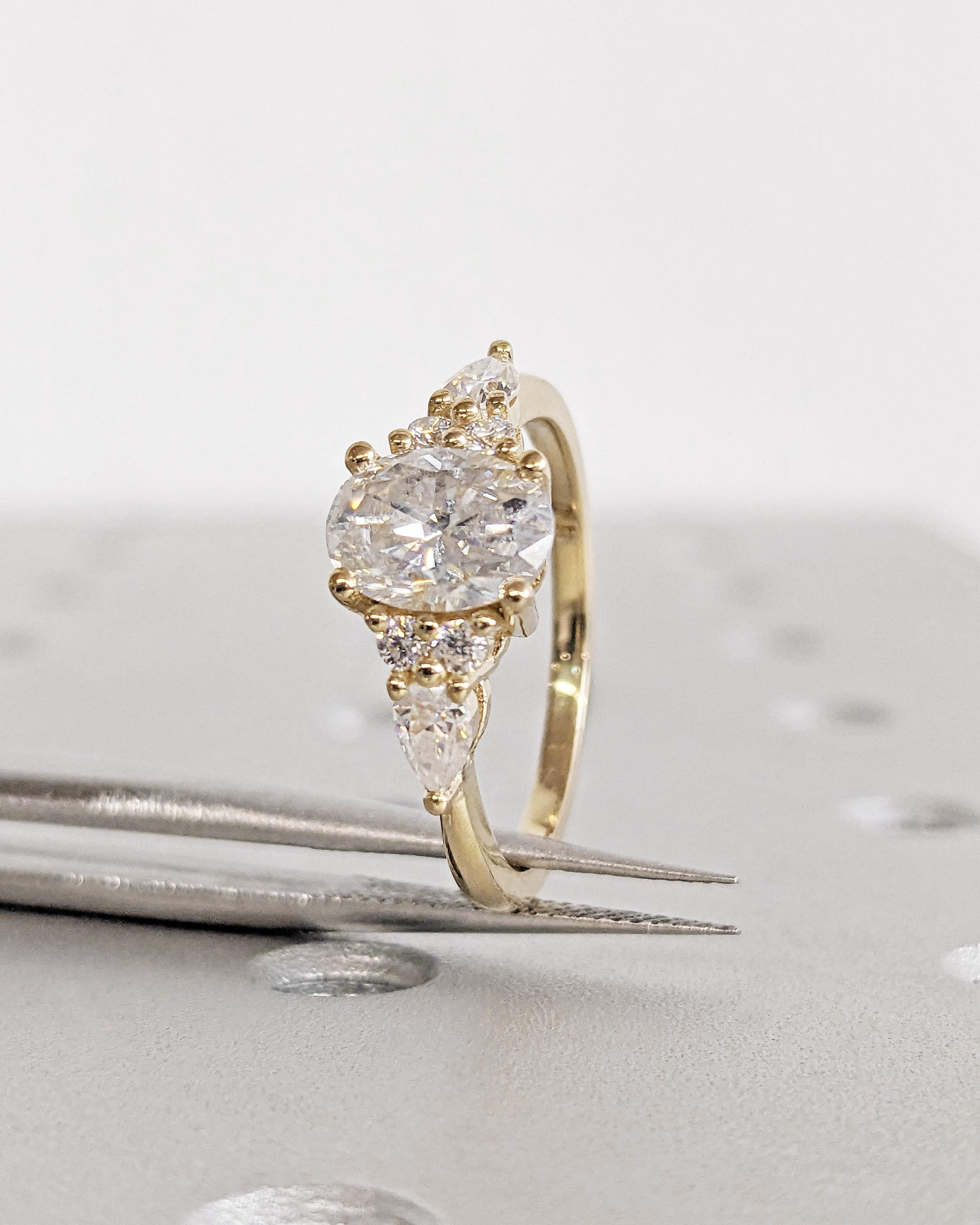 Vintage Oval Lab Diamond Engagement Ring: IGI Certified Lab Grown Diamond, Pear and Round Cluster Art Deco Wedding Ring, 14K Yellow Gold