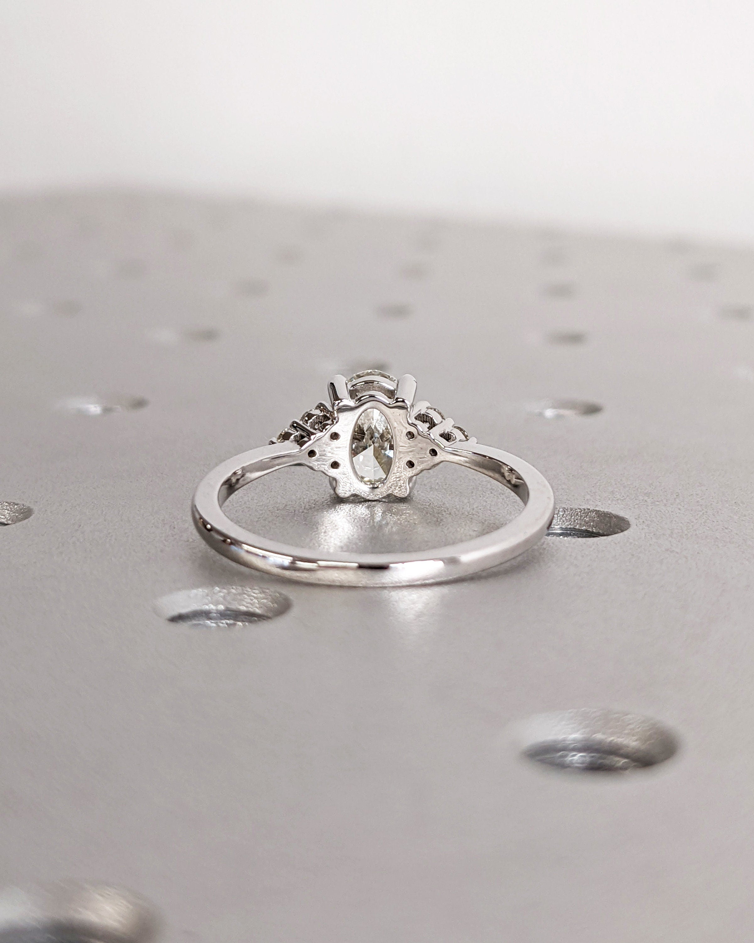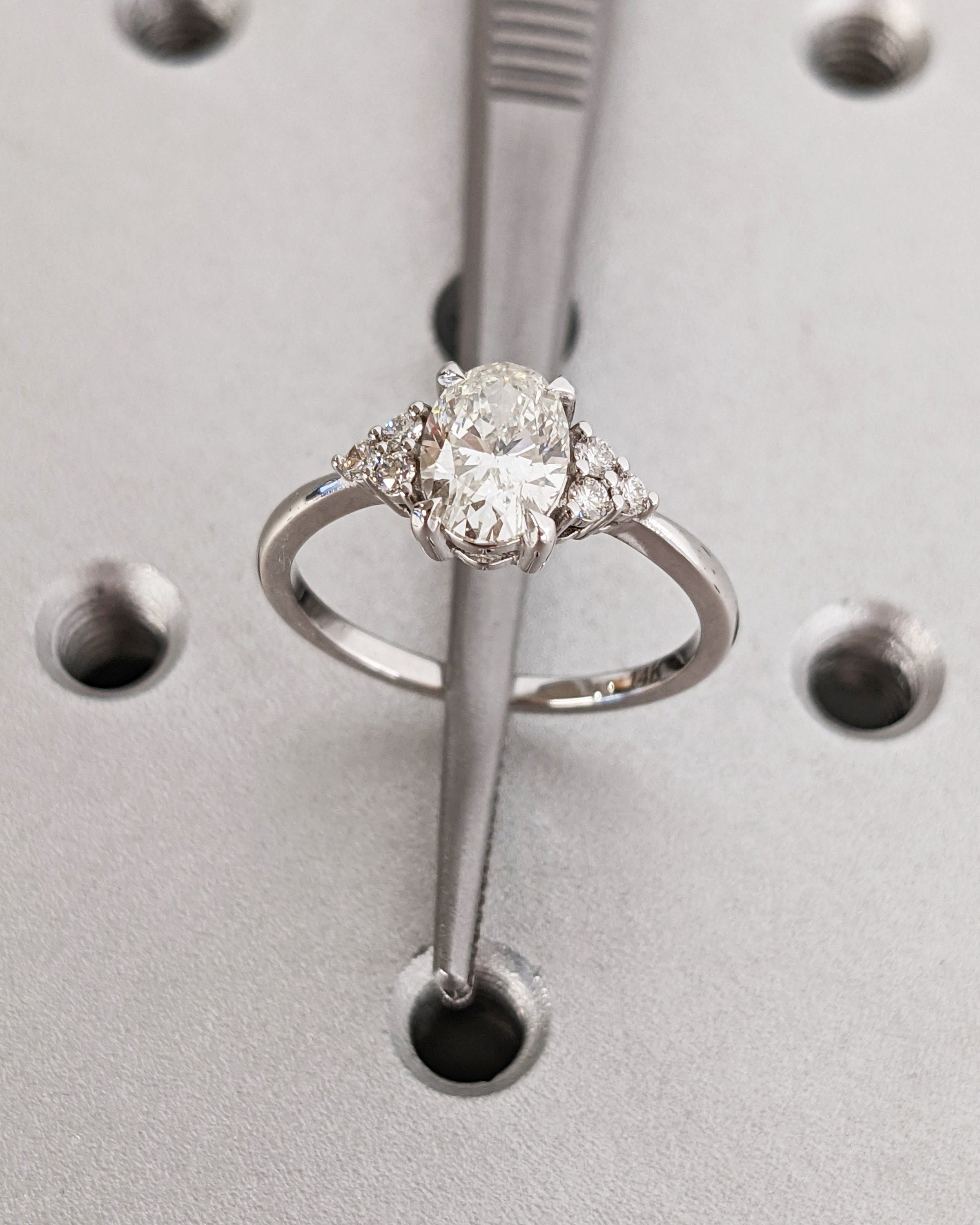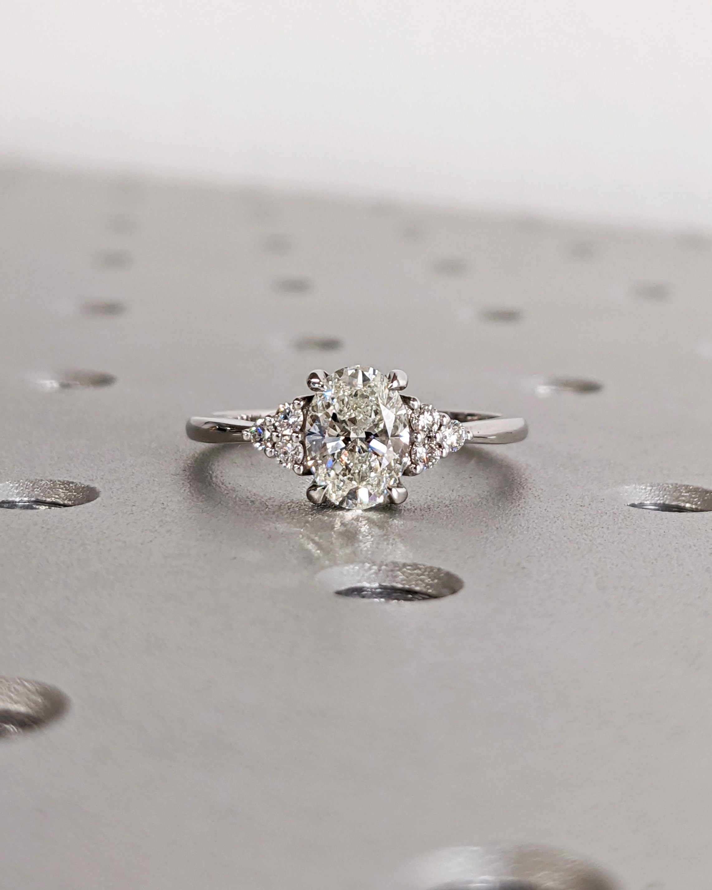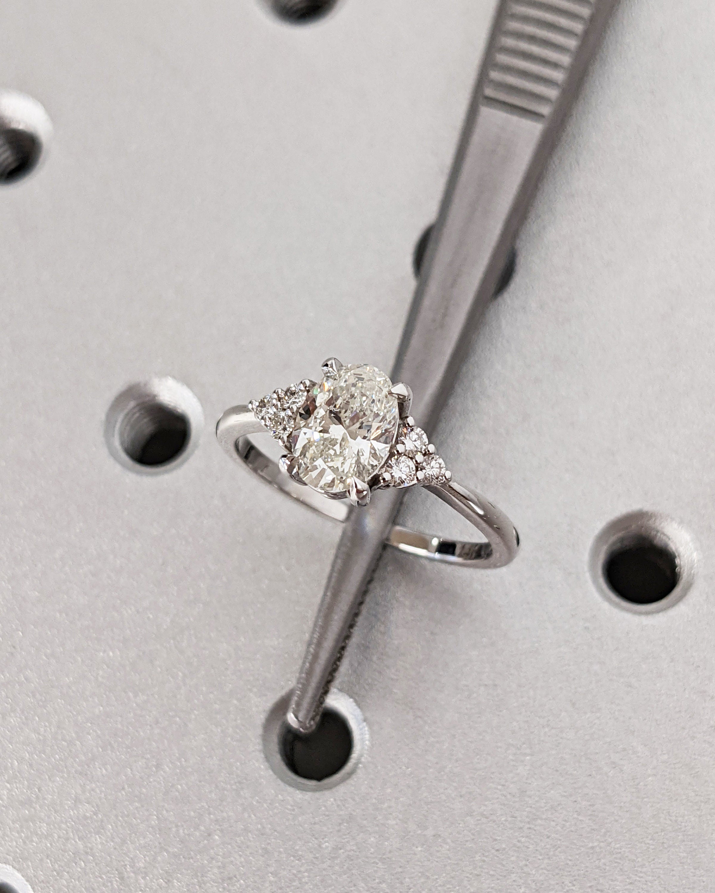A classic piece of handmade jewelry, this dainty ring features an oval cut Lab Diamond center, accented by cluster of round cut side stones in your choice of natural diamonds, man made diamonds or moissanites. Its slender 1.6mm width band gives it a refined appearance, elegant for any special occasion.