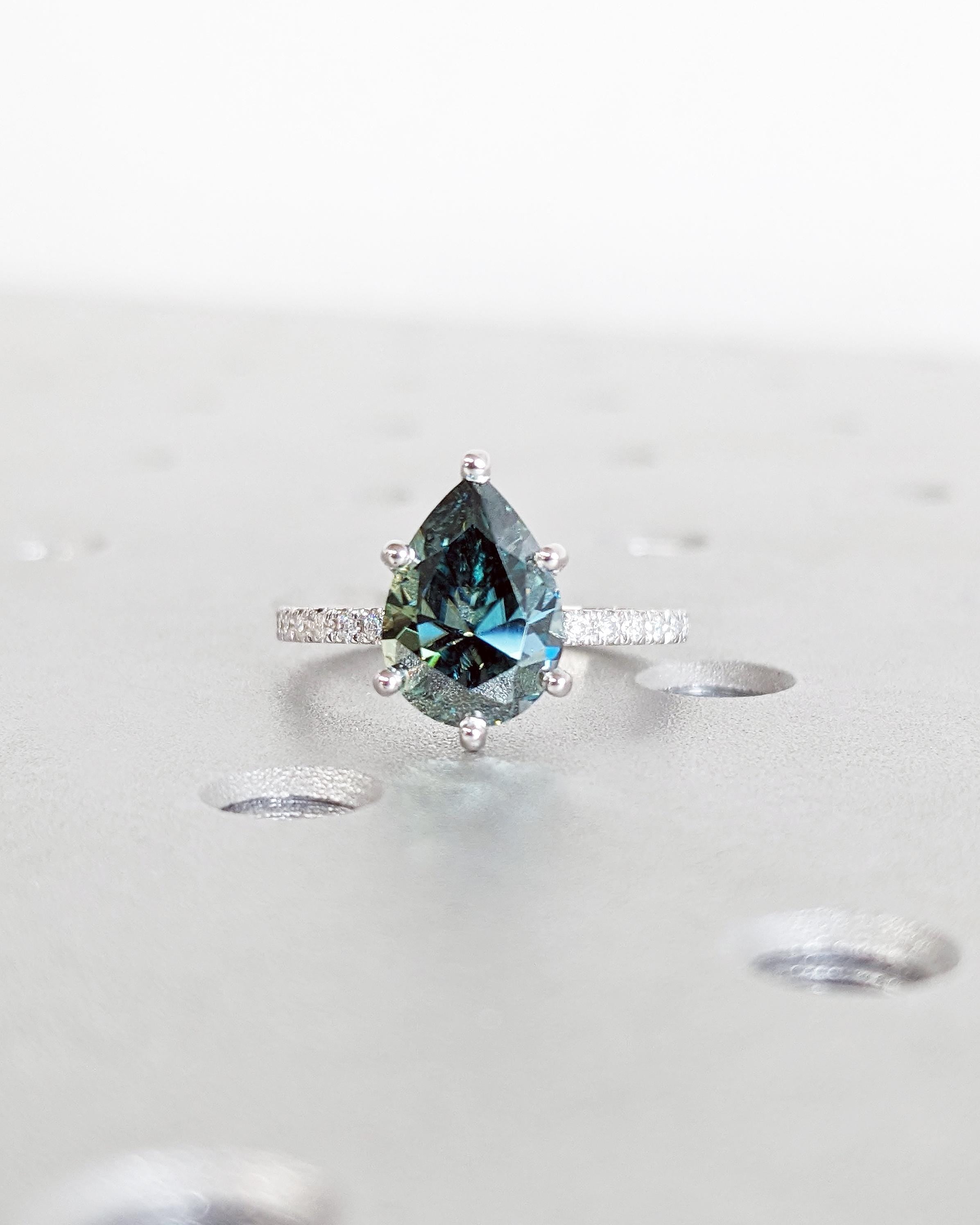 Vintage Pear Cut Blue Green Moissanite Engagement Ring, Diamond Hidden Halo Ring, Half Eternity Pave Band, 14K White Gold