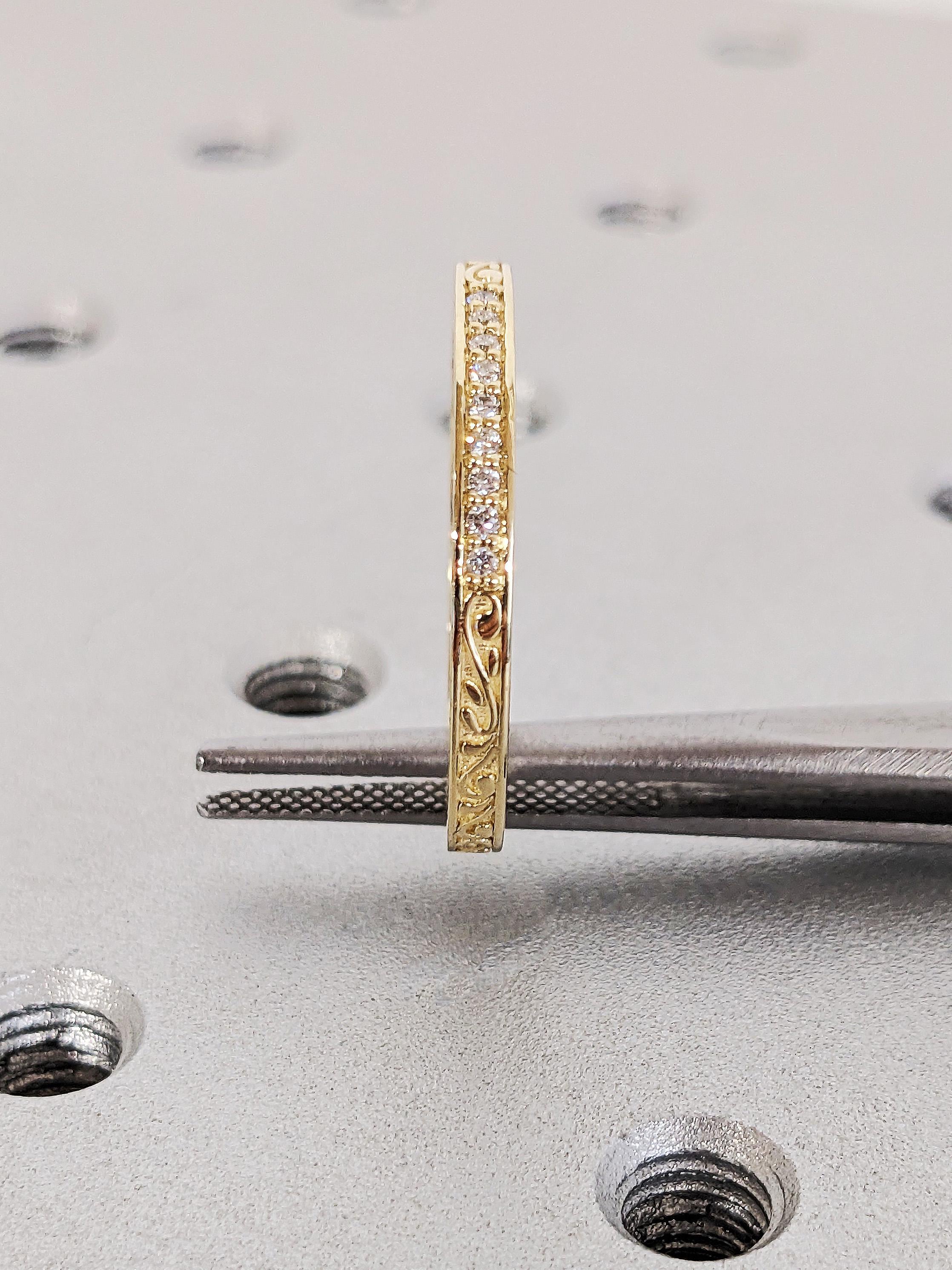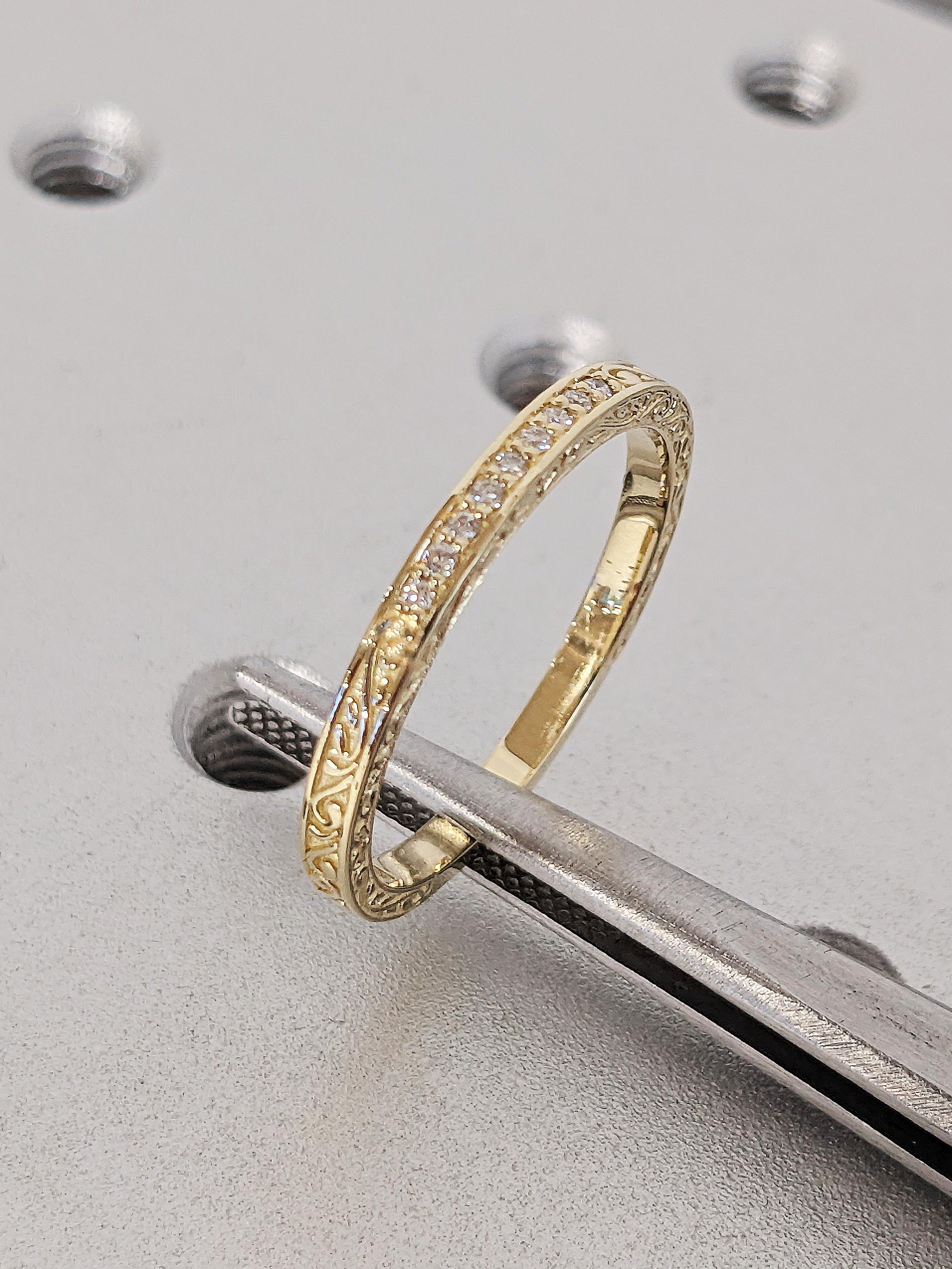This vintage wedding band features intricate filigree detailing and a thin band adorned with dainty round Diamonds in a pavé setting. With its timeless craftsmanship and elegant design, it’s perfect for wearing alone, paired with an engagement ring or stacked with other favorites