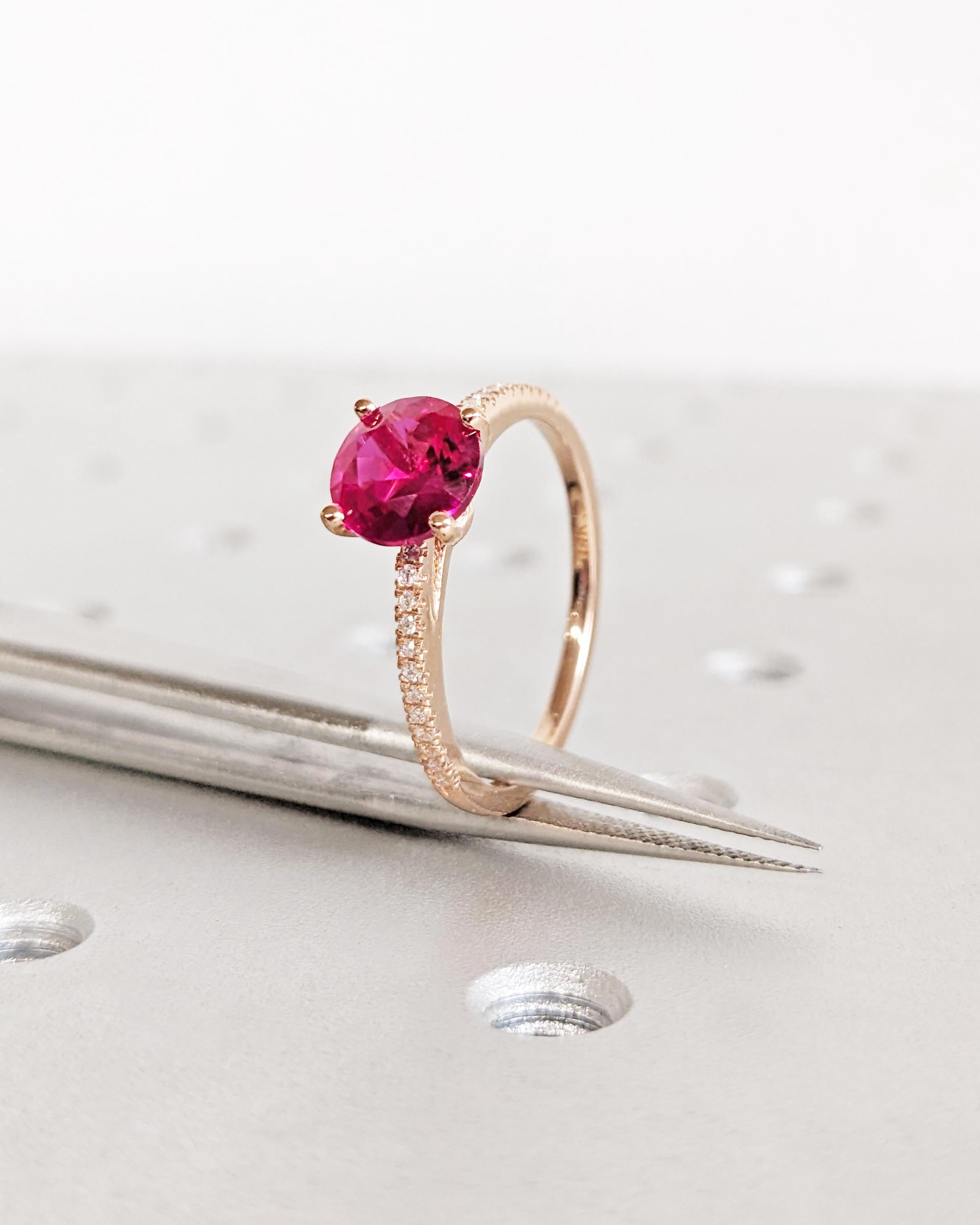 Vintage Ruby and Diamond Engagement Ring for Women | 14K Rose Gold Lab Created Ruby Ring | Cathedral Setting, High Profile Prongs, Pavé Band