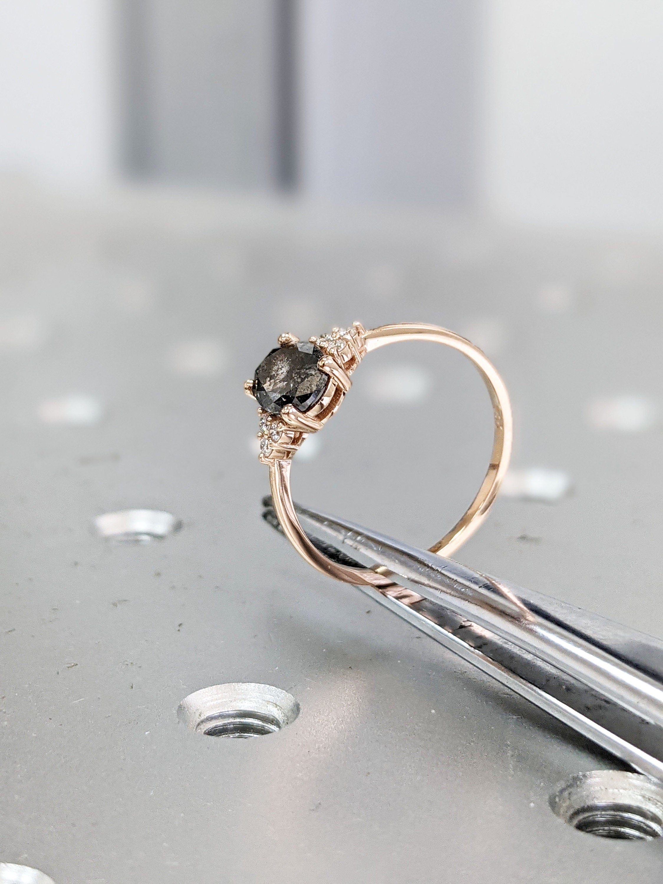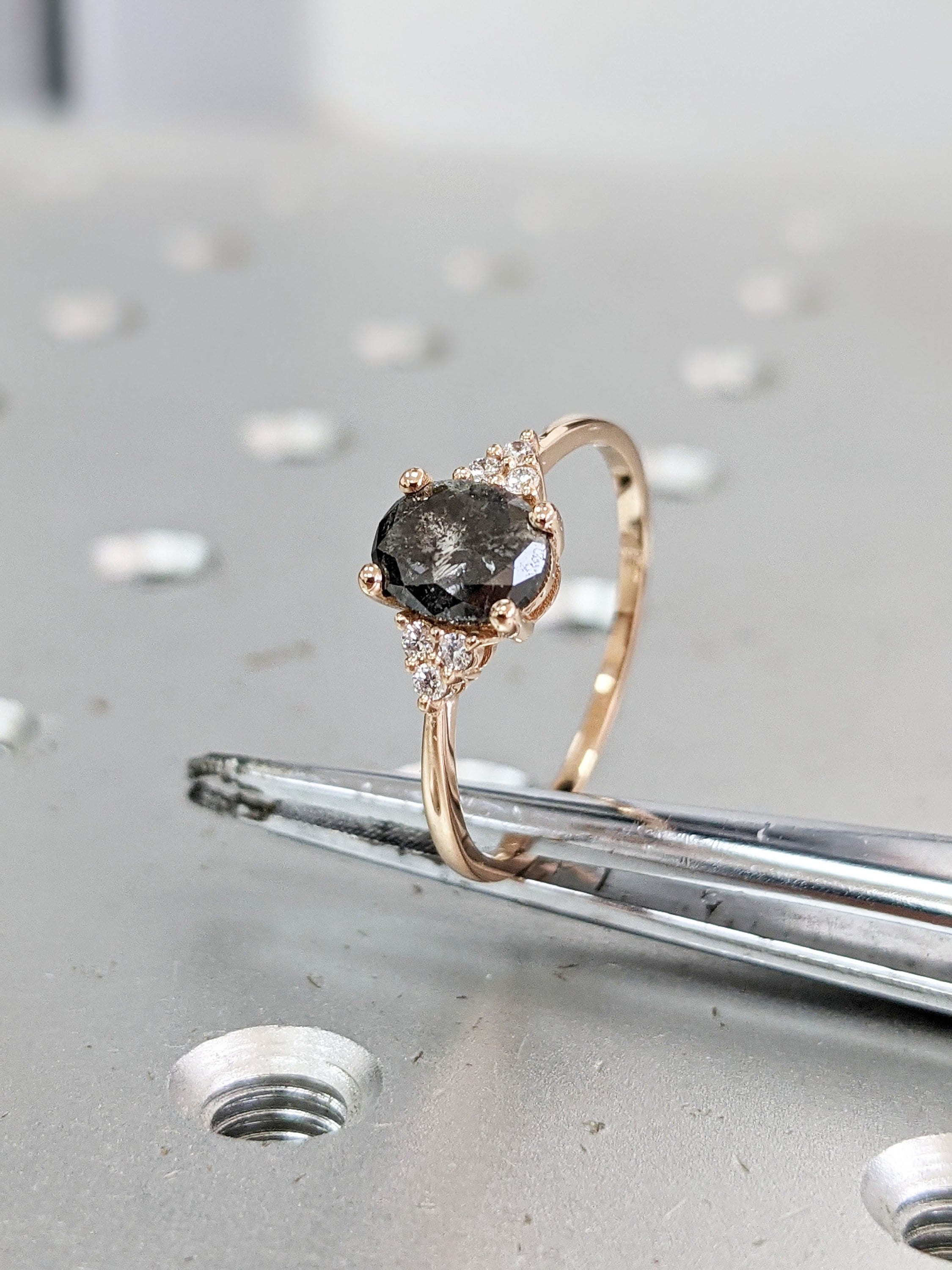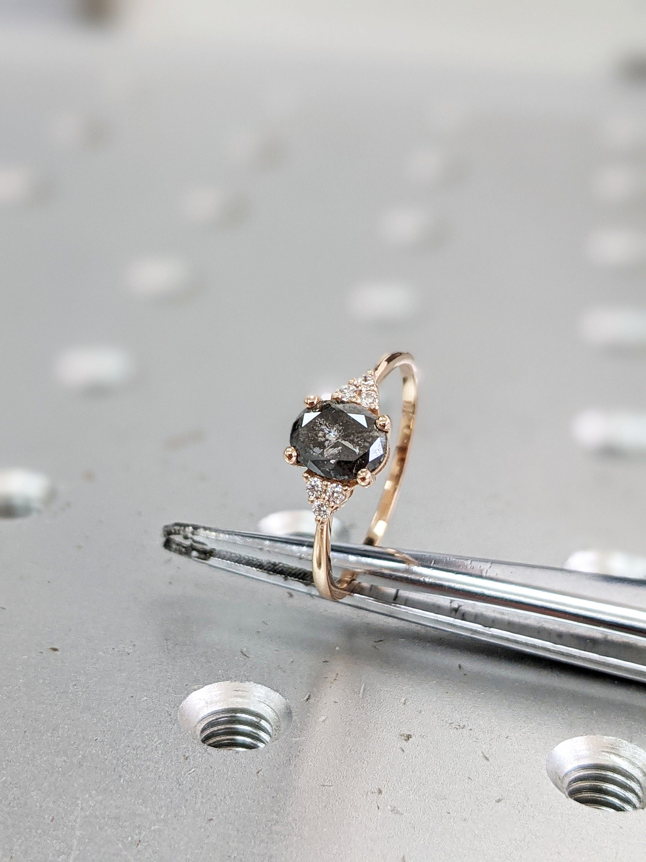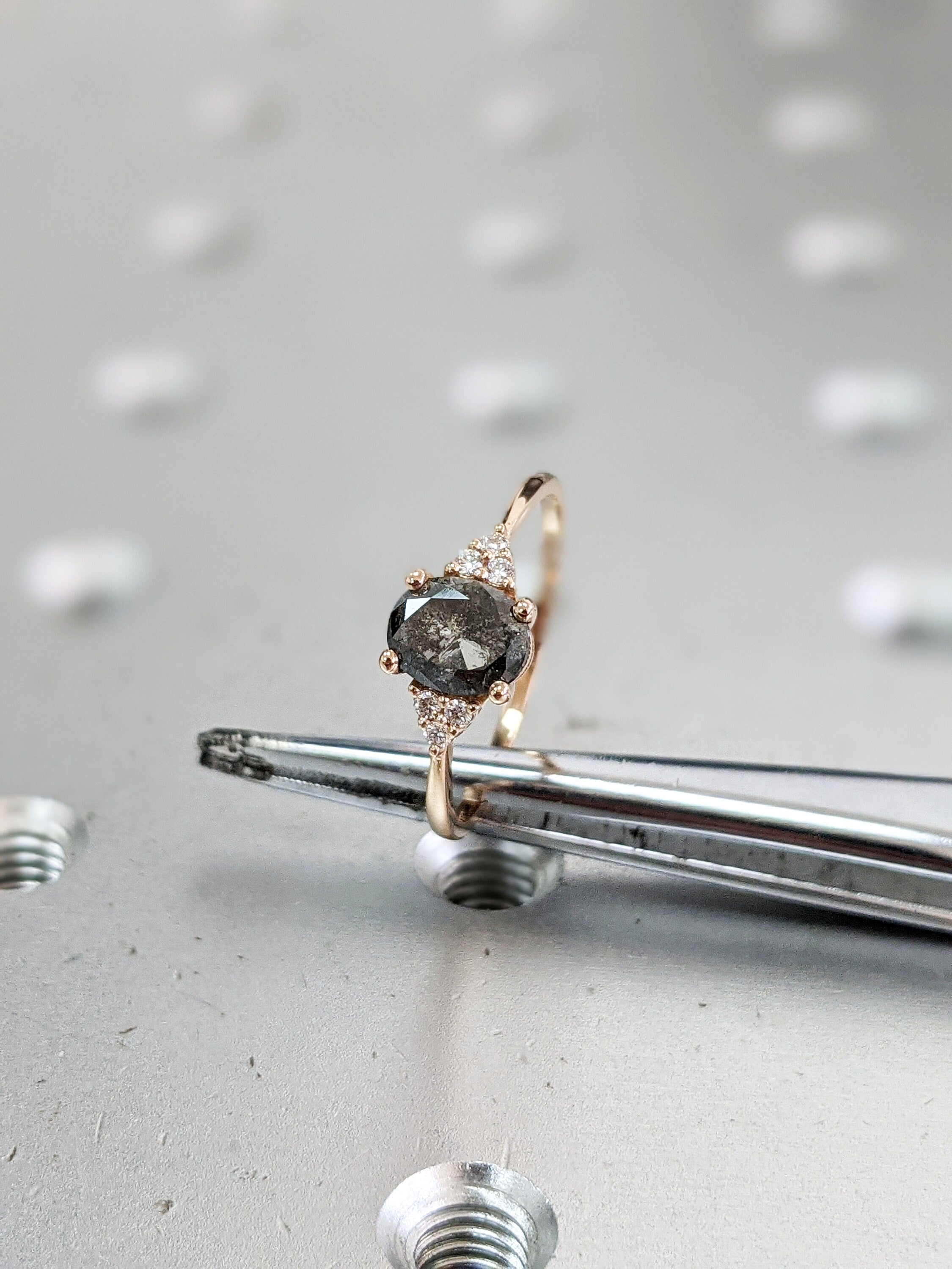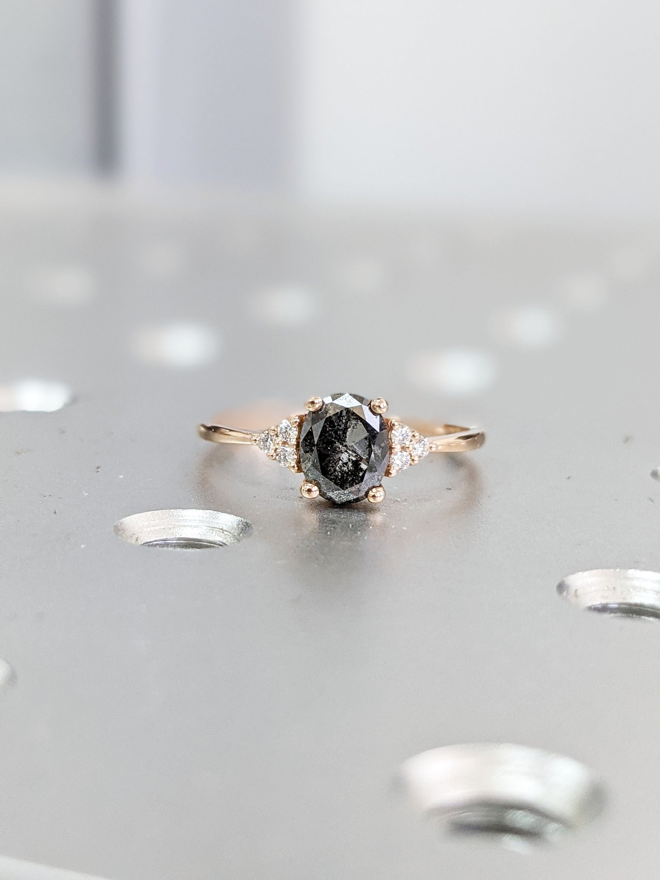 A cluster of 6 round brilliant cut diamonds, with brilliant sparkle and luster, accompany the center salt and pepper diamond, with a oval cut diamond, that gives a strong presence of vintage scent. This beautiful ring is made to order from hand selected and cut