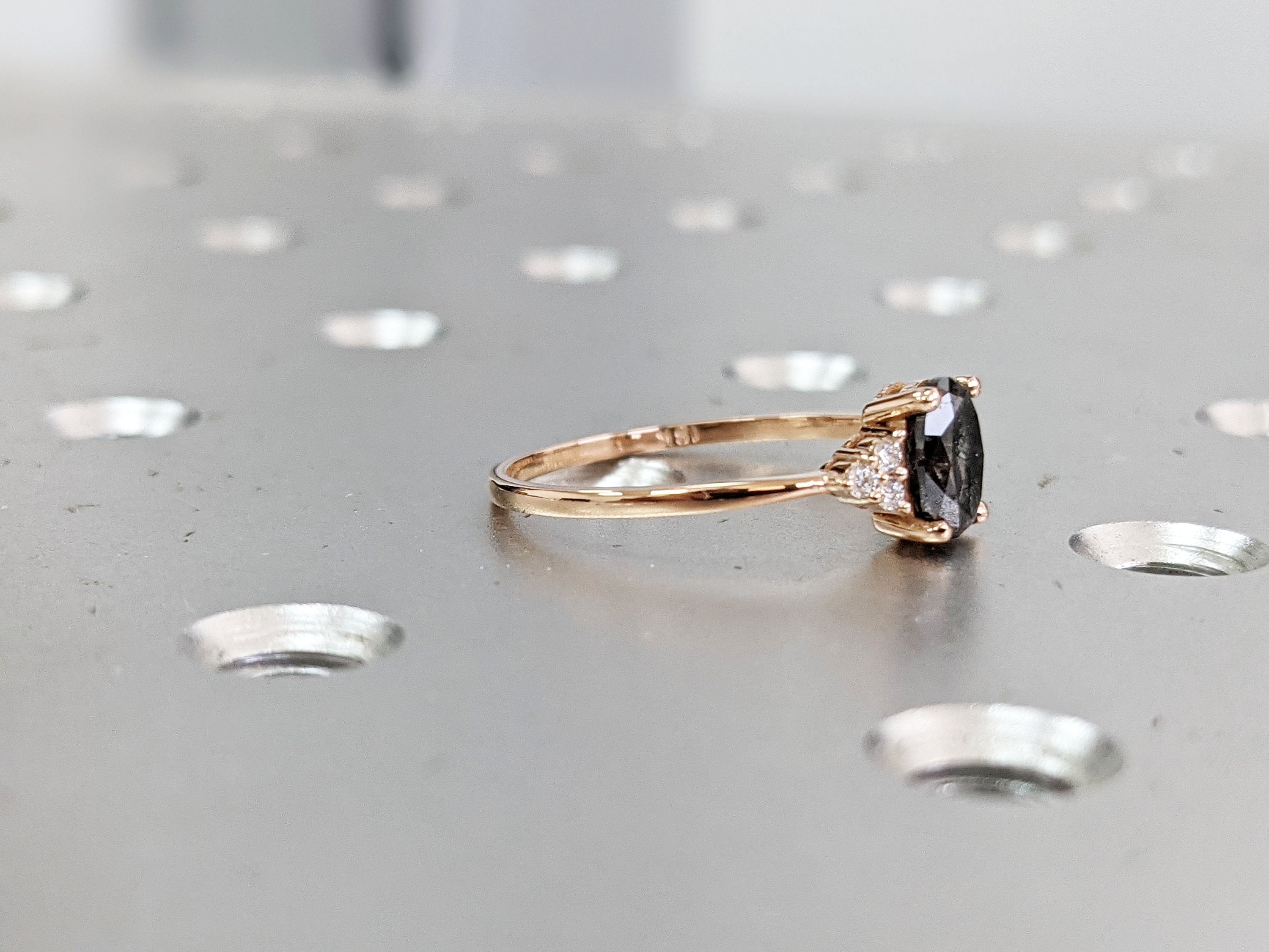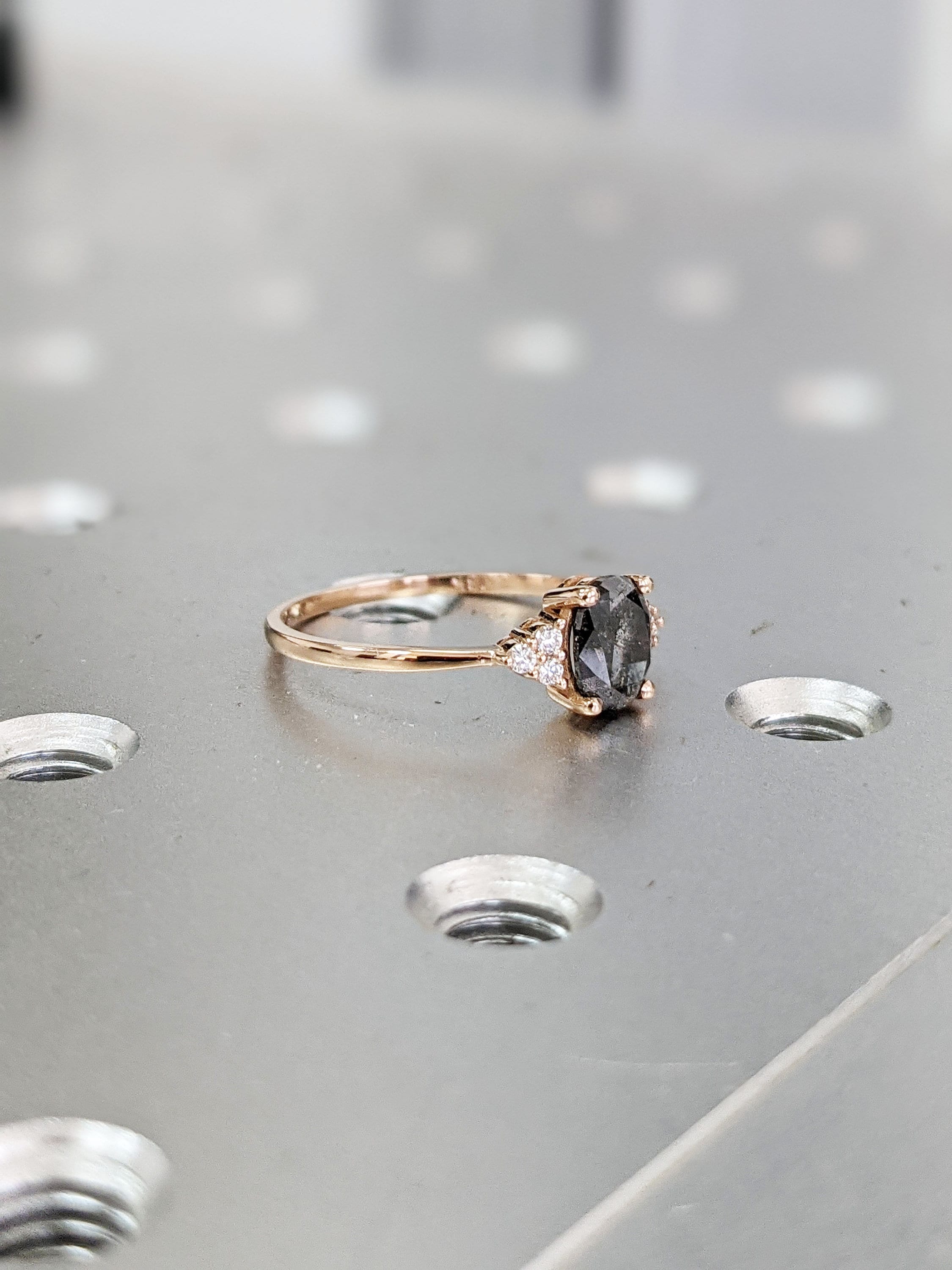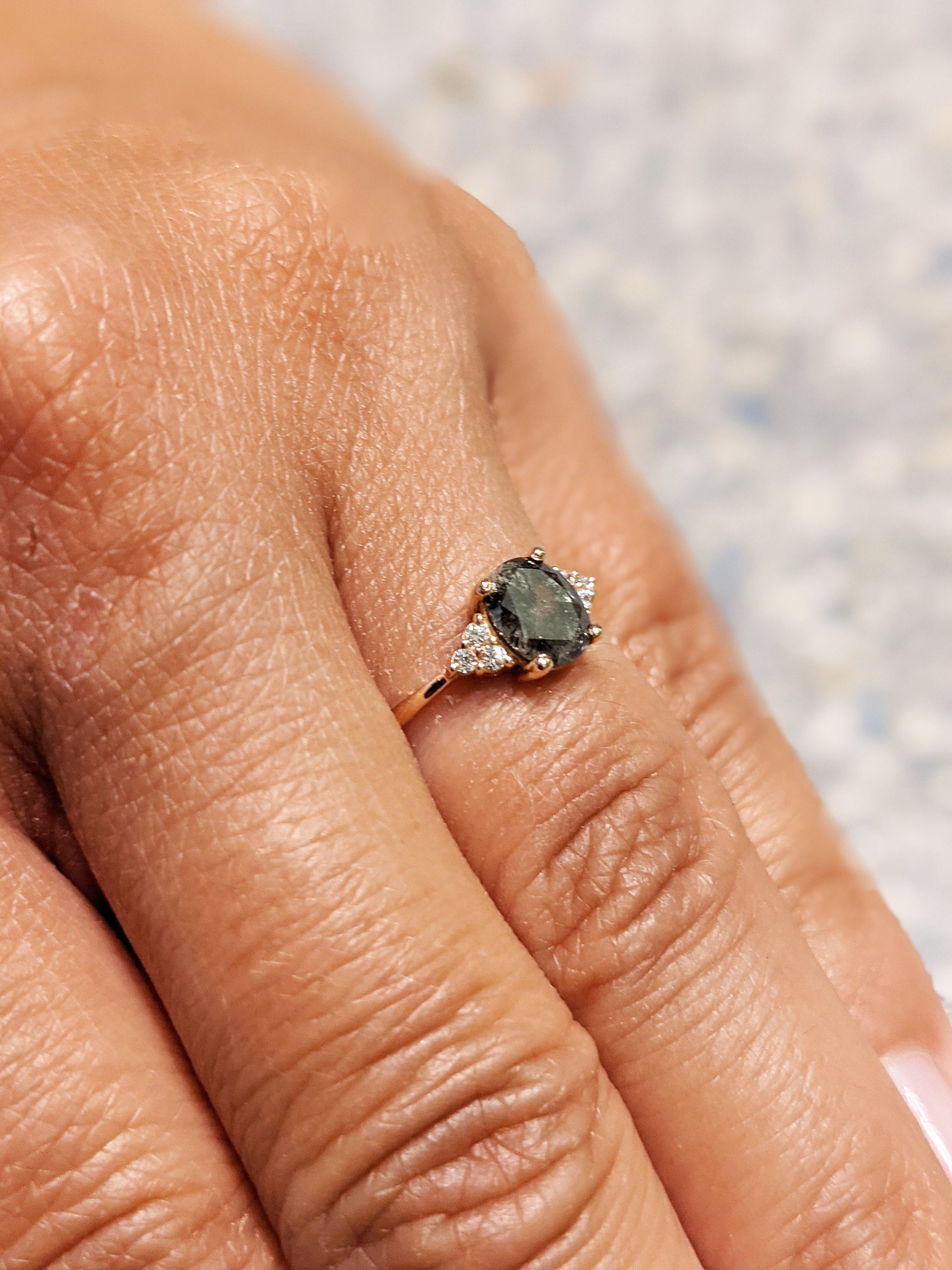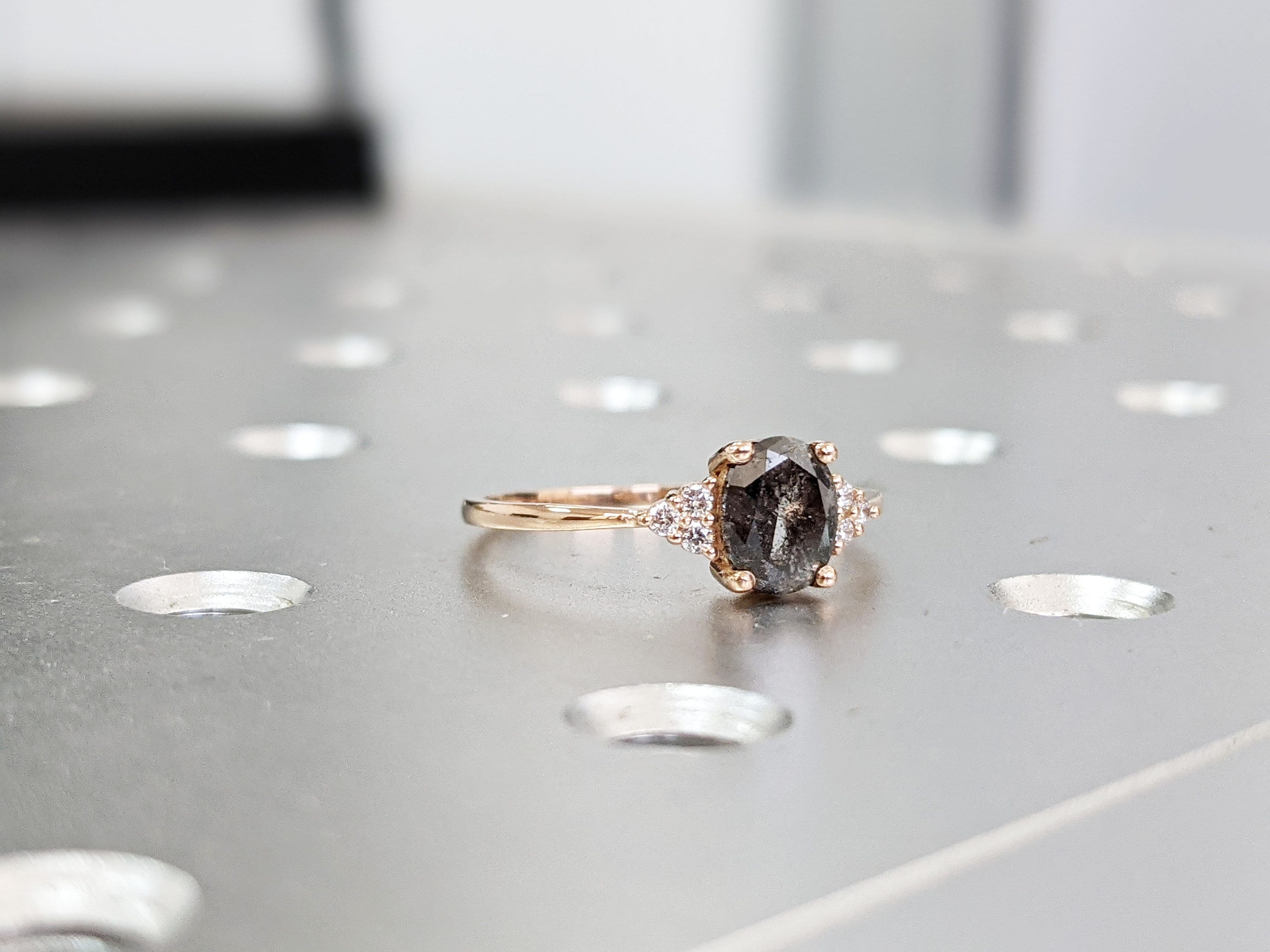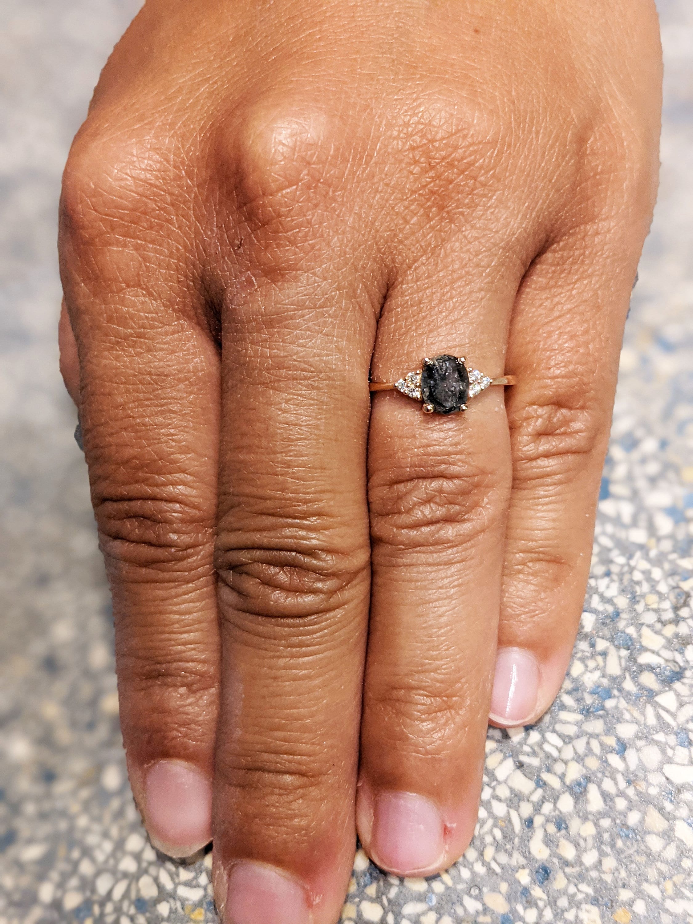 A cluster of 6 round brilliant cut diamonds, with brilliant sparkle and luster, accompany the center salt and pepper diamond, with a oval cut diamond, that gives a strong presence of vintage scent. This beautiful ring is made to order from hand selected and cut