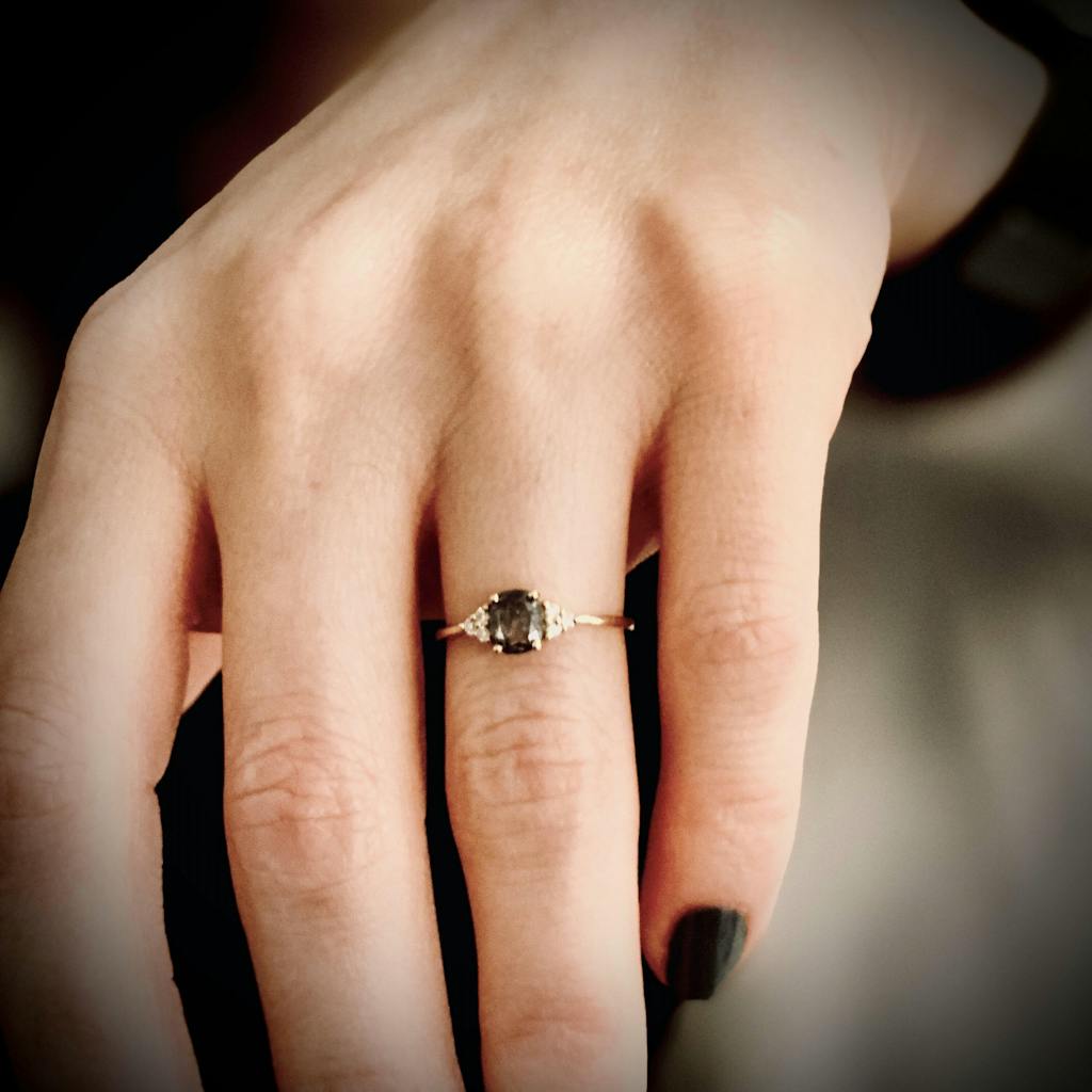 A cluster of 6 round brilliant cut diamonds, with brilliant sparkle and luster, accompany the center salt and pepper diamond, with a oval cut diamond, that gives a strong presence of vintage scent. This beautiful ring is made to order from hand selected and cut