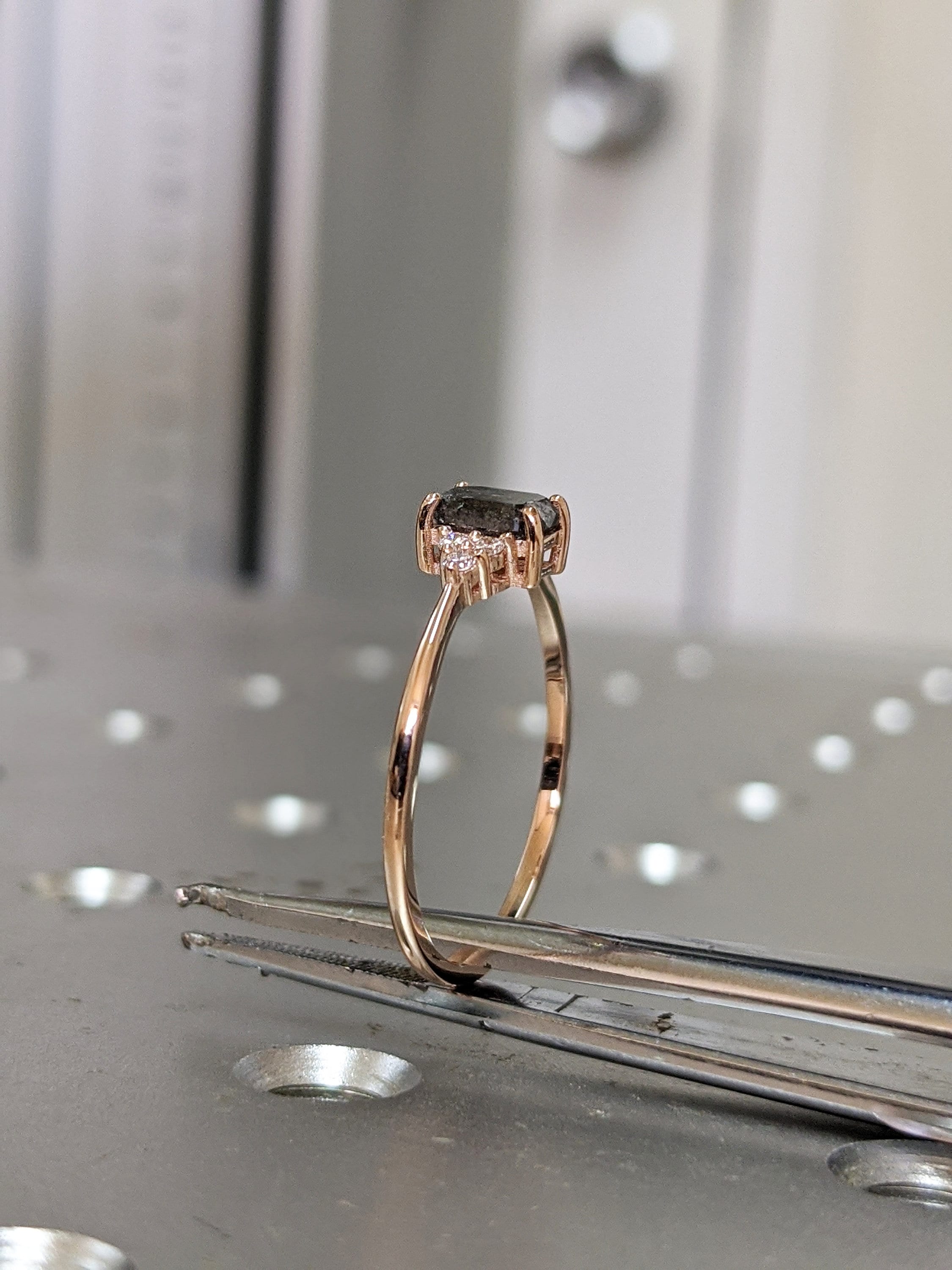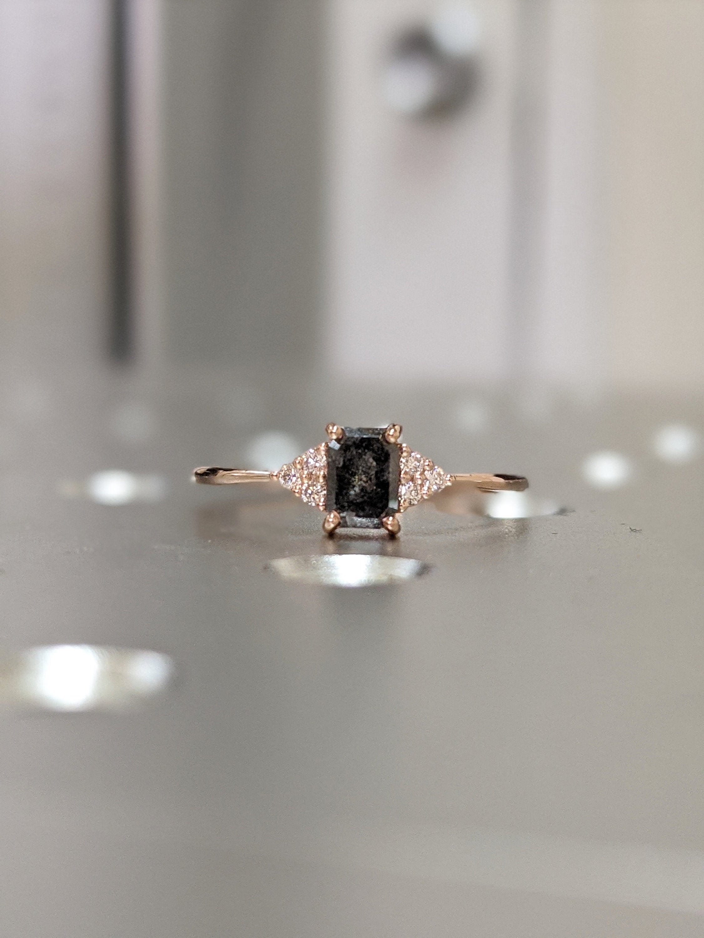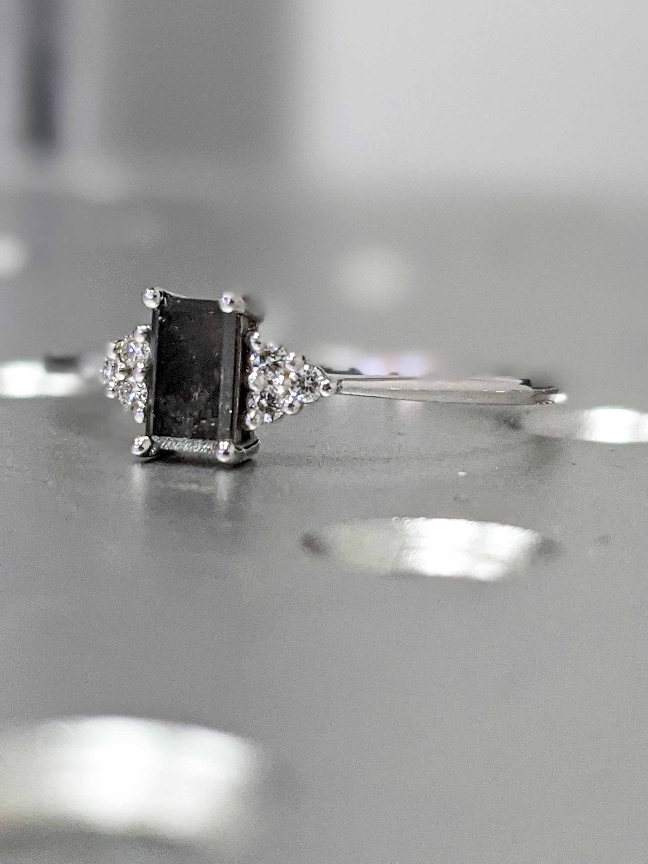 A cluster of 6 round brilliant cut diamonds, with brilliant sparkle and luster, accompany the center salt and pepper diamond, with a baguette/emerald cut, that gives a strong presence of vintage scent. This beautiful ring is made to order from hand selected and cut