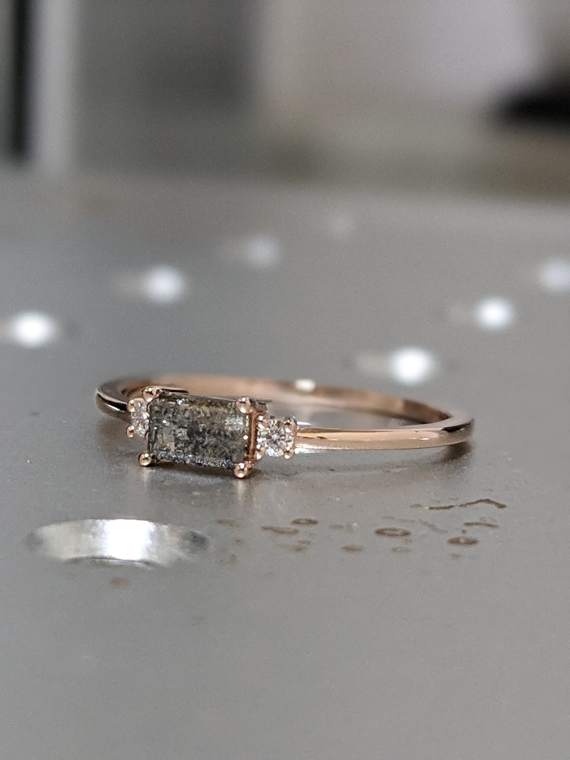 A stunningly beautiful vintage inspired design, petite band with a baguette or emerald cut Salt & Pepper diamond, adorned by 2 beautiful diamonds to contrast the center diamond.