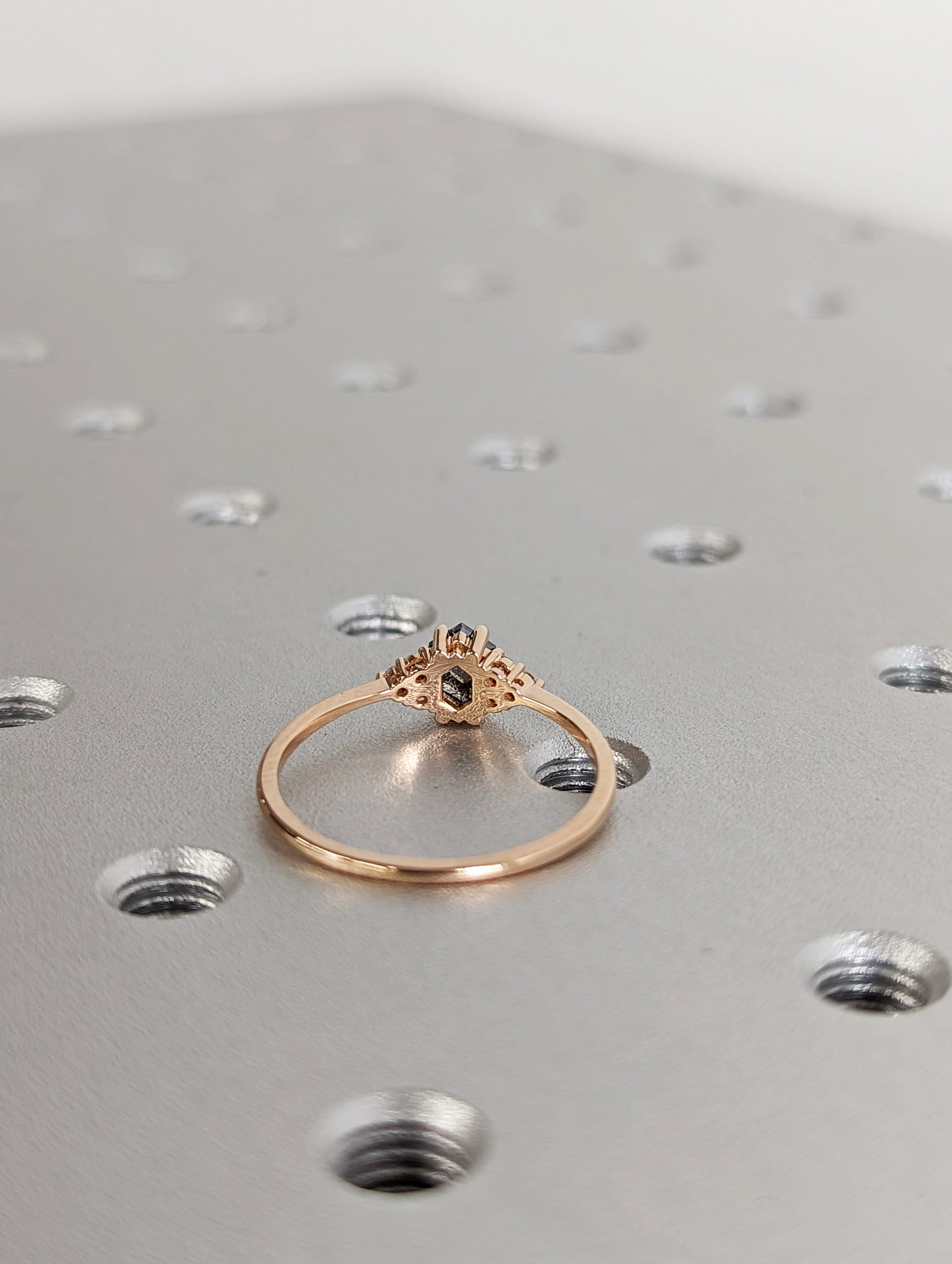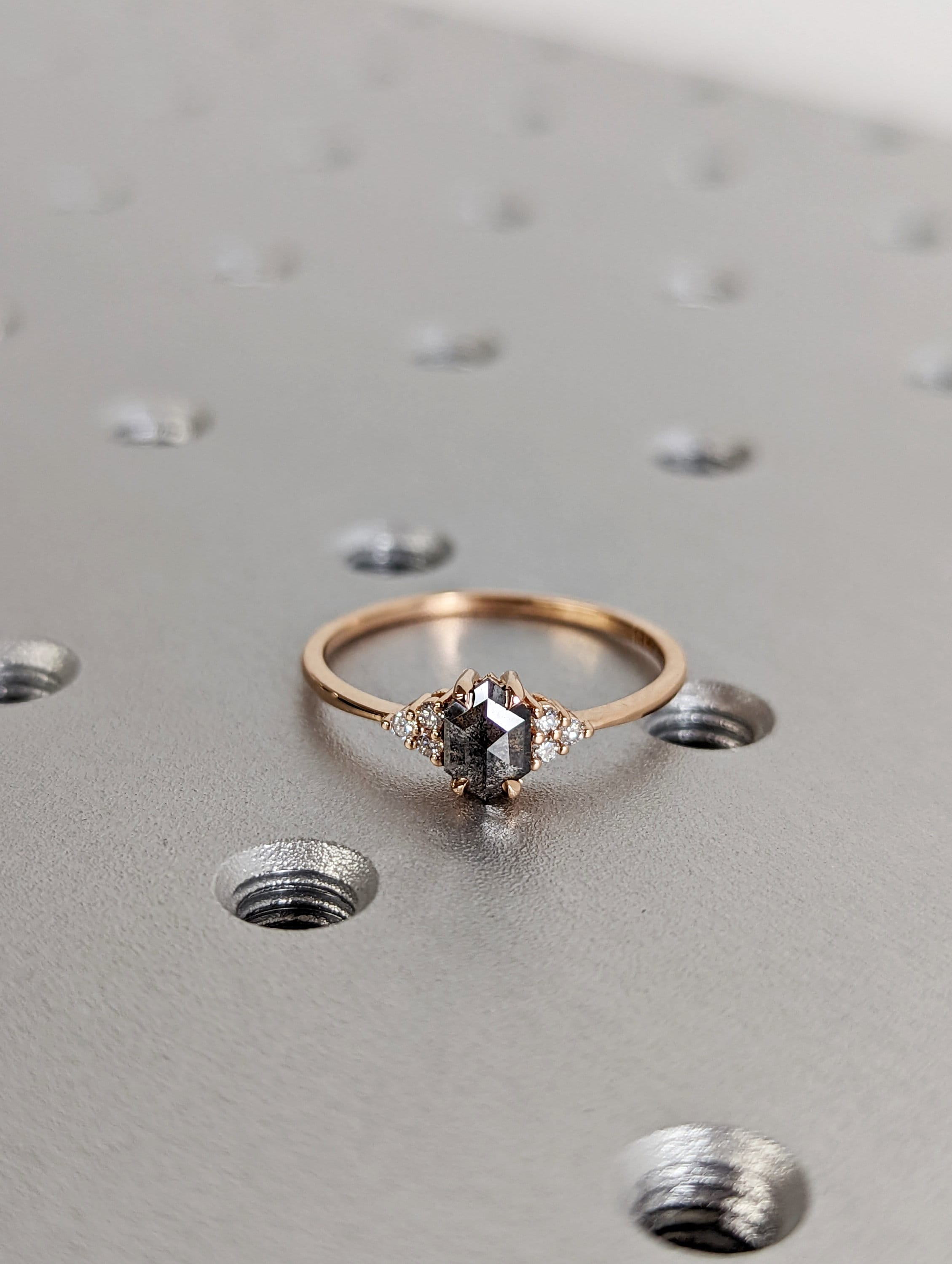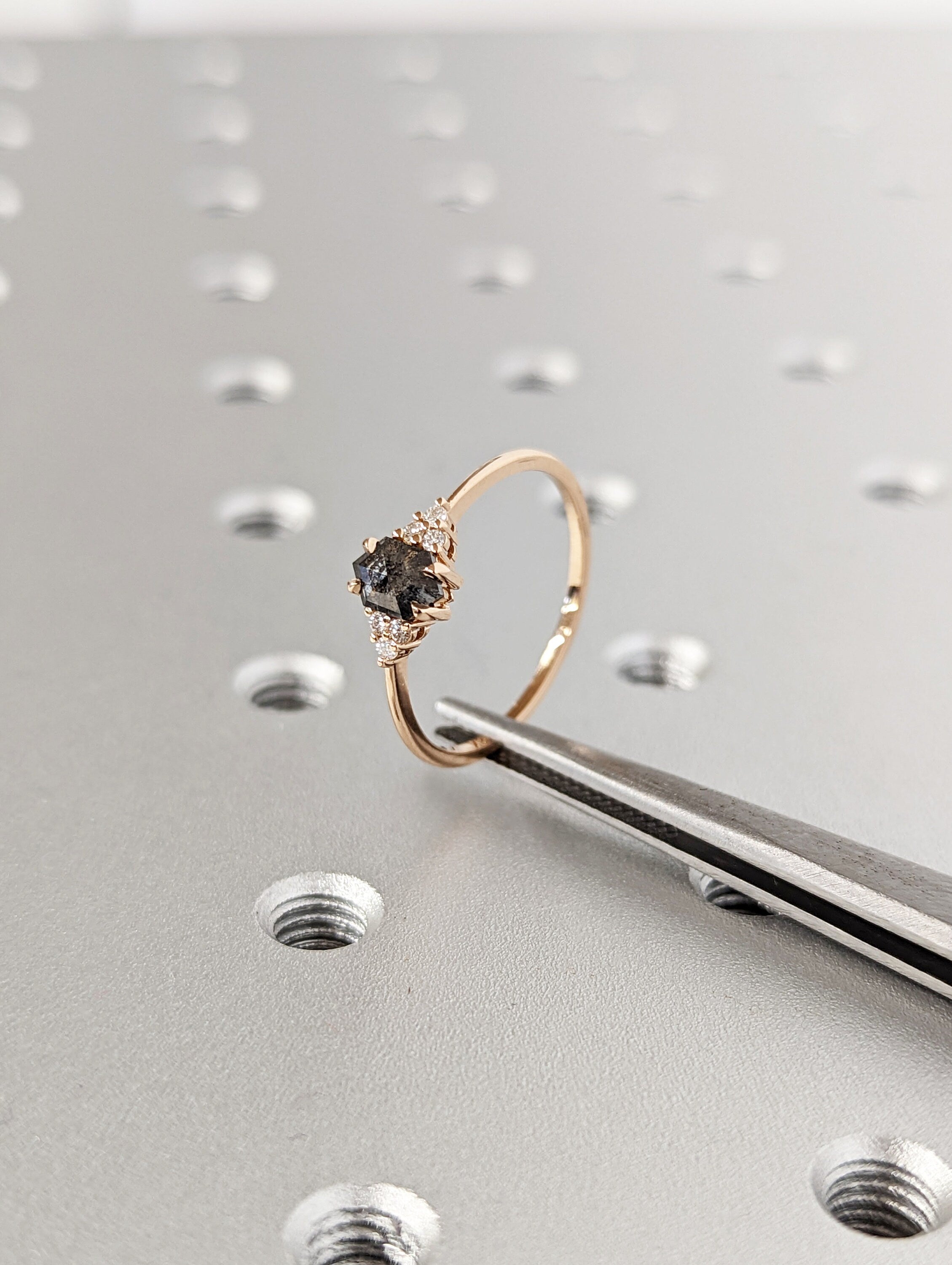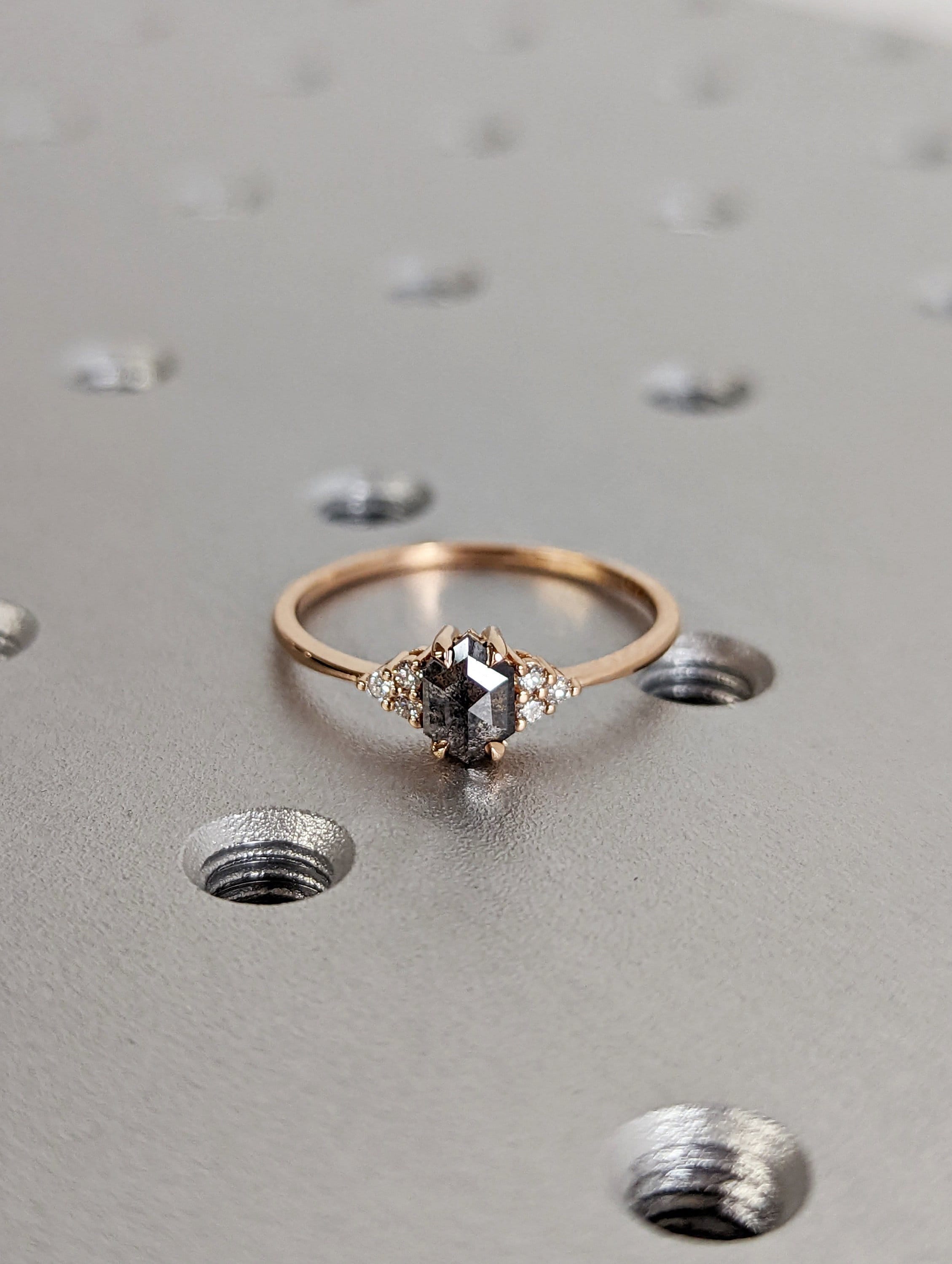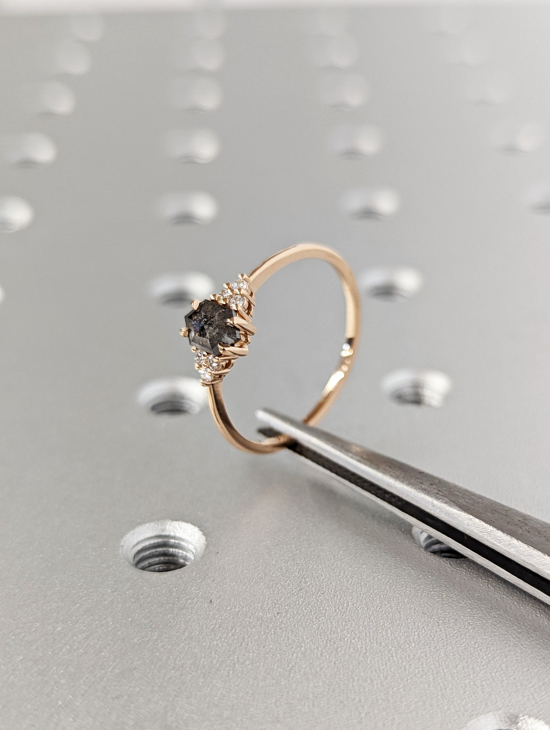 A cluster of 6 round brilliant cut diamonds, with brilliant sparkle and luster, accompany the center salt and pepper diamond, with a hexagon cut, that gives a strong presence of vintage scent. This beautiful ring is made to order from hand selected and cut