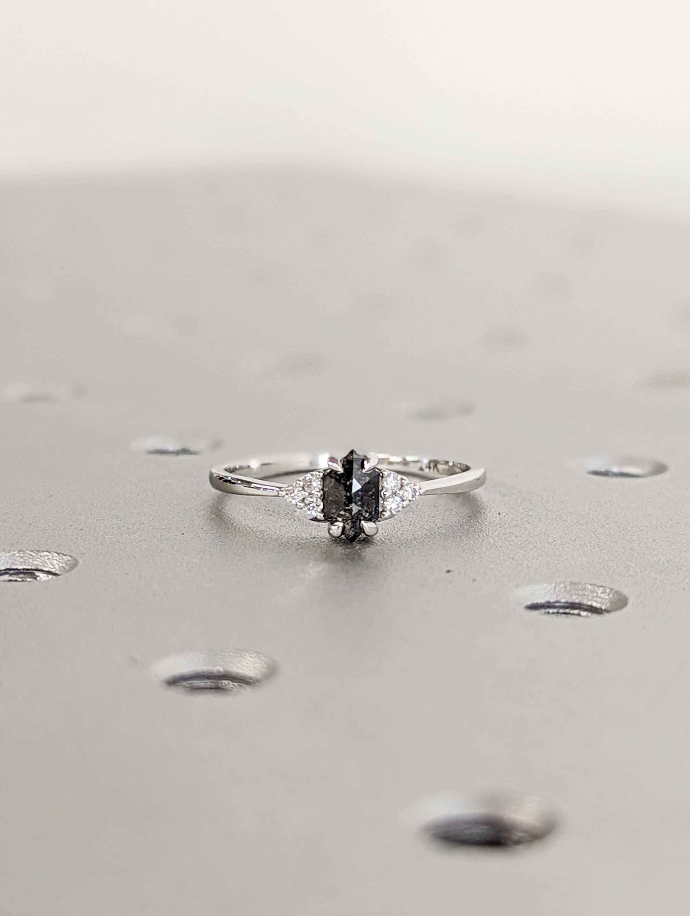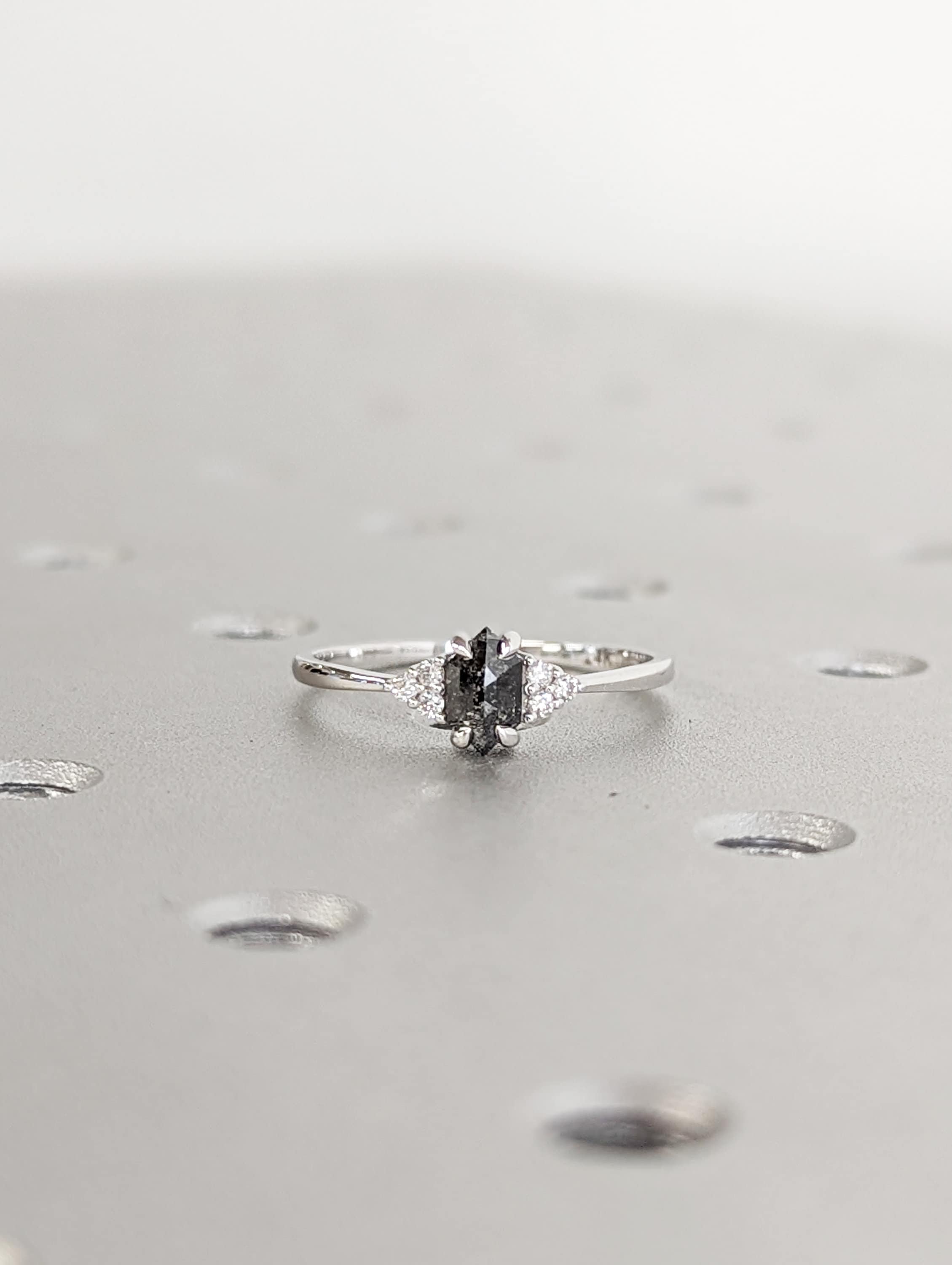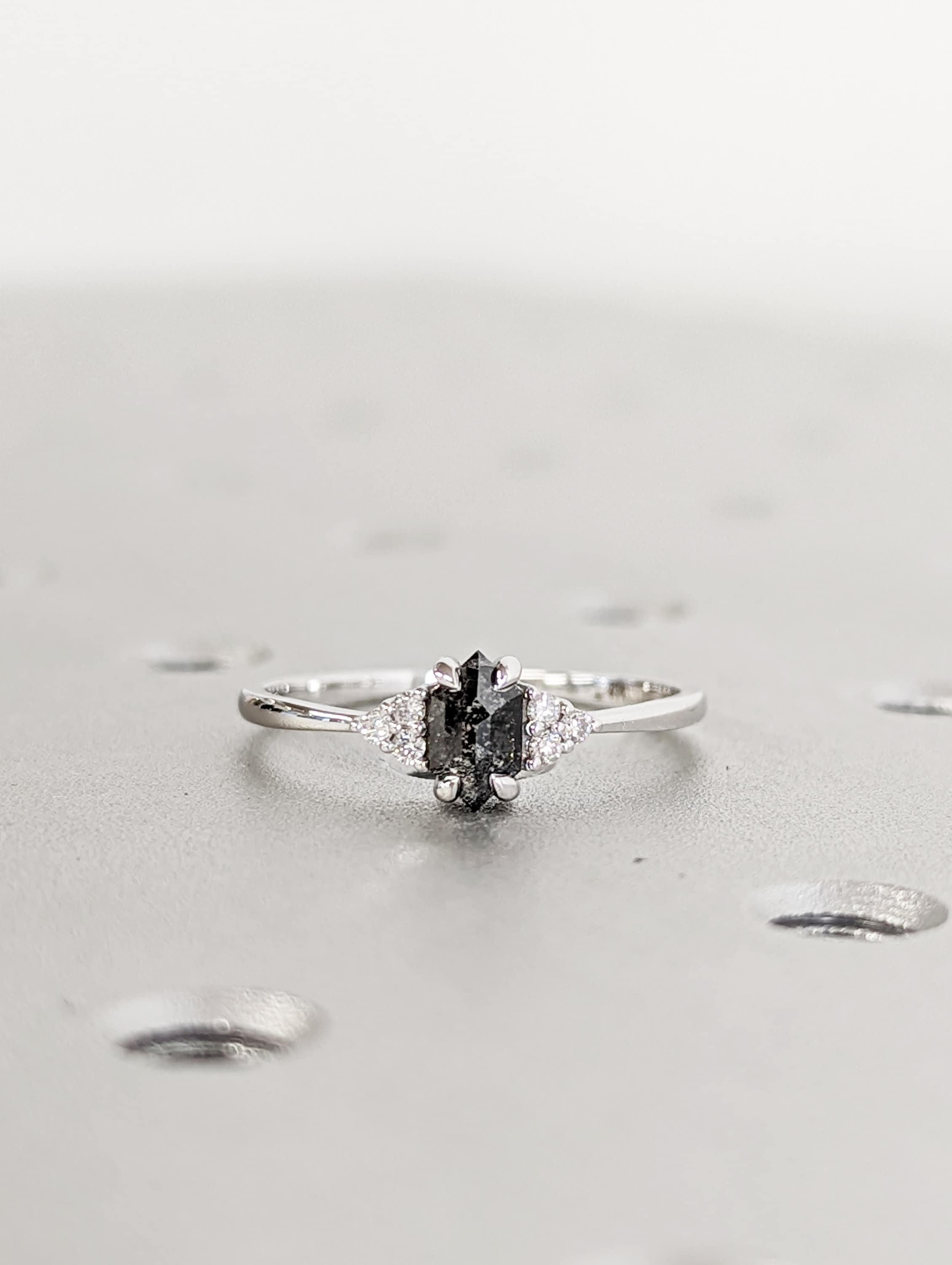 A cluster of 6 round brilliant cut diamonds, with brilliant sparkle and luster, accompany the center salt and pepper diamond, with a hexagon cut, that gives a strong presence of vintage scent. This beautiful ring is made to order from hand selected and cut