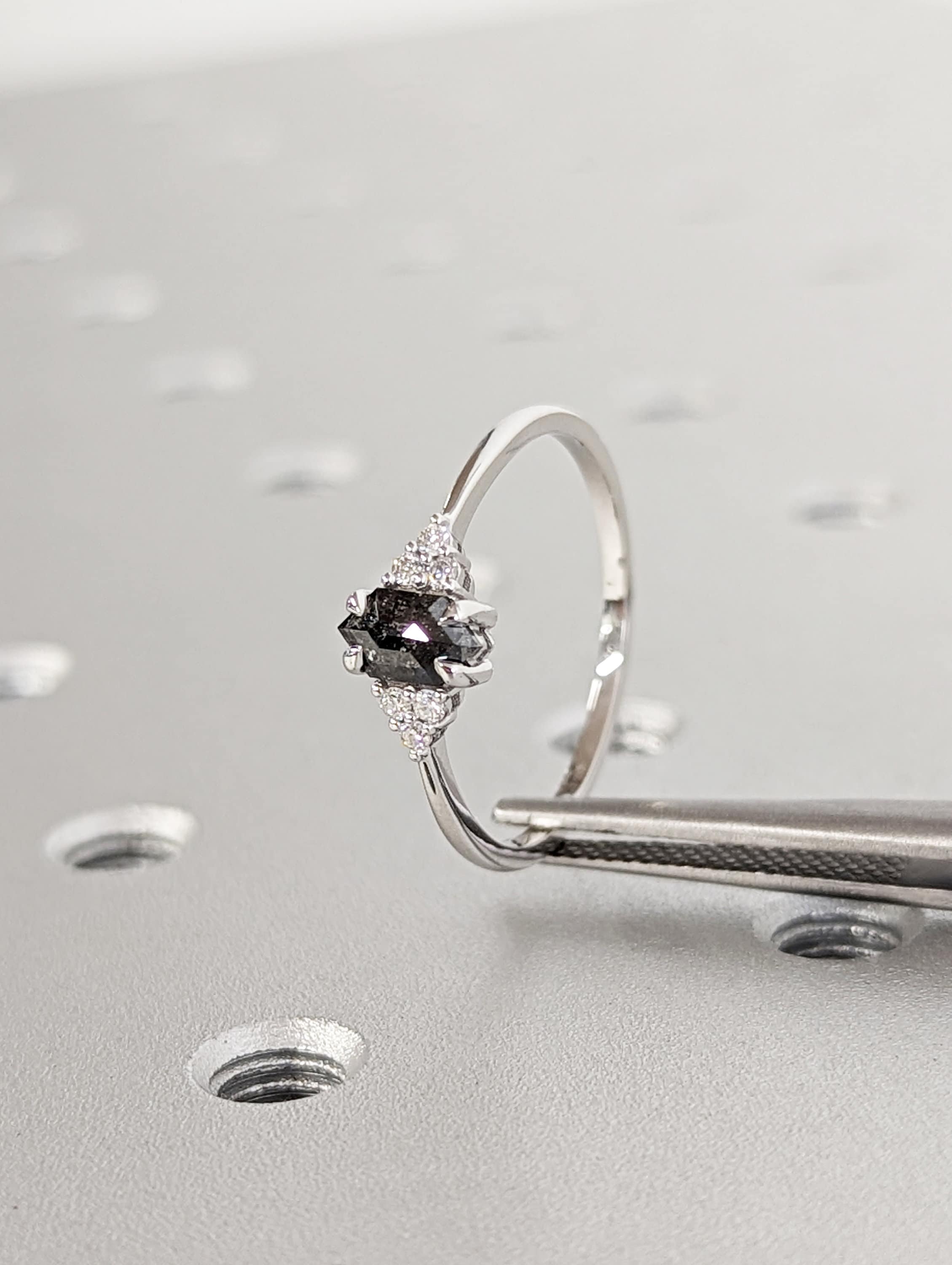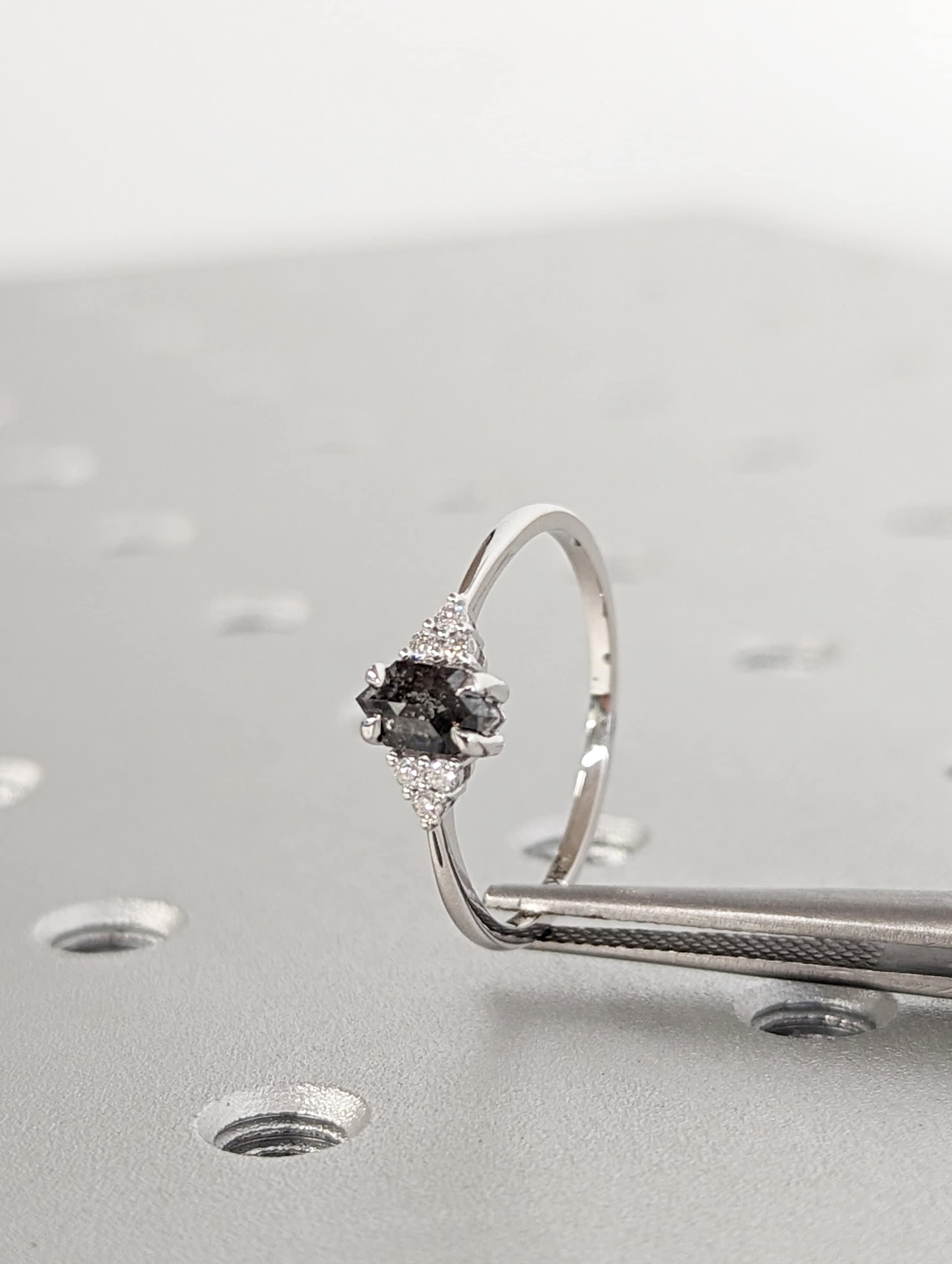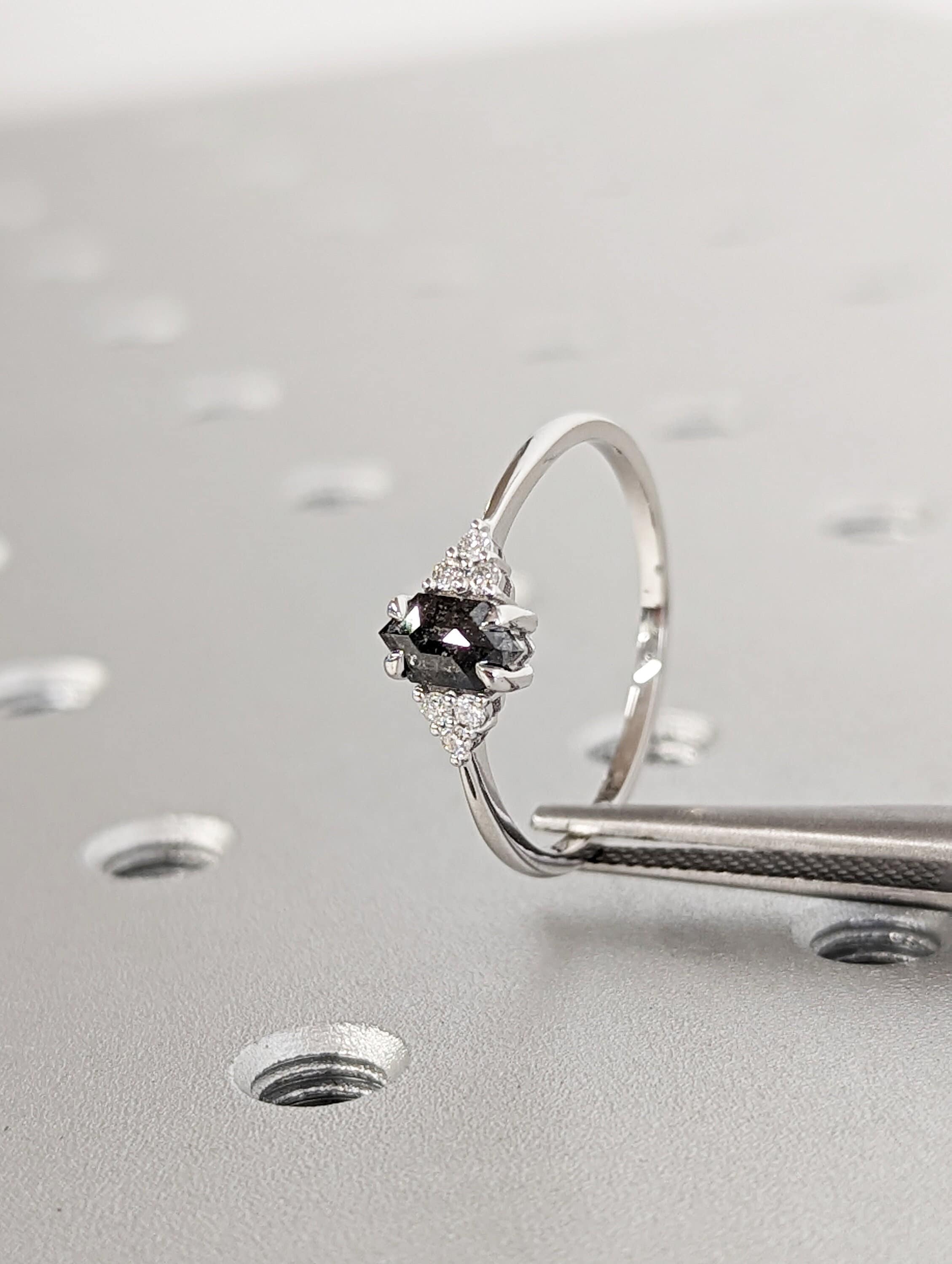 A cluster of 6 round brilliant cut diamonds, with brilliant sparkle and luster, accompany the center salt and pepper diamond, with a hexagon cut, that gives a strong presence of vintage scent. This beautiful ring is made to order from hand selected and cut