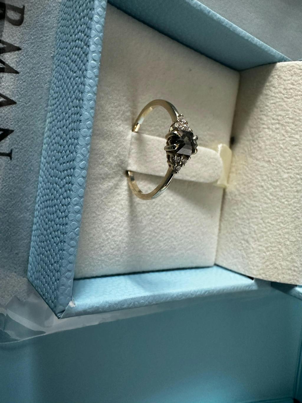 A cluster of 6 round brilliant cut diamonds, with brilliant sparkle and luster, accompany the center salt and pepper diamond, with a hexagon cut, that gives a strong presence of vintage scent. This beautiful ring is made to order from hand selected and cut