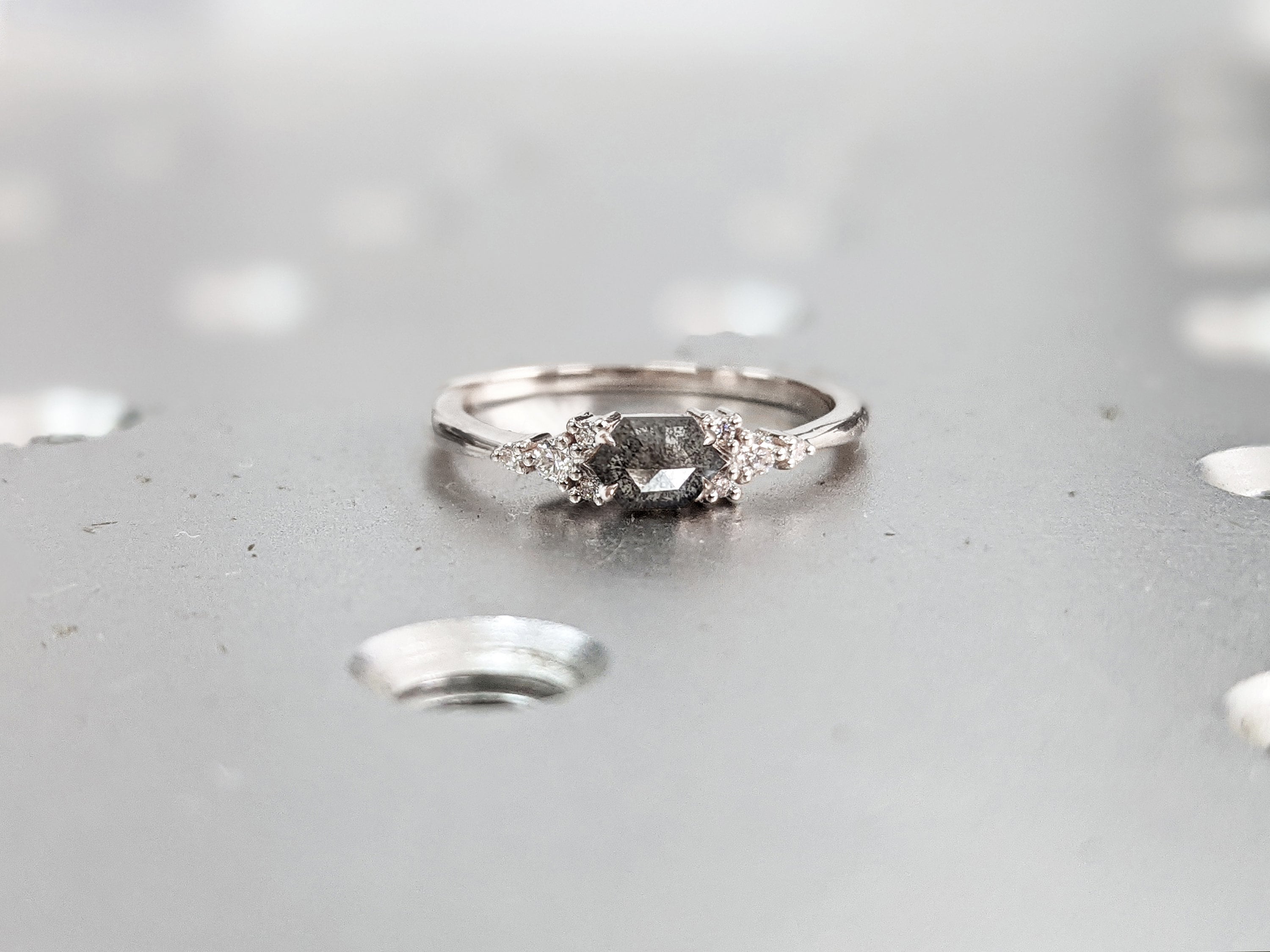 A stunningly beautiful vintage inspired design, petite band with a hexagon cut Salt & Pepper diamond, adorned by natural diamonds, or moissanites of your choosing :)