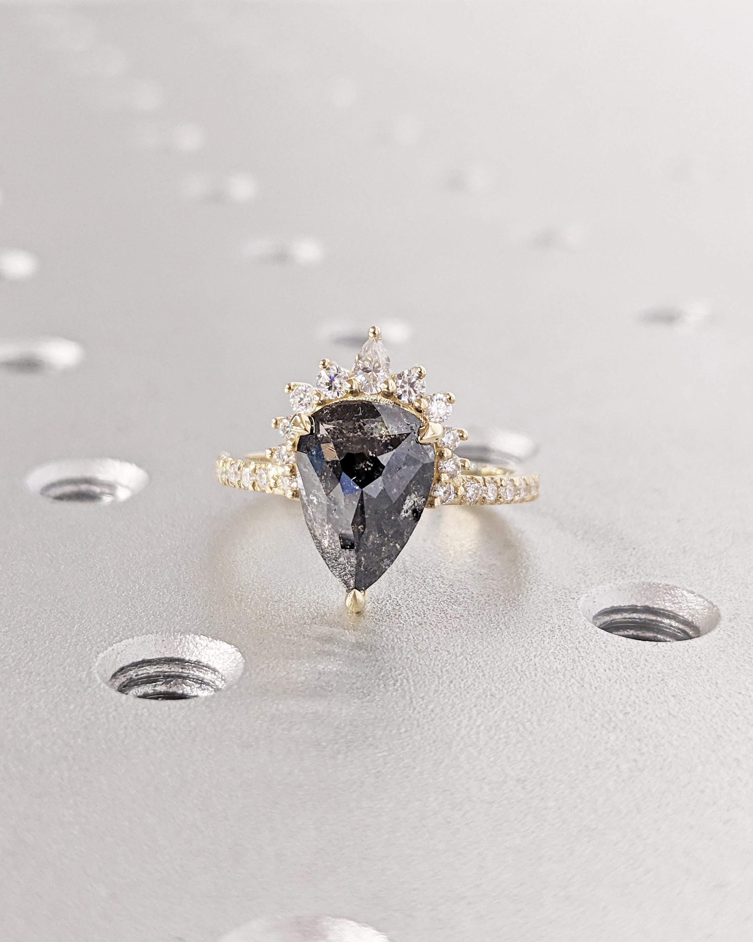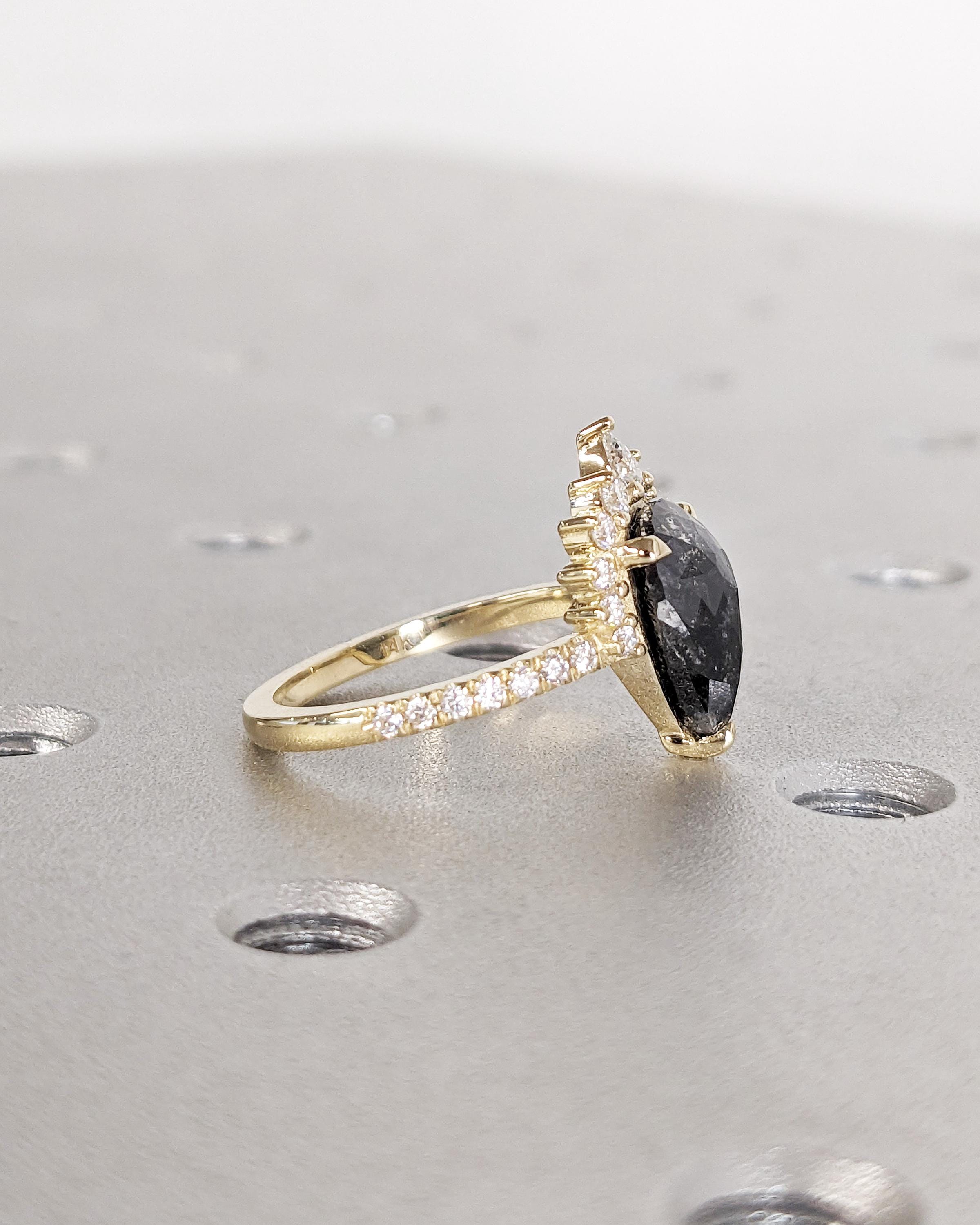Romantic and distinctive, a pear shaped salt and pepper diamond takes center stage in this vintage inspired engagement ring. Shimmering accent stones trace the curve of the pear, leading to a half-eternity pavé band that adds endless brilliance. Available with natural diamond, lab diamond, or moissanite accents.