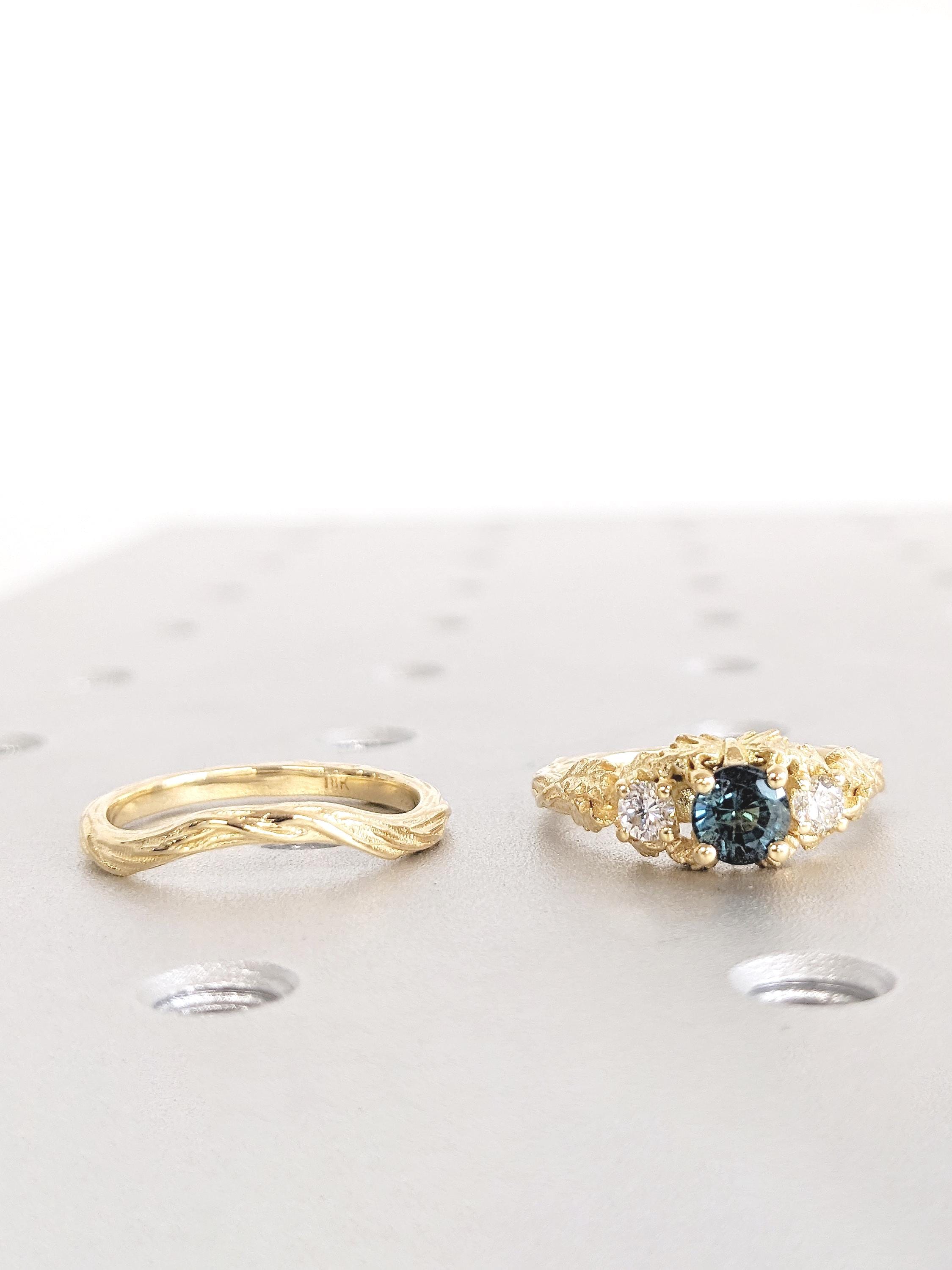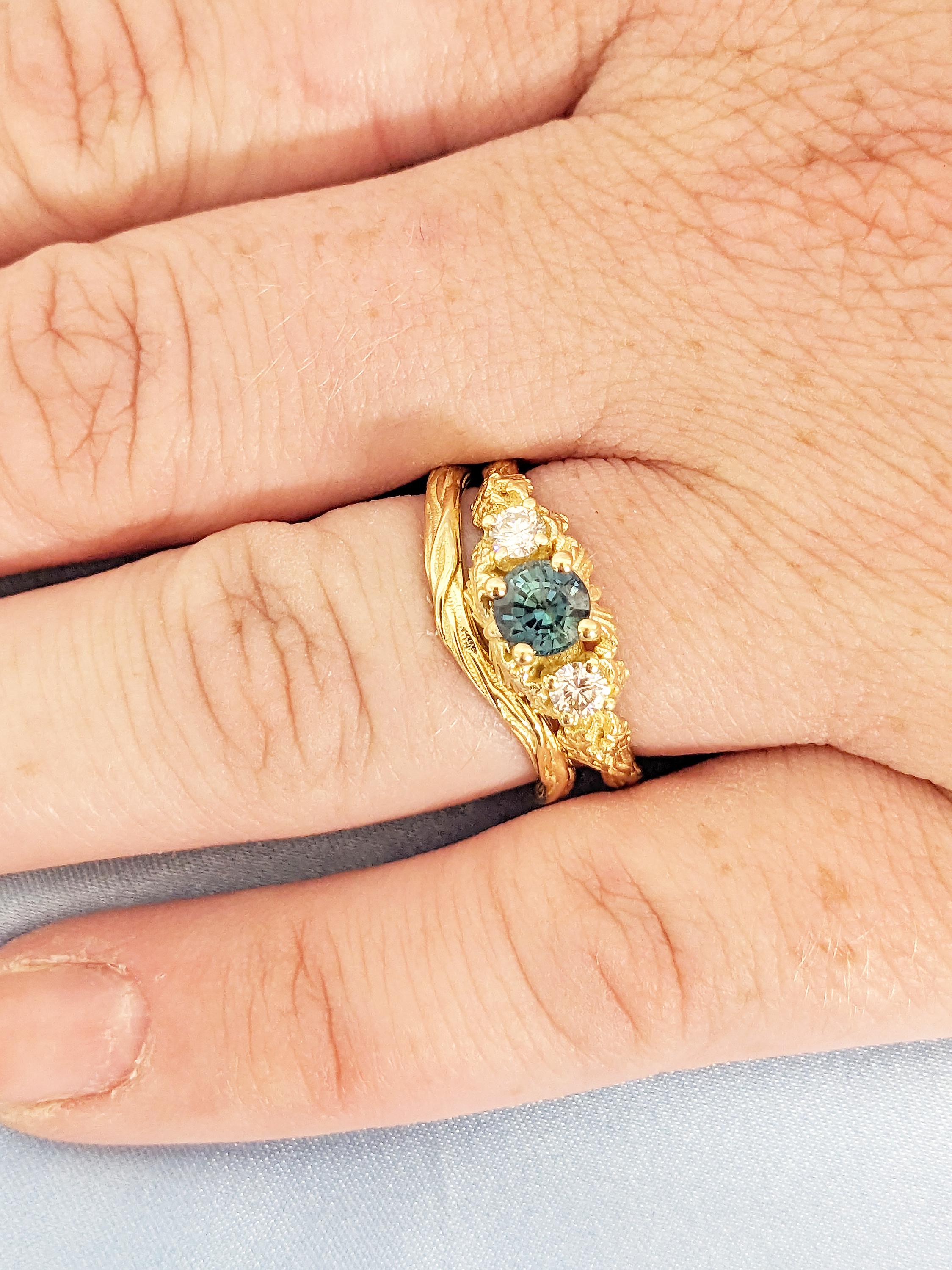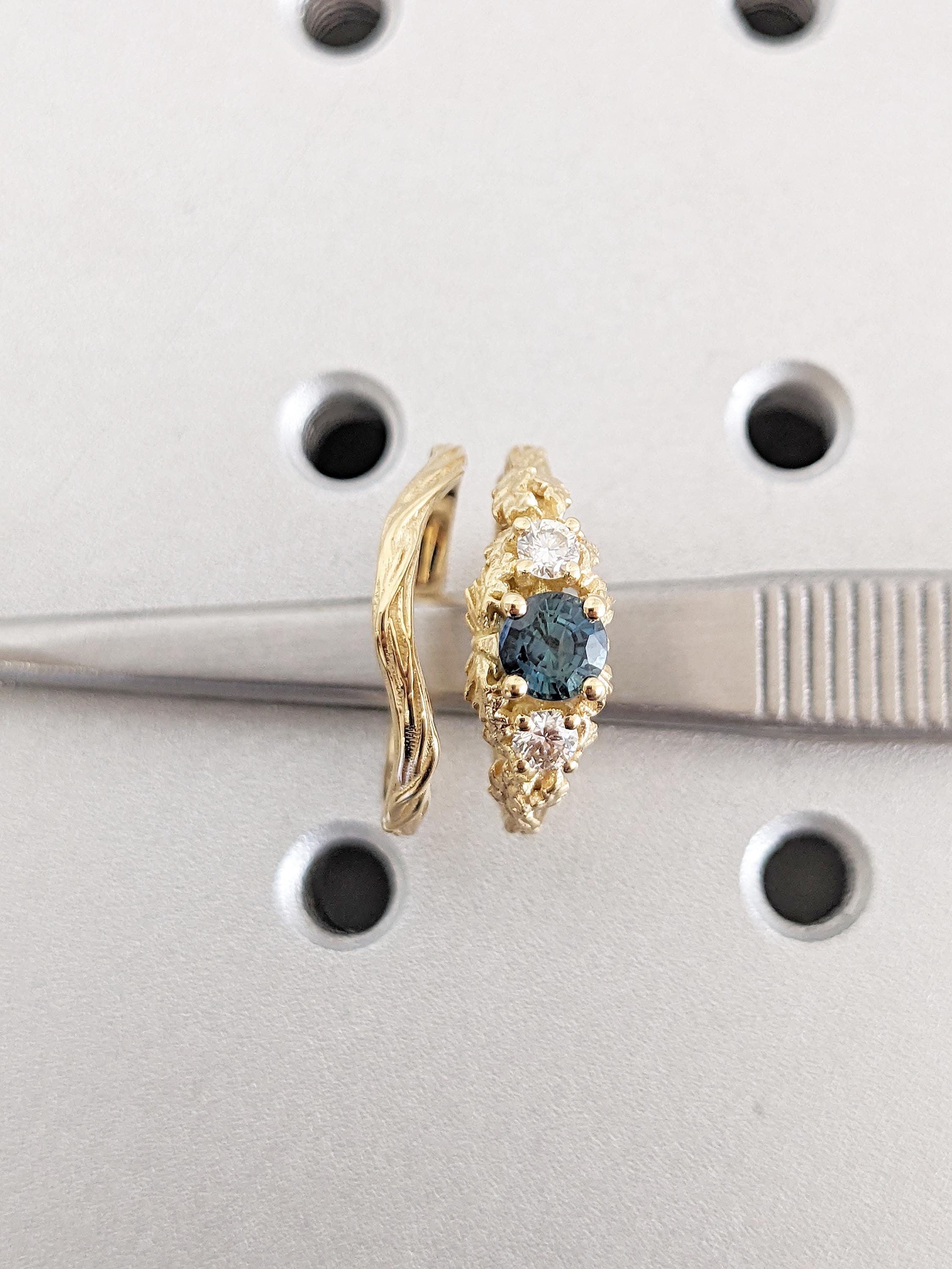 This enchanting bridal set features a round Peacock Sapphire at its center, flanked by lab grown diamonds nestled in a regal crown-inspired setting. An Intricate thistle leaf detailing wraps around the band, echoing the elegance of nature. Paired with a delicately curved matching band adorned with tree bark engravings, the set blends rustic charm and timeless sophistication in perfect harmony.