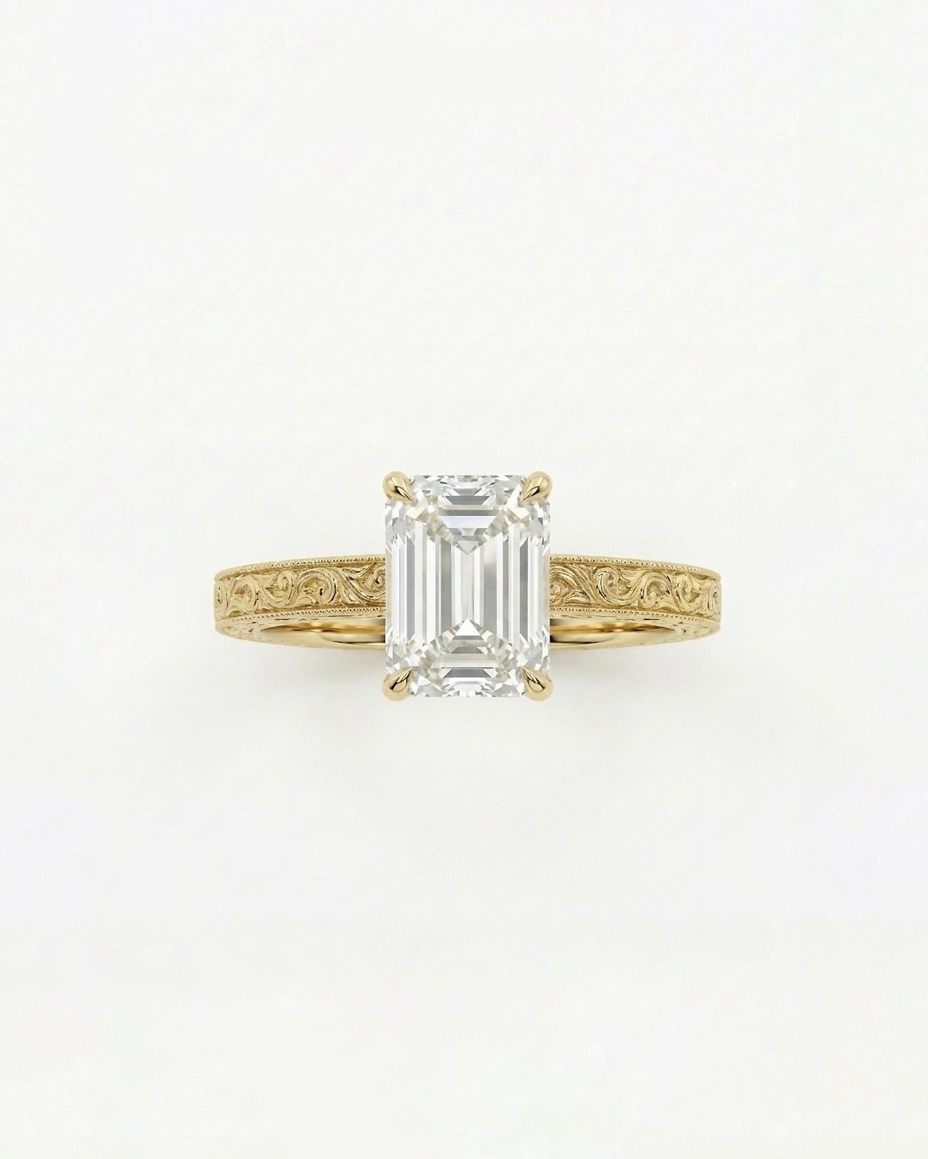 Vintage Style Emerald cut Lab Diamond Engagement Ring | 14k/18k Solid Gold Solitaire Ring | Filigree Wedding Band for Women